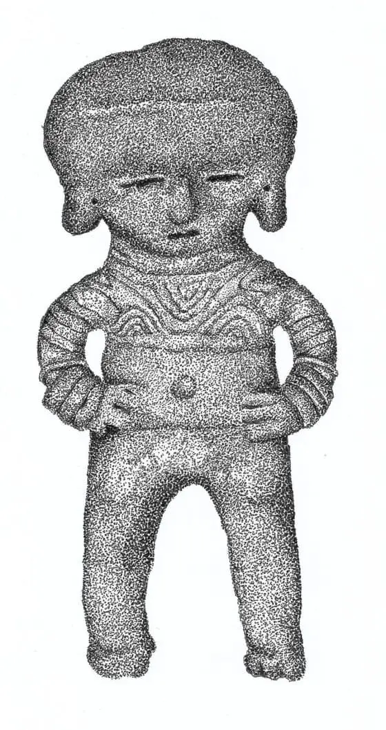 Figurilla antropomorfa. Cerámica hecha con la técnica de modelado, inciso, punzonado y pintura. Proviene de la colección Escuela Teresa Barba (REG-1671 PJ 201). Mide 21cm de altura por 10cm ancho. Fechada para la fase Llanitos (600 – 900d.C.). Figurilla antropomorfa parada con las manos sobre la cintura, presenta tocado y deformación craneal, tiene restos de pintura blanca y negra utilizada en la decoración corporal, hombros pechos y brazos se encuentran decorados con un diseño geométrico por medio de incisión, lleva tres brazaletes en cada muñeca. La figurilla tiene una depresión circular sobre el vientre que resalta el ombligo o el plexo solar.