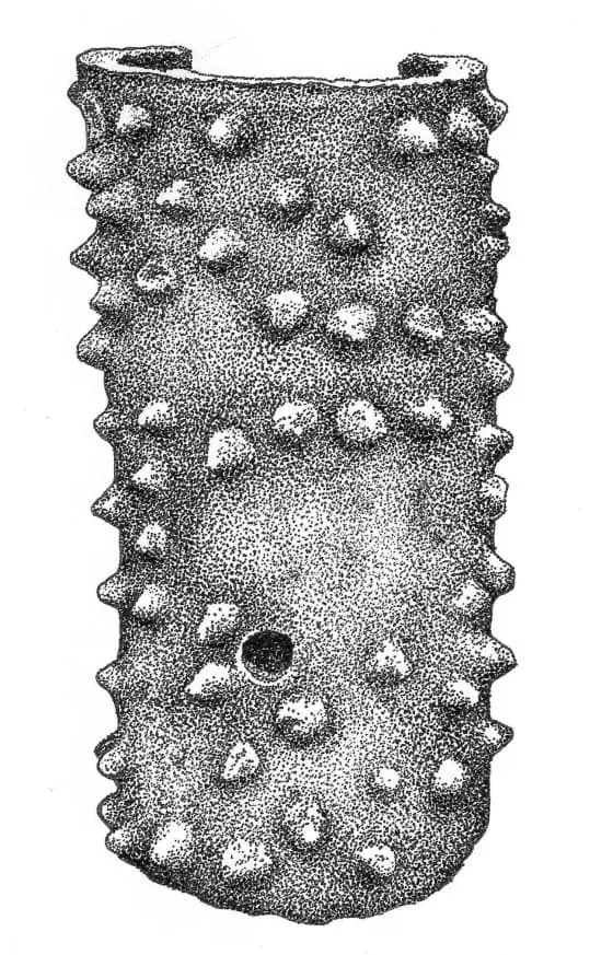 Bracero. Cerámica hecha con la técnica de barro enrolladoraspado y pastillaje. Mide 51.5 x 24.2 cm. Fue encontrado durante las excavaciones de la Estructura 5 de la Zona de Monumentos de Ixtapa (Mountjoy 2003: PV-1). Asociado a la fase Aztatlán (900 – 1200d.C.). Se caracteriza por las “espinas” en el exterior del bracero imitando a las del tronco del árbol avillo, pochote o la ceiba. La pieza es del color natural del barro café amarillento y se le aprecia un pequeño orificio en un costado para la ventilación interior. Cerámica de uso ritual.