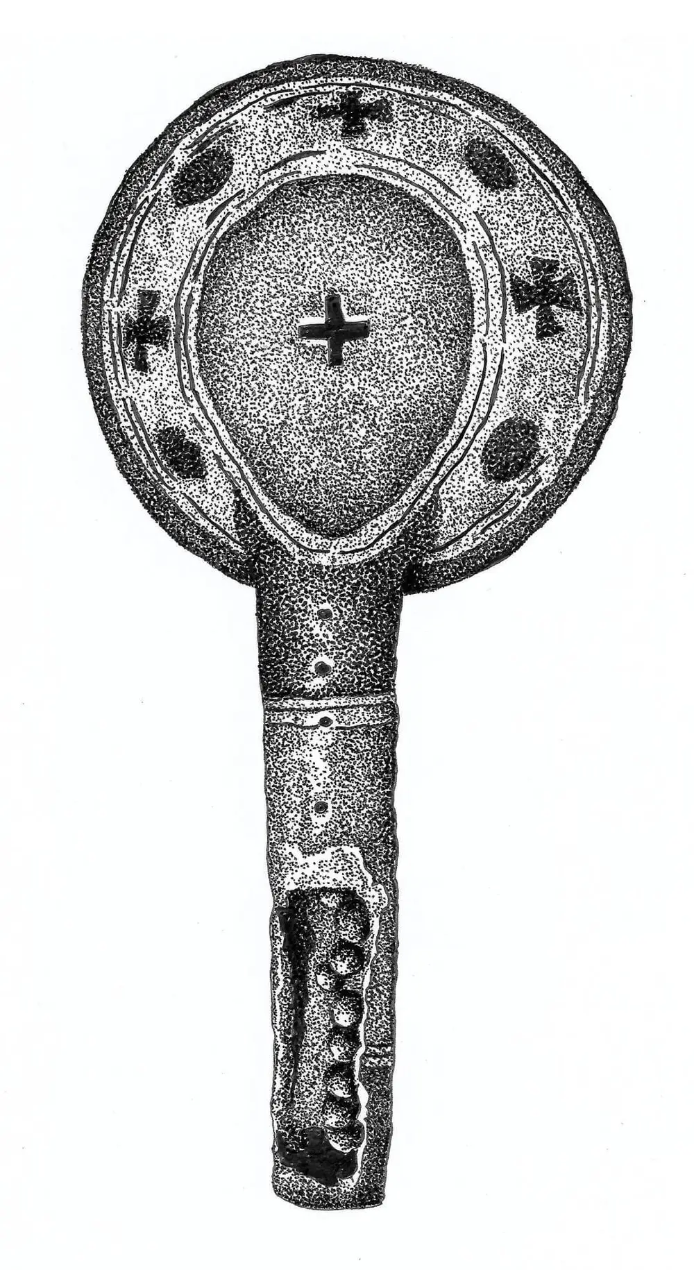 Sahumador sonaja. Vista inferior. El mango del sahumador tiene varias perforaciones pequeñas, está quebrado de su extremo donde se aprecia que es hueco y que contiene varios percutores de cerámica que lo hacen funcionar como sonaja. La parte inferior de la cazoleta presenta una decoración de pintura roja sobre bayo formando una banda con puntos y motivos de “cruces” que ha sido identificado como la Cruz de Quetzacóatl o el Quincunce. La parte inferior de la cazoleta tiene una perforación en forma de cruz par la ventilación.