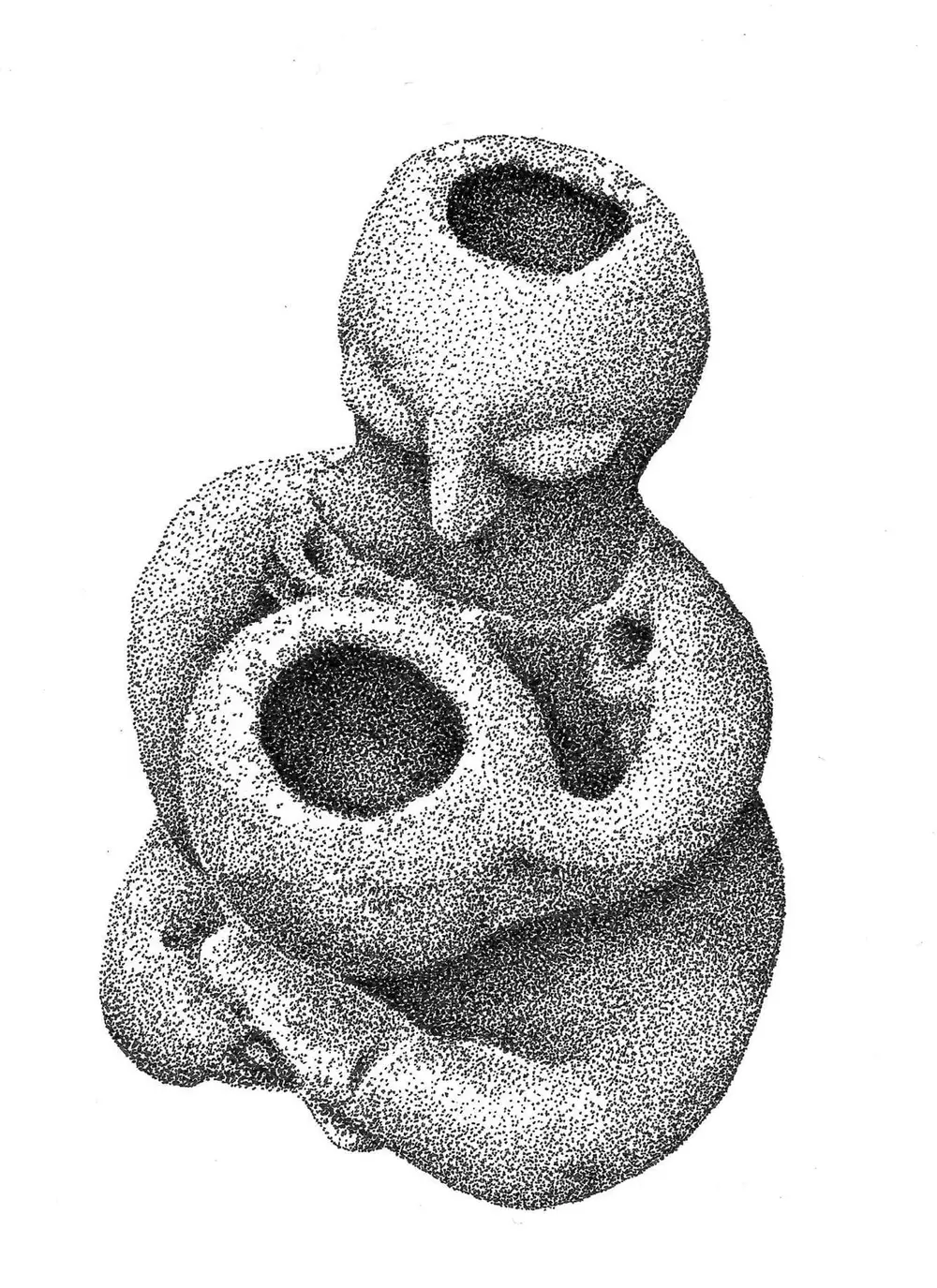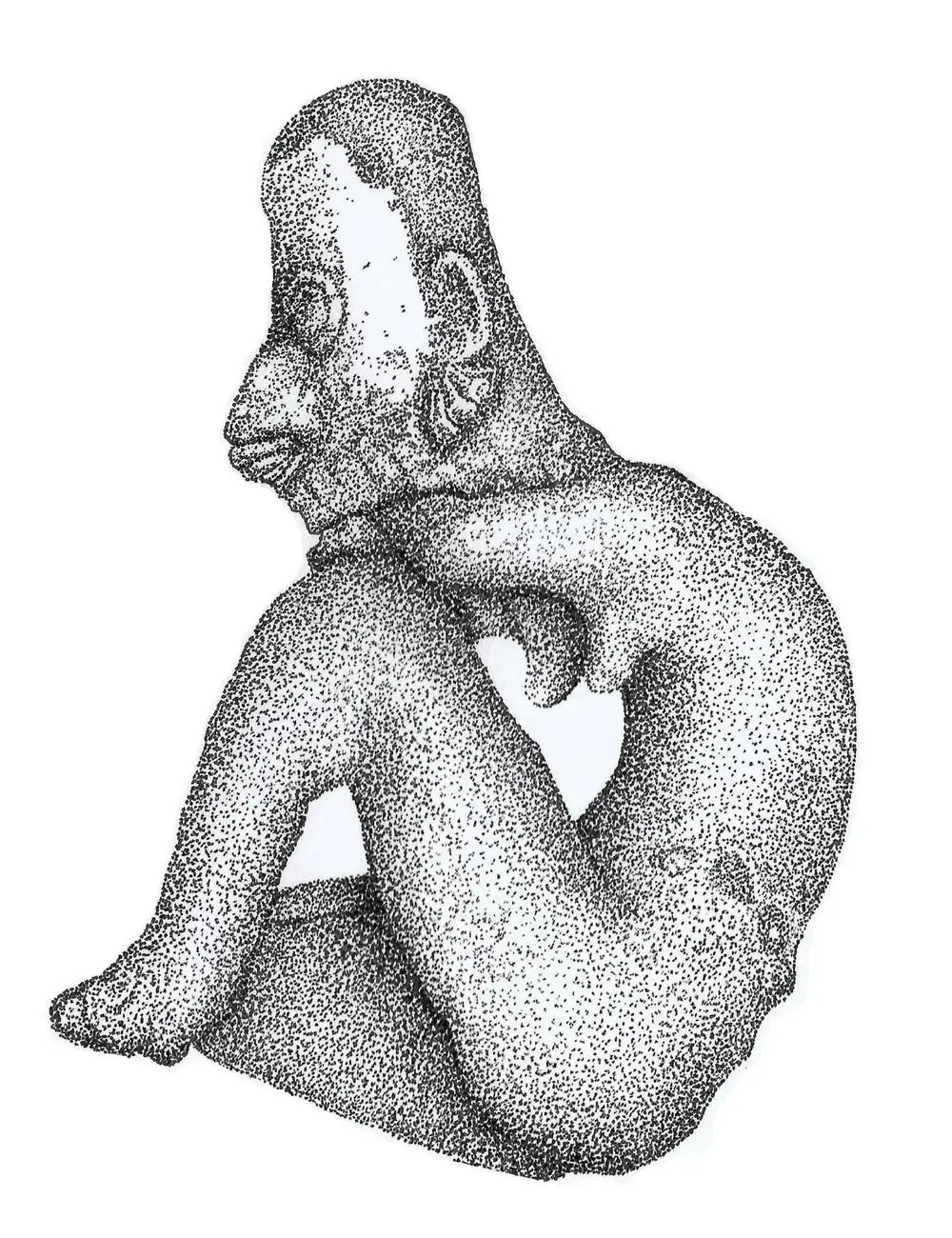 Figurilla hueca. Vista lateral. Encontrada en un contexto funerario. Figurilla femenina en forma sedente con la cabeza y los brazos recargados sobre la rodilla izquierda. Es muy notoria la deformación craneal y los adornos de concha que lleva sobre la nariz y la oreja (orejaras y narigueras). La figurilla está desnuda y solo porta cinturón y se aprecian restos de pintura facial y corporal.