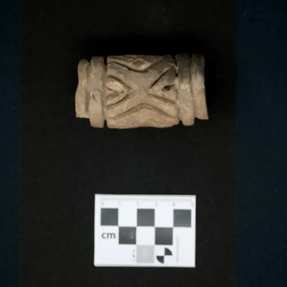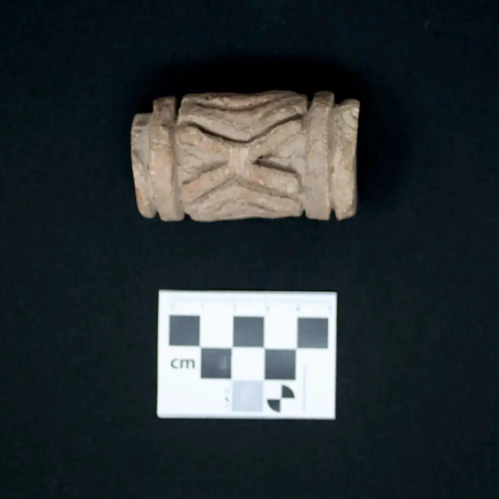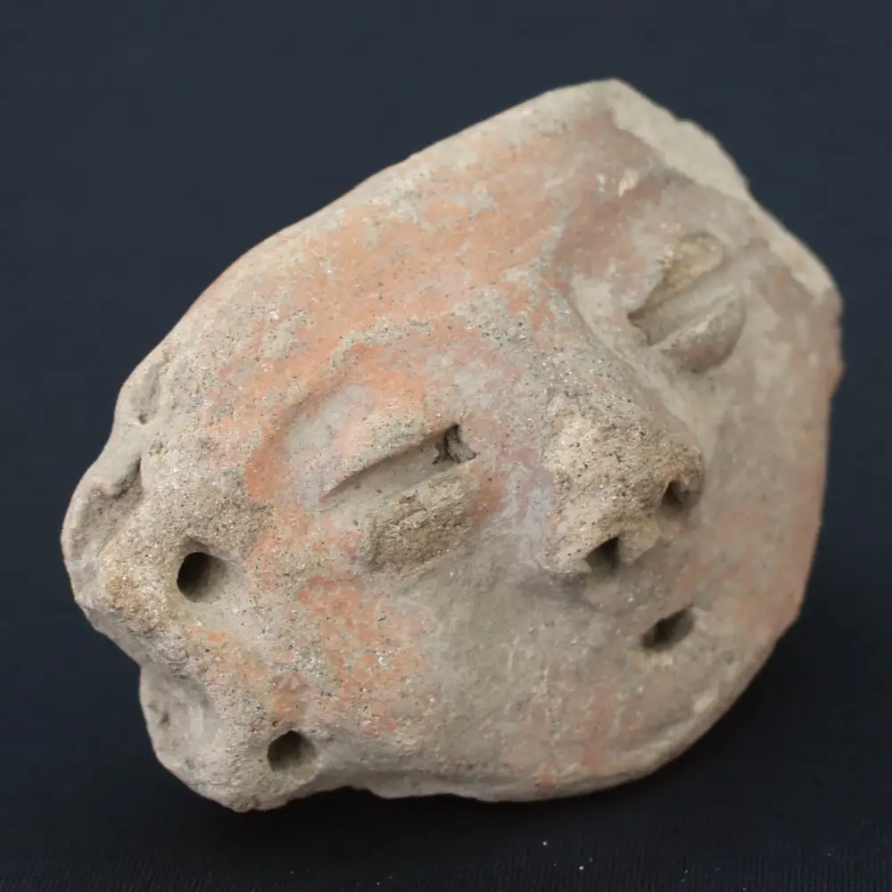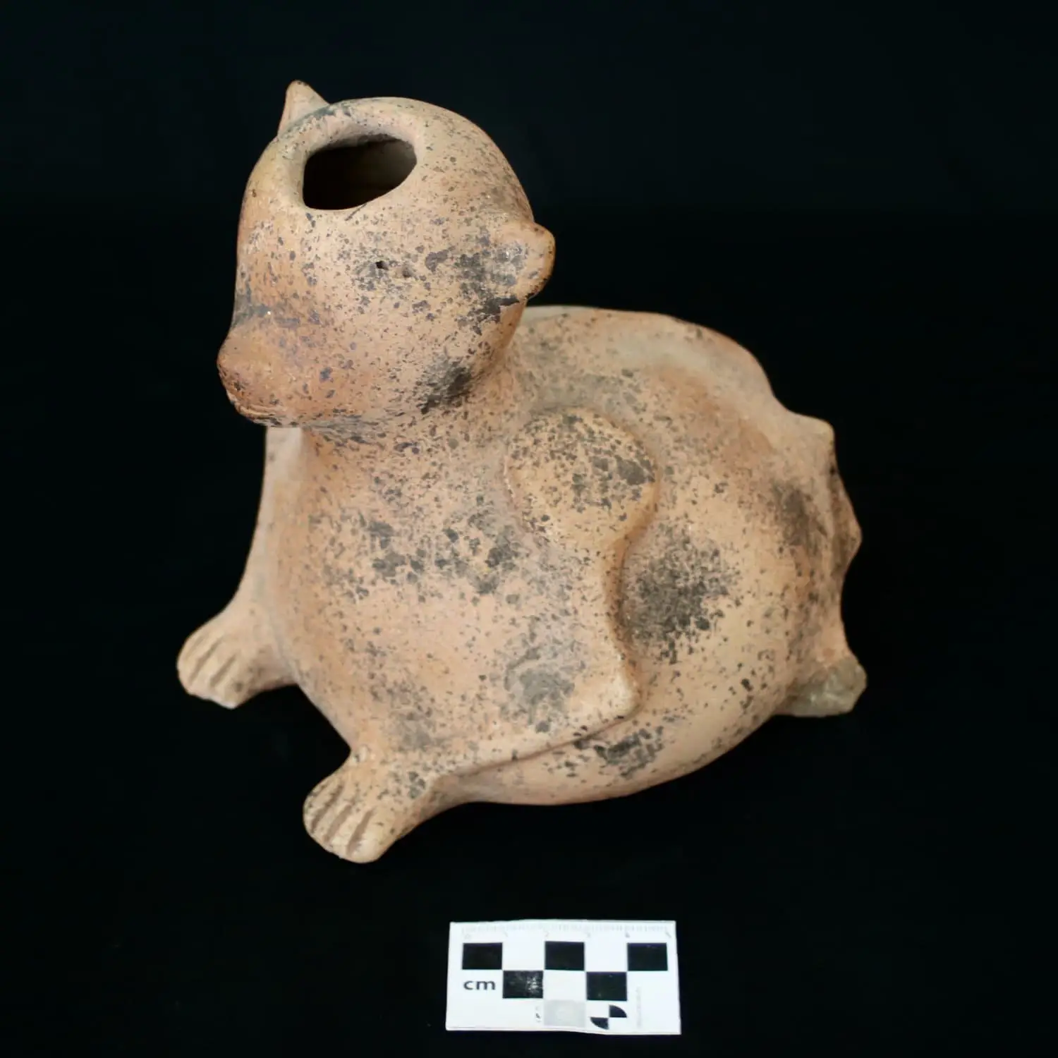 Sello de felino. Cerámica hecha con la técnica de barro modelado, relieve y punzonado. Medidas aproximadas de 7 x 5cm. Fue encontrado junto a otro sello en el sitio de Tebelchía (Mountjoy 2003: PV-38). Asociado a la fase Banderas (1200 – 1600d.C.). El diseño del estampado del sello es en forma de tigre-jaguar con las manchas características de la piel del felino. Los sellos eran utilizados con fines diversos, como serían decorar el cuerpo y la cara, así como para “estampar” diseños sobre vasijas, textiles, papel y otros materiales.
