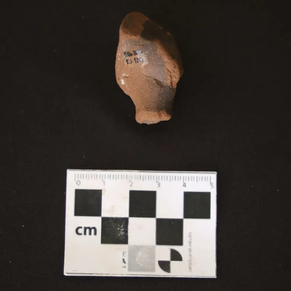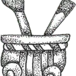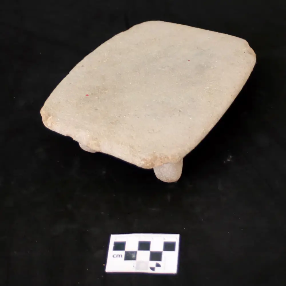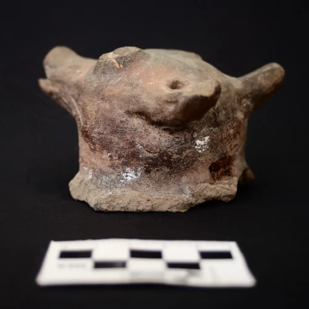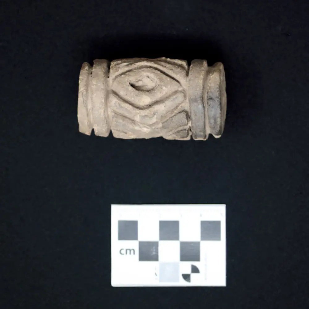 Sello de felino. Cerámica hecha con la técnica de barro modelado, relieve y punzonado. Medidas aproximadas de 7 x 5cm. Fue encontrado junto a otro sello en el sitio de Tebelchía (Mountjoy 2003: PV-38). Asociado a la fase Banderas (1200 – 1600d.C.). El diseño del estampado del sello es en forma de tigre-jaguar con las manchas características de la piel del felino. Los sellos eran utilizados con fines diversos, como serían decorar el cuerpo y la cara, así como para “estampar” diseños sobre vasijas, textiles, papel y otros materiales.