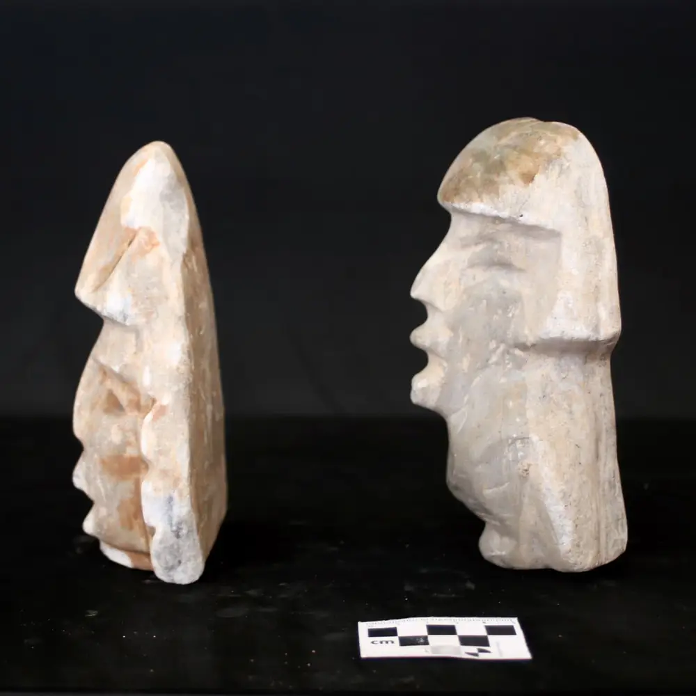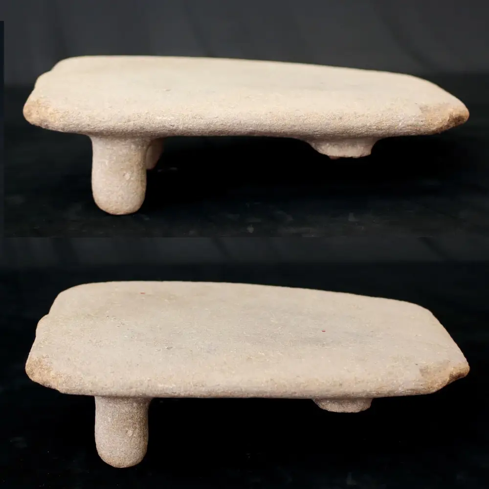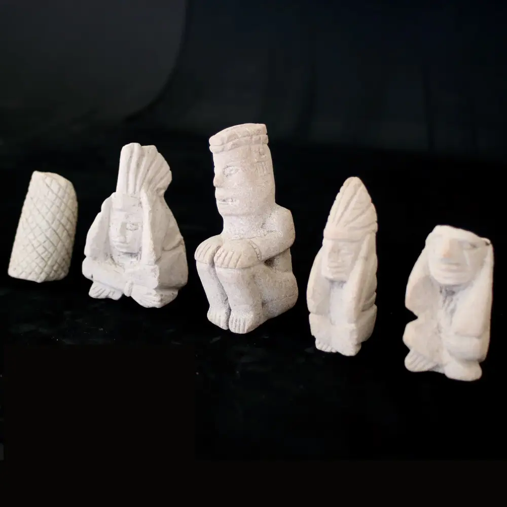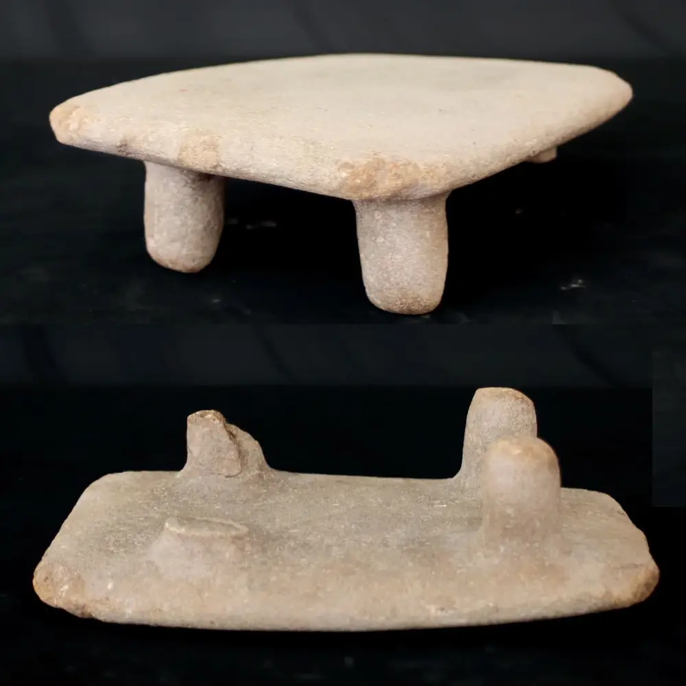 Vaso chocolatero. Piedra semipreciosa, posiblemente alabastro, trabajada con la técnica de excavado, tallado, incisión y pulido. La pieza forma parte de la colección del Museo Cuale, en Puerto Vallarta, Jalisco. Asociada a las fases Aztatlán-Banderas (900 – 1600d.C.). El vaso es trípode y con figura antropomorfa, presenta una cabeza en relieve donde se resaltan los ojos, nariz y boca, además de contar con un tocado en forma de banda; también tiene resaltados ambos brazos los cuales están flexionados con los antebrazos colocados sobre el estómago.