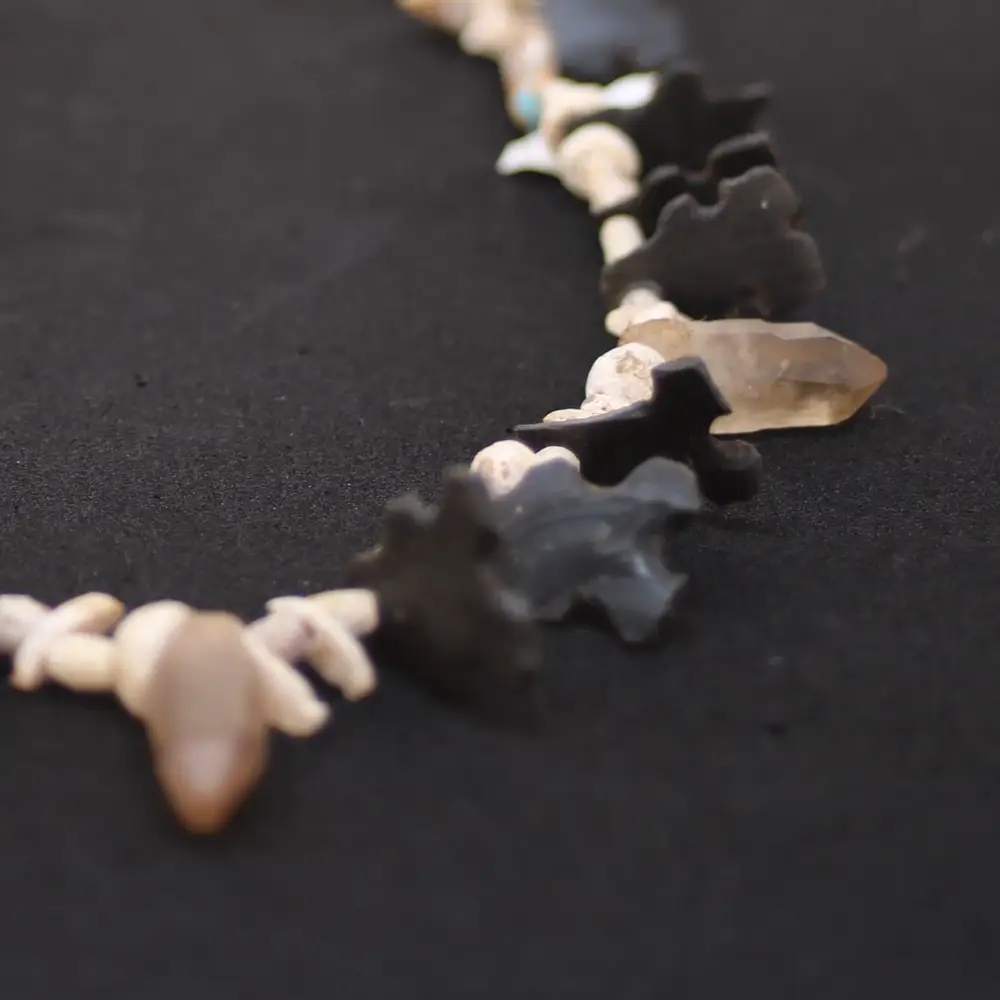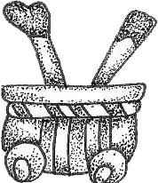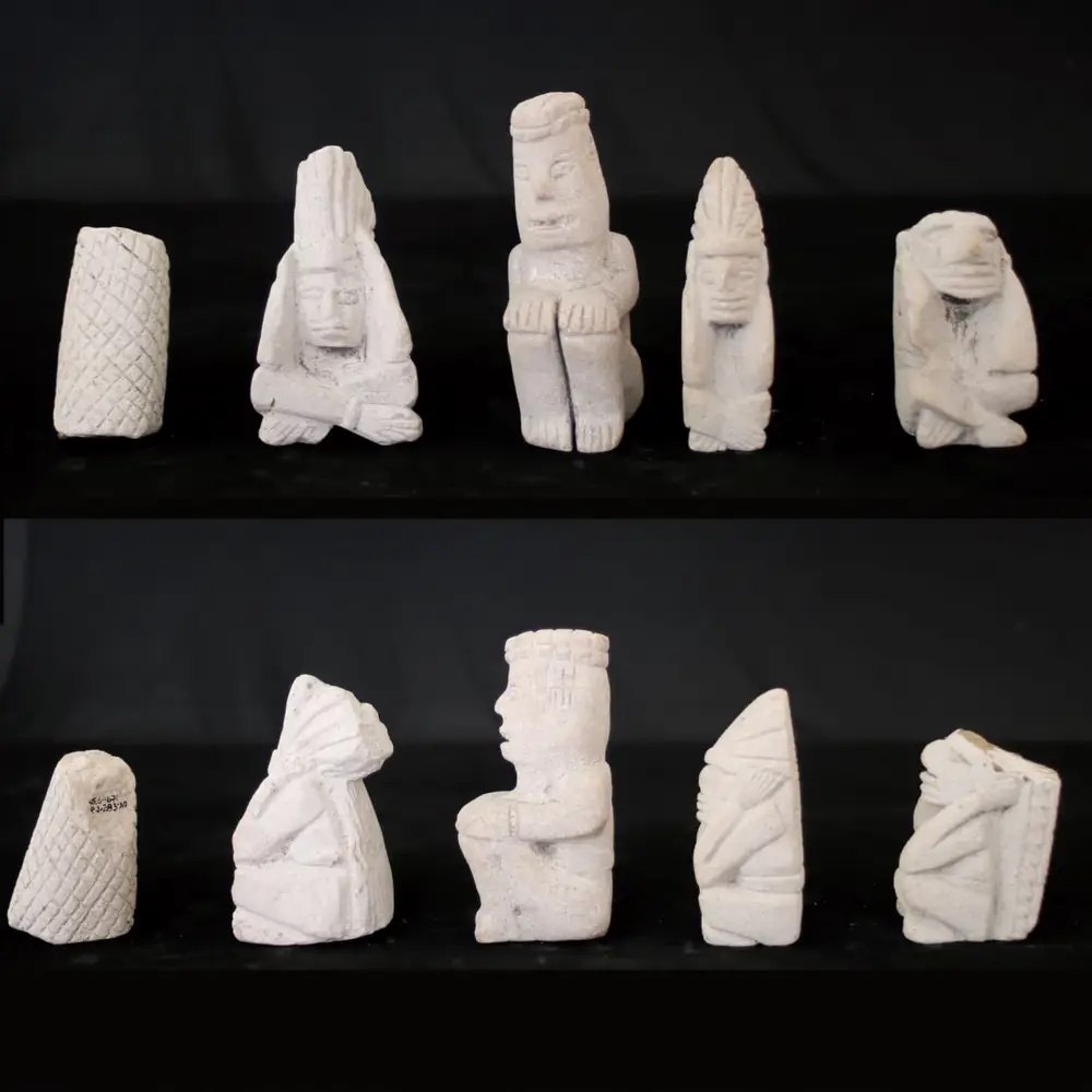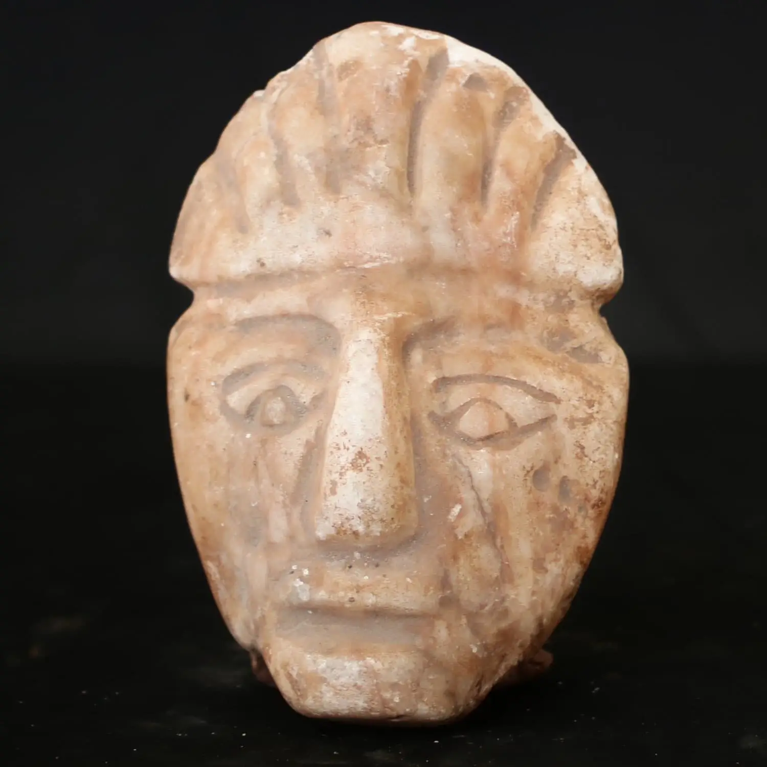 Vaso chocolatero. Piedra semipreciosa, posiblemente alabastro, trabajada con la técnica de excavado, tallado, incisión y pulido. La pieza forma parte de la colección del Museo Cuale, en Puerto Vallarta, Jalisco. Asociada a las fases Aztatlán-Banderas (900 – 1600d.C.). El vaso es trípode y con figura antropomorfa, presenta una cabeza en relieve donde se resaltan los ojos, nariz y boca, además de contar con un tocado en forma de banda; también tiene resaltados ambos brazos los cuales están flexionados con los antebrazos colocados sobre el estómago.