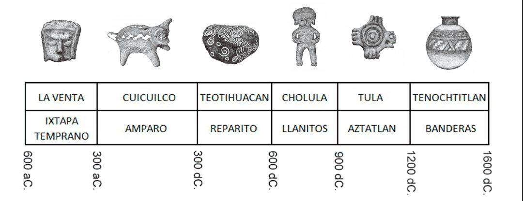 Los objetos representados provienen de hallazgos en la Zona de Monumentos de Ixtapa y de otros sitios arqueológicos dentro del municipio, además de otros pertenecientes a la colección Teresa Barba (Figura 1). Todos estos objetos narran una historia de más de 2,600 años de antigüedad (Figura 2), que comienza cuando los primeros habitantes llegaron a las zonas de humedales costeros formados en la desembocadura del Río Ameca, estableciéndose principalmente en Ixtapa, ubicada en la orilla norte del estero del Salado.