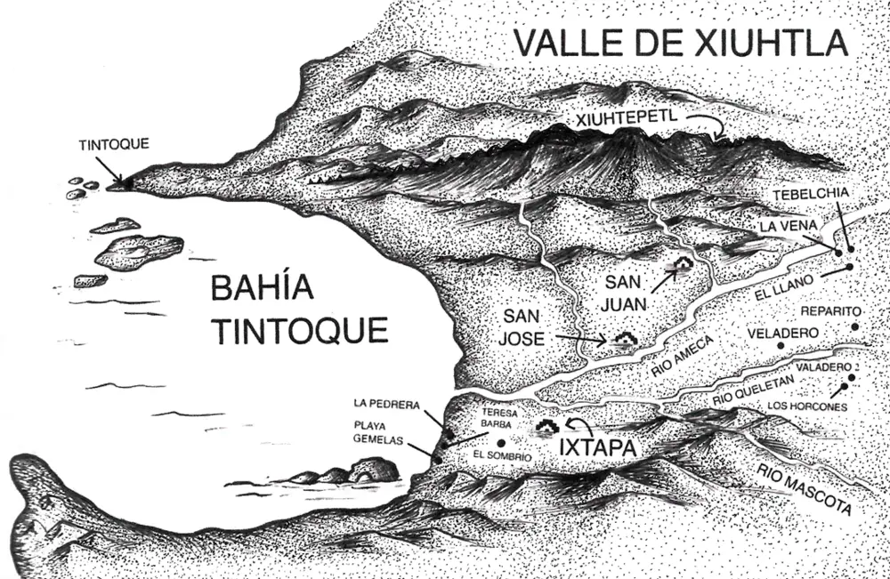 Dada la riqueza en sal de la zona, pronto se estableció en ella un centro habitacional y de intercambio comercial. El nombre náhuatl, Ixtapa, significa “sobre la sal”. Al paso del tiempo, Ixtapa llegaría a ser uno de los centros ceremoniales más importantes de la costa. Su pirámide principal es una réplica simbólica de la montaña sagrada, el Cerro Xiuhtlepetl, la morada divina del dios patrono (Xiuhtecuhtli) que domina la geografía ritual del valle. El monte, “ombligo del mundo” surgido del cuerpo del caimán cósmico, el cual presenta símbolos ígneos en su cima, fue foco irradiador de sacralidad y la fuente de todas las criaturas y todos los bienes de subsistencia del hombre prehistórico.