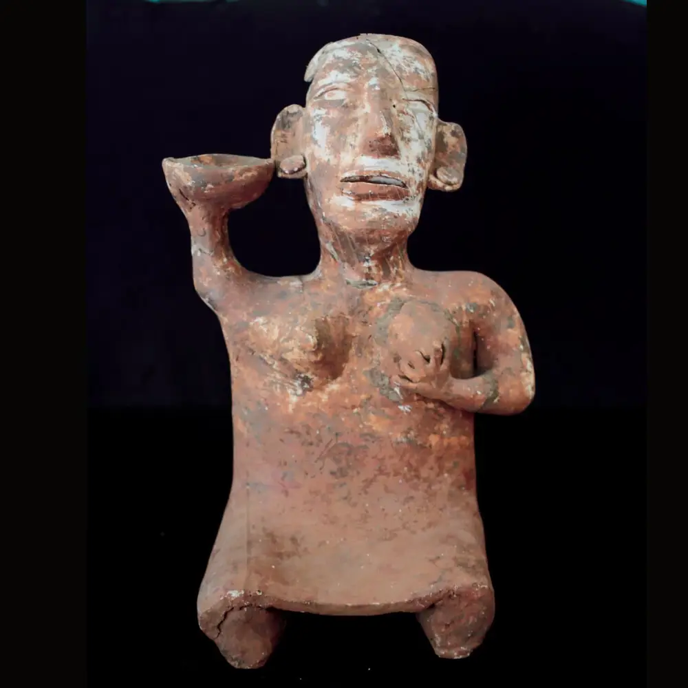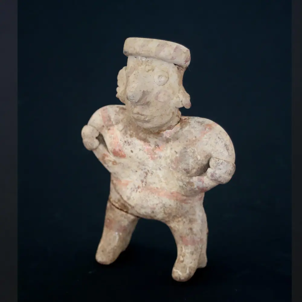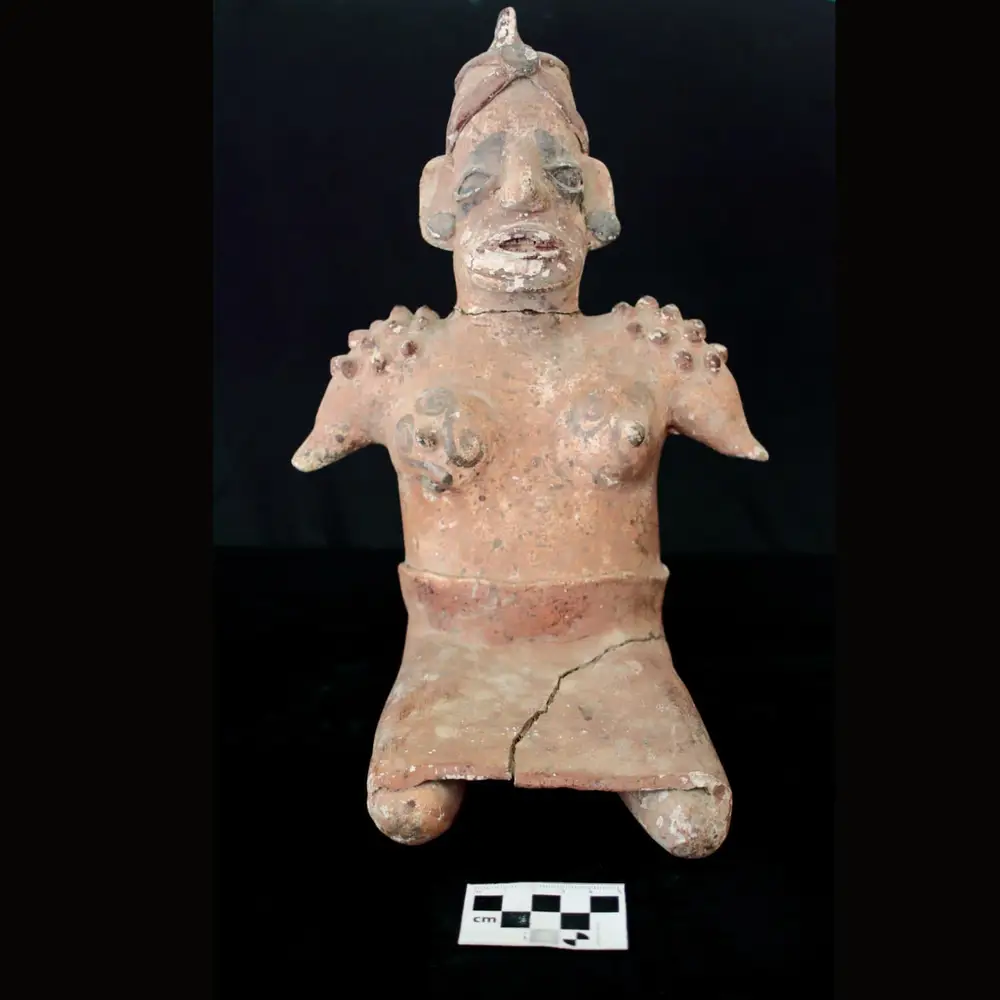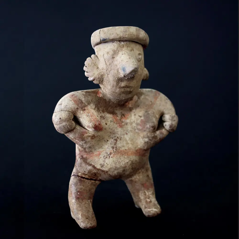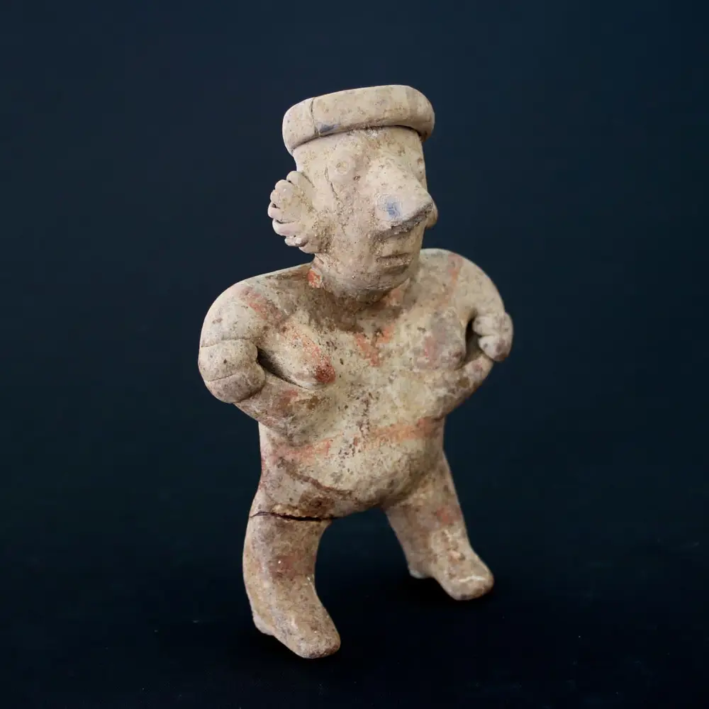 Figurilla Mazapa. Cerámica hecha con la técnica de molde y policromía. Mide aproximadamente 14cm de altura. Proviene de las excavaciones del sitio Tintoque en la Loma Careyeros, Punta de Mita, Nayarit (Beltrán 2019: 49). Asociada a la fase Aztatlán (900 – 1200d.C.). Representa a un personaje femenino “hablando o cantando”. Lleva un tocado con dos protuberancias y una banda sobre la frente decorada con dos motivos circulares. El pelo le cuelga hasta los hombros y porta orejeras circulares. Viste en el torso una prenda quechquémitl y lleva falda. Al centro del pecho sostiene con las manos un disco circular que podría ser un pendiente. Figurilla de uso ritual.