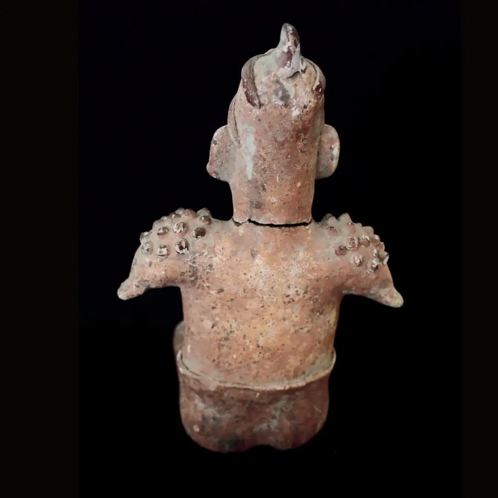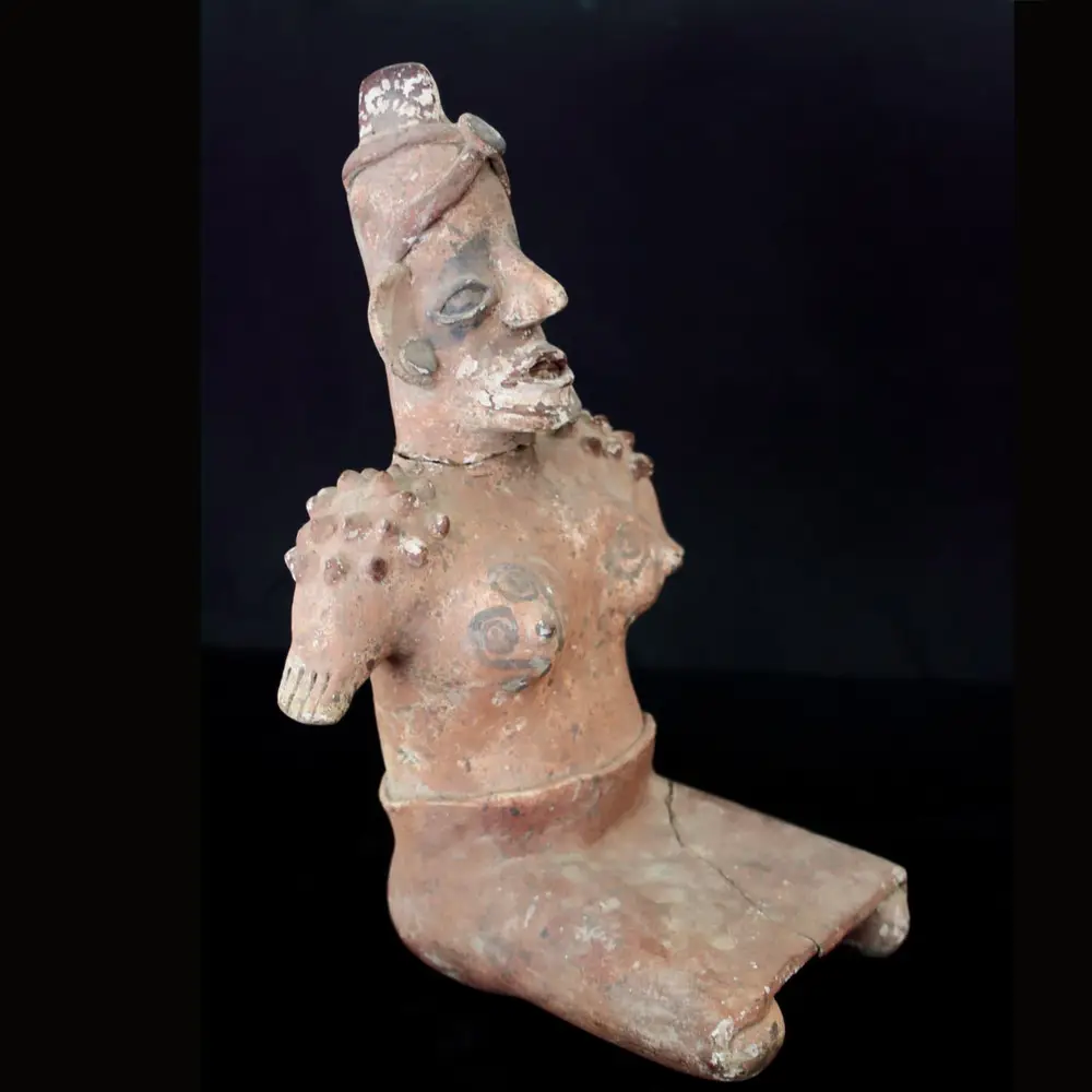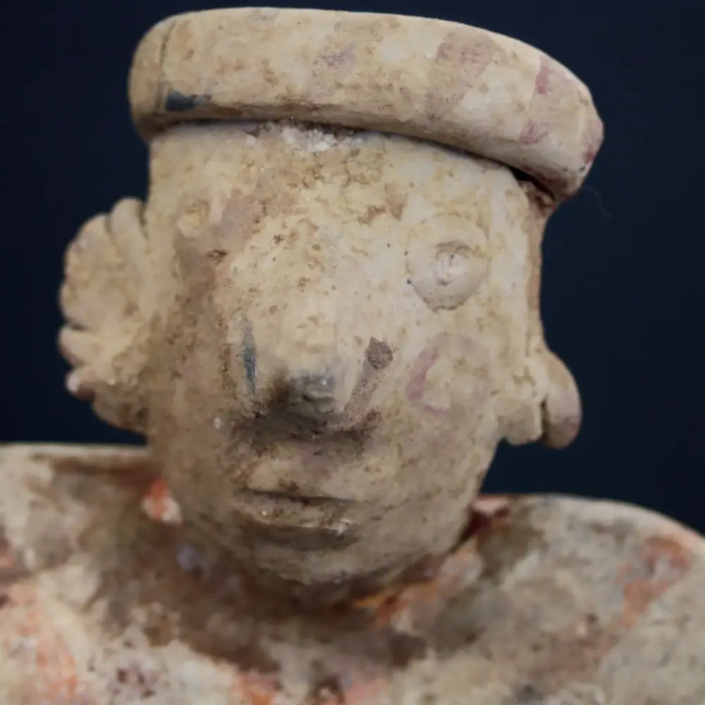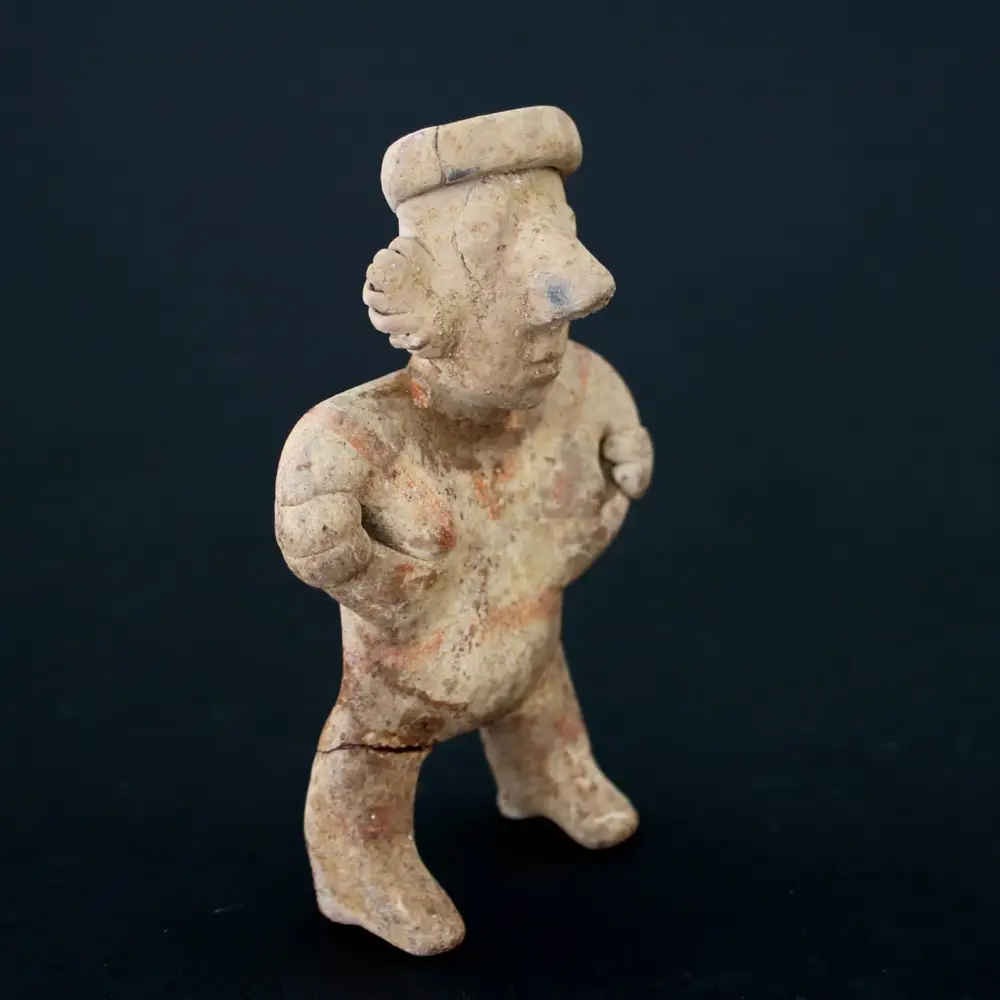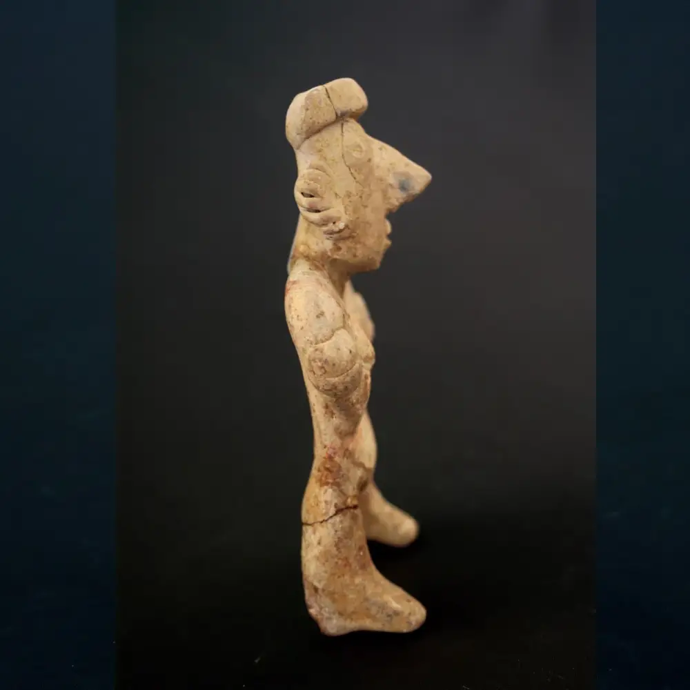 Figurilla Mazapa. Cerámica hecha con la técnica de molde y policromía. Mide aproximadamente 14cm de altura. Proviene de las excavaciones del sitio Tintoque en la Loma Careyeros, Punta de Mita, Nayarit (Beltrán 2019: 49). Asociada a la fase Aztatlán (900 – 1200d.C.). Representa a un personaje femenino “hablando o cantando”. Lleva un tocado con dos protuberancias y una banda sobre la frente decorada con dos motivos circulares. El pelo le cuelga hasta los hombros y porta orejeras circulares. Viste en el torso una prenda quechquémitl y lleva falda. Al centro del pecho sostiene con las manos un disco circular que podría ser un pendiente. Figurilla de uso ritual.