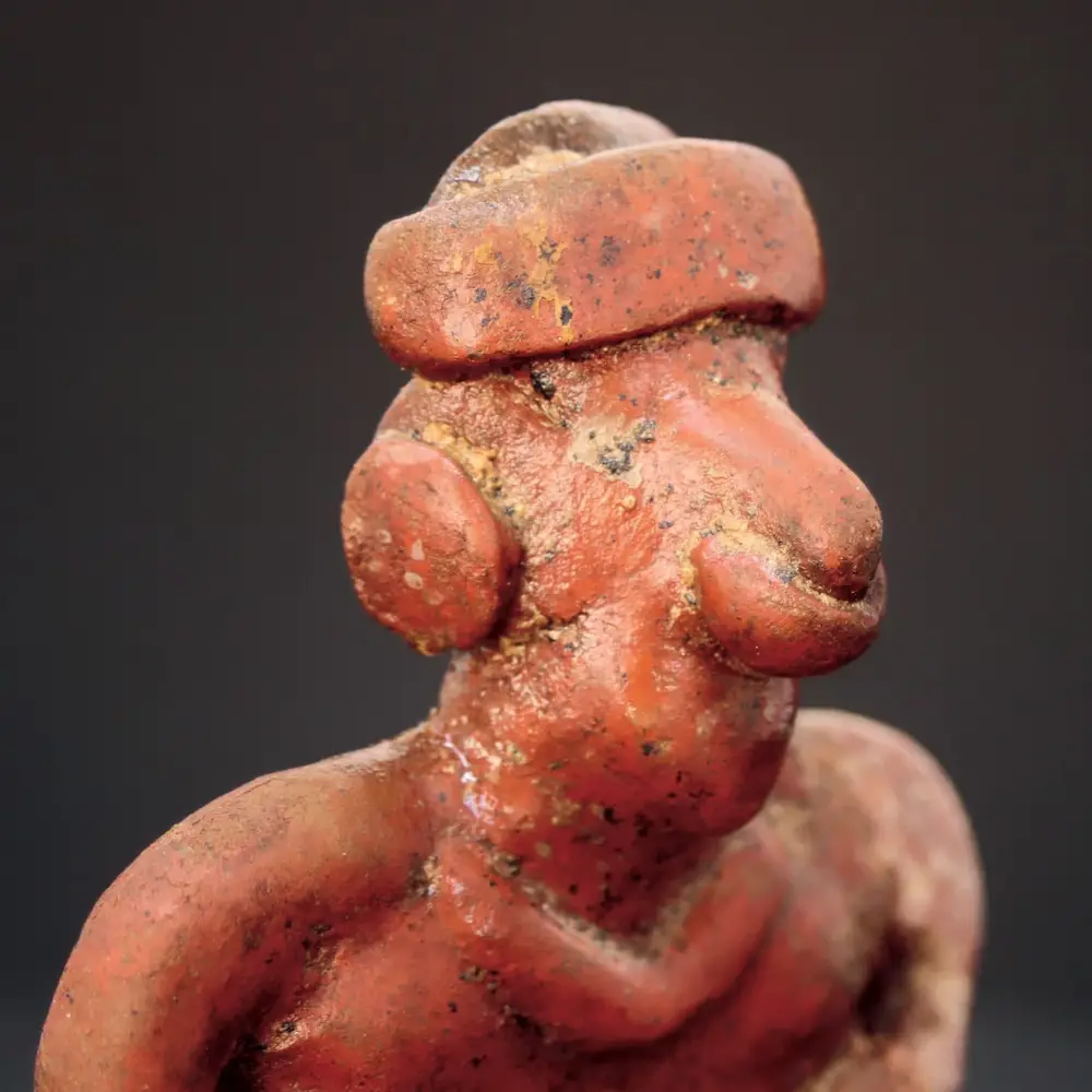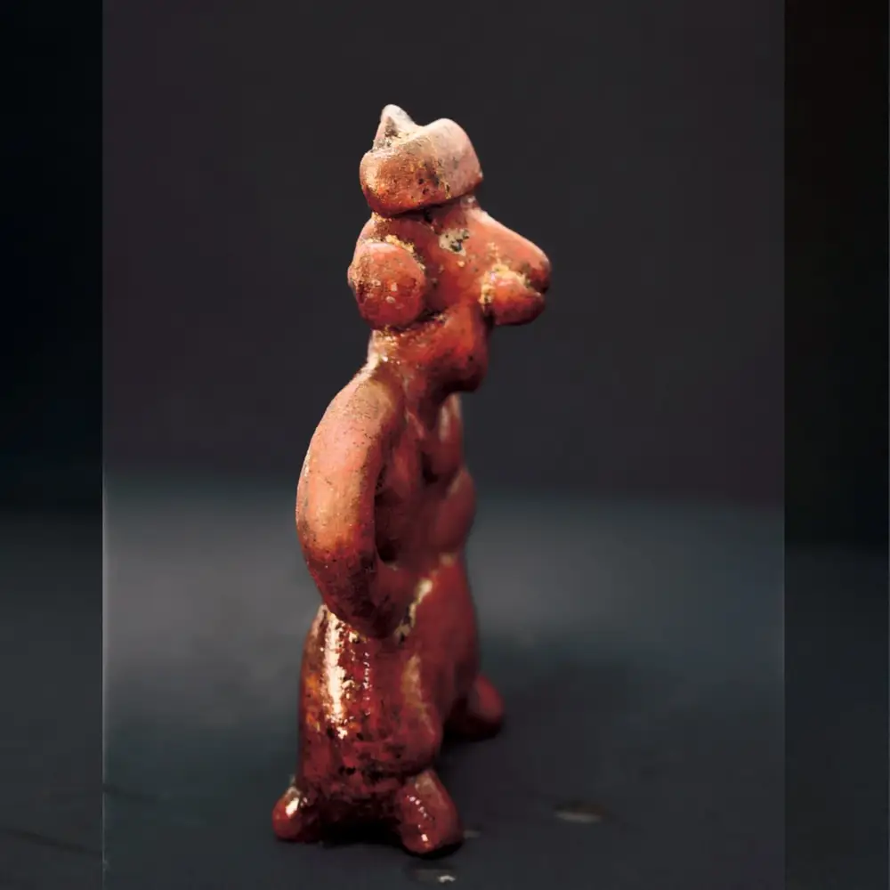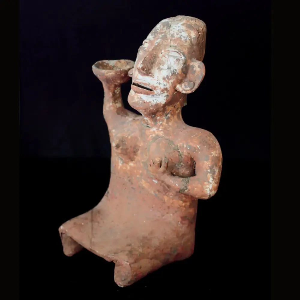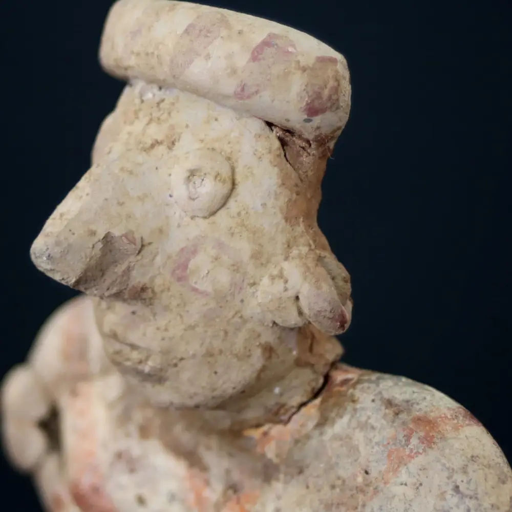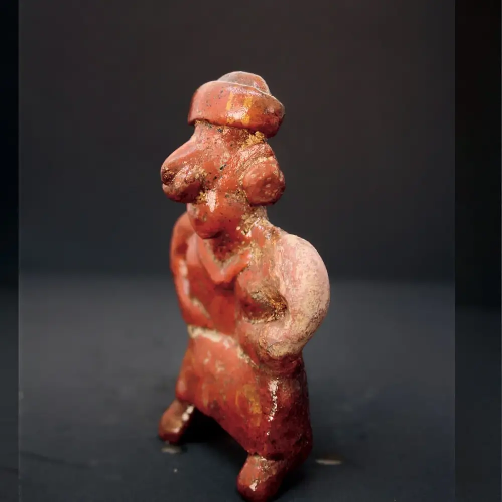 Figurilla Mazapa. Cerámica hecha con la técnica de molde y policromía. Mide aproximadamente 14cm de altura. Proviene de las excavaciones del sitio Tintoque en la Loma Careyeros, Punta de Mita, Nayarit (Beltrán 2019: 49). Asociada a la fase Aztatlán (900 – 1200d.C.). Representa a un personaje femenino “hablando o cantando”. Lleva un tocado con dos protuberancias y una banda sobre la frente decorada con dos motivos circulares. El pelo le cuelga hasta los hombros y porta orejeras circulares. Viste en el torso una prenda quechquémitl y lleva falda. Al centro del pecho sostiene con las manos un disco circular que podría ser un pendiente. Figurilla de uso ritual.