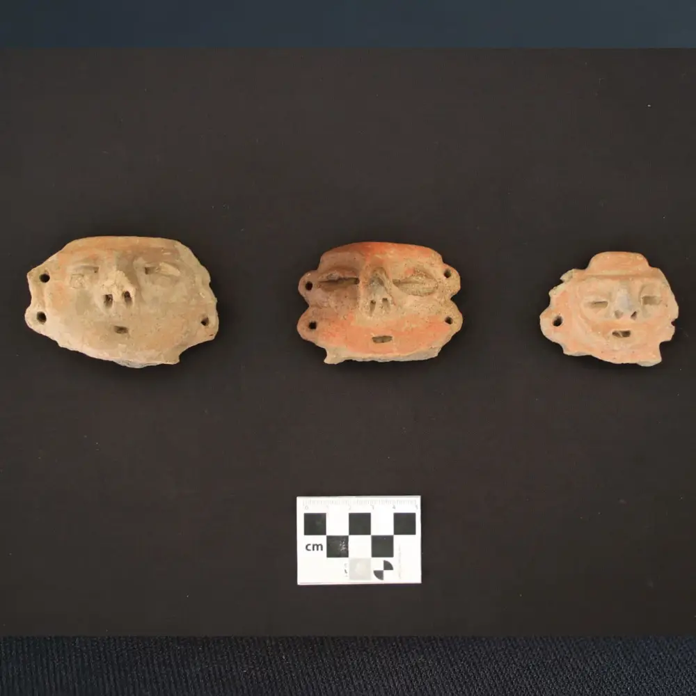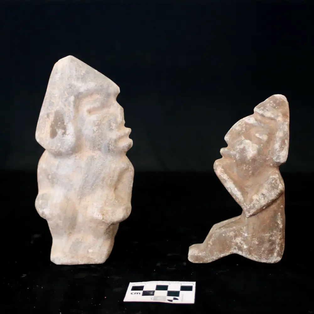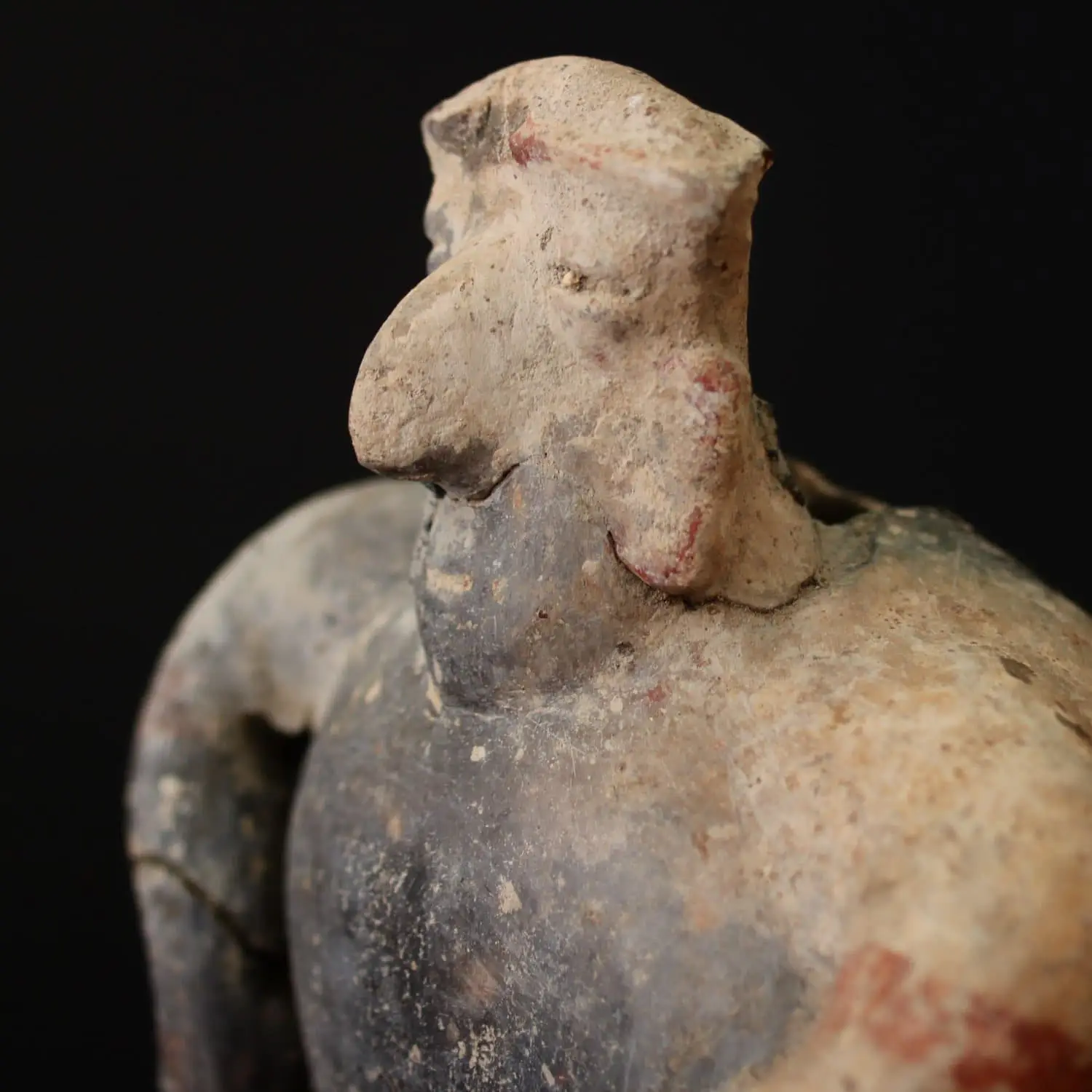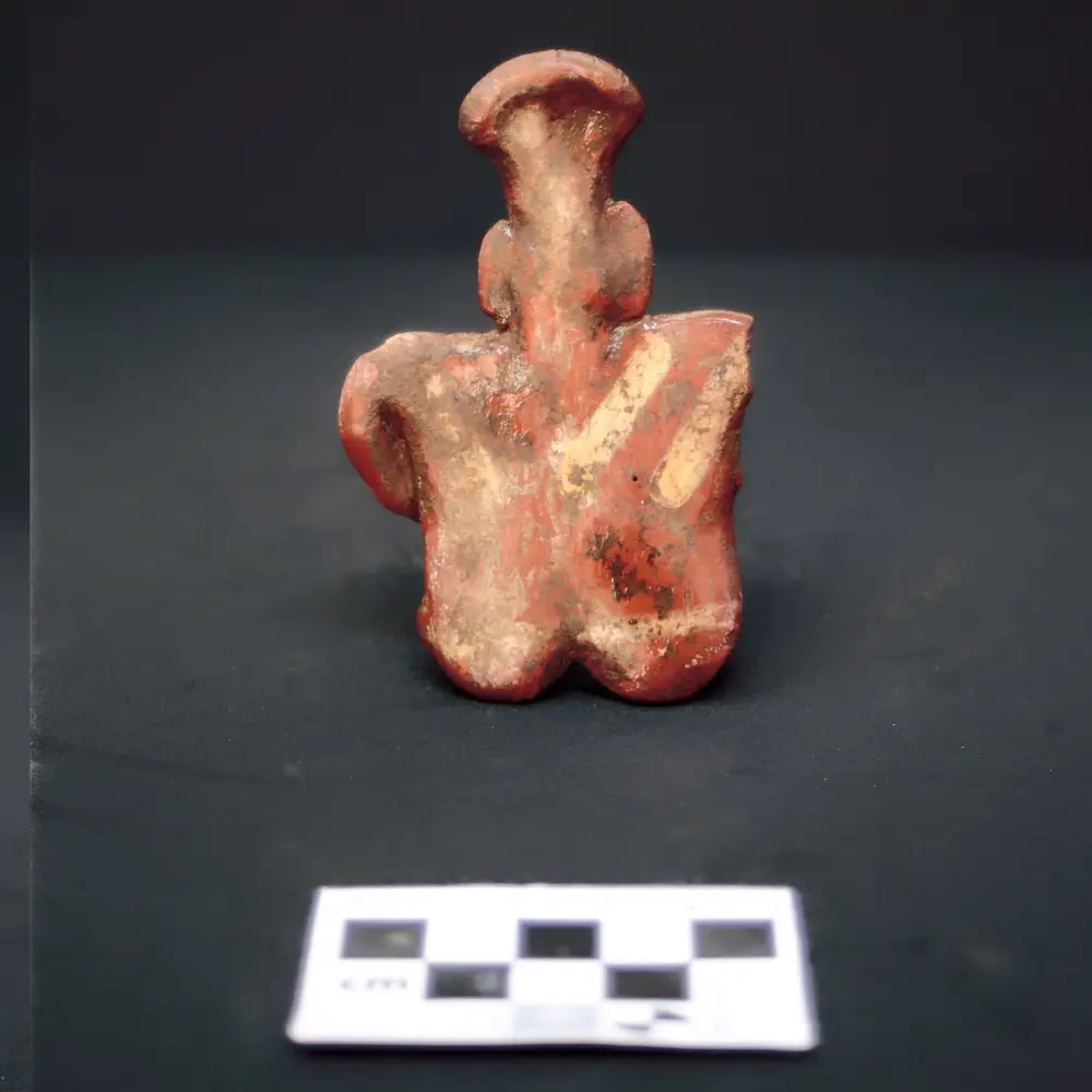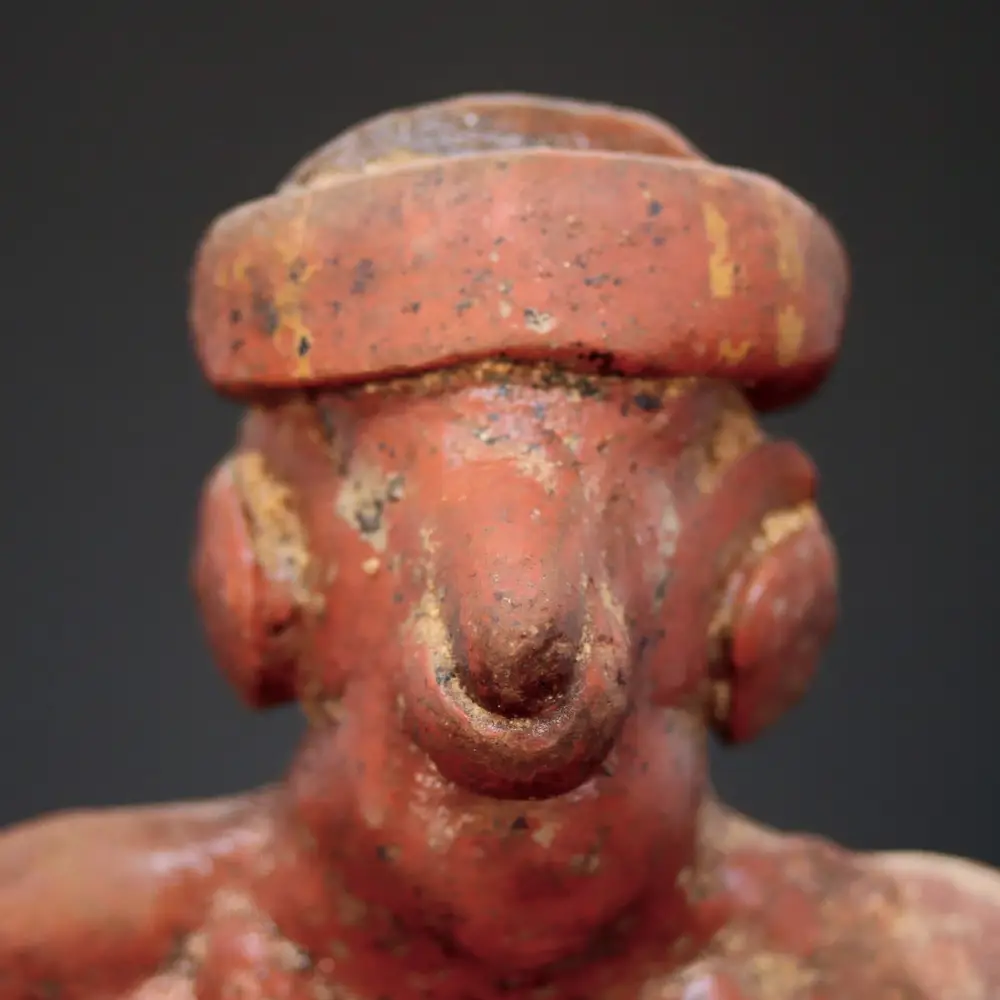 Figurilla Mazapa. Cerámica hecha con la técnica de molde y policromía. Mide aproximadamente 14cm de altura. Proviene de las excavaciones del sitio Tintoque en la Loma Careyeros, Punta de Mita, Nayarit (Beltrán 2019: 49). Asociada a la fase Aztatlán (900 – 1200d.C.). Representa a un personaje femenino “hablando o cantando”. Lleva un tocado con dos protuberancias y una banda sobre la frente decorada con dos motivos circulares. El pelo le cuelga hasta los hombros y porta orejeras circulares. Viste en el torso una prenda quechquémitl y lleva falda. Al centro del pecho sostiene con las manos un disco circular que podría ser un pendiente. Figurilla de uso ritual.