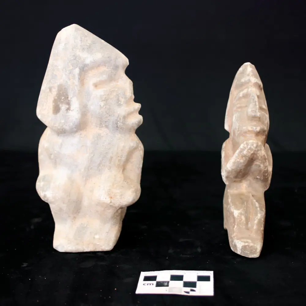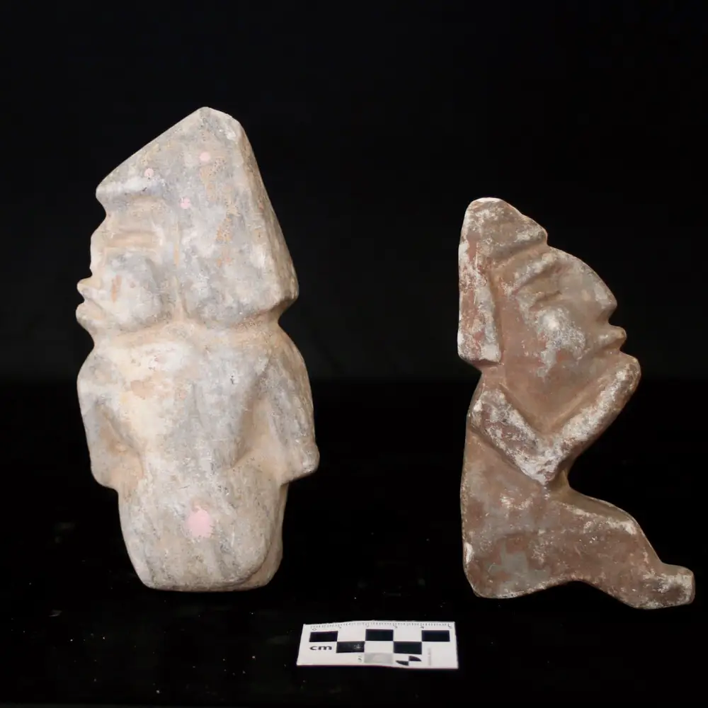 Figurilla. Cerámica hecha con la técnica de modelado, incisión y pastillaje. Mide 23cm de alto por 10cm de ancho. Provienen de la colección Escuela Teresa Barba (REG-1671 PJ 255). Asociada a la fase Amparo (300a.C. – 200d.C.). Representa a un personaje con deformación craneal que lleva tocado y orejeras, sobresale por lo acentuado de las caderas y las piernas en contraste con los brazos pegados al cuerpo que apenas son visibles. El cuerpo de la figurilla es sólida pero la cabeza es hueca y presenta un orificio en la mollera.