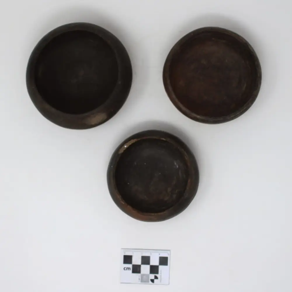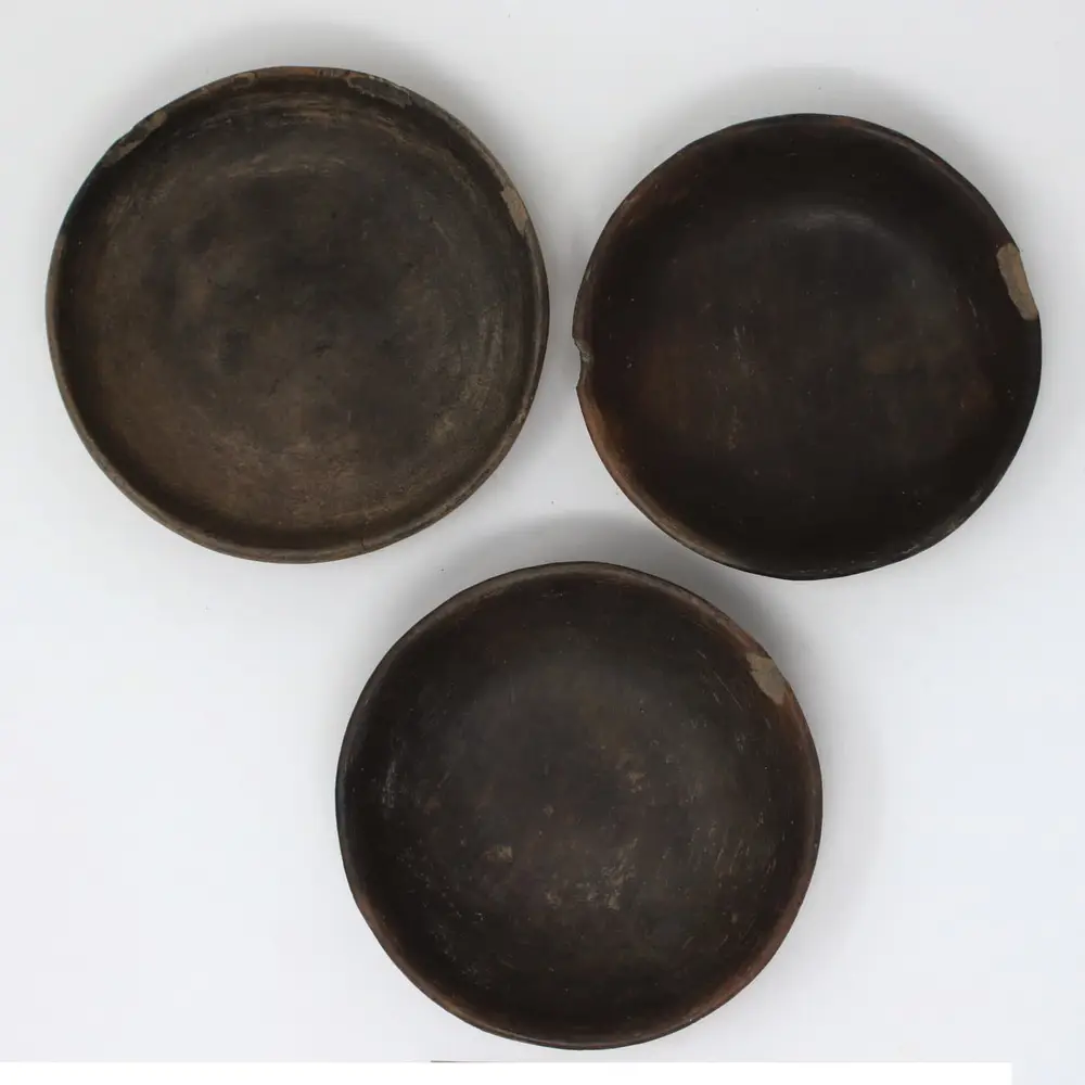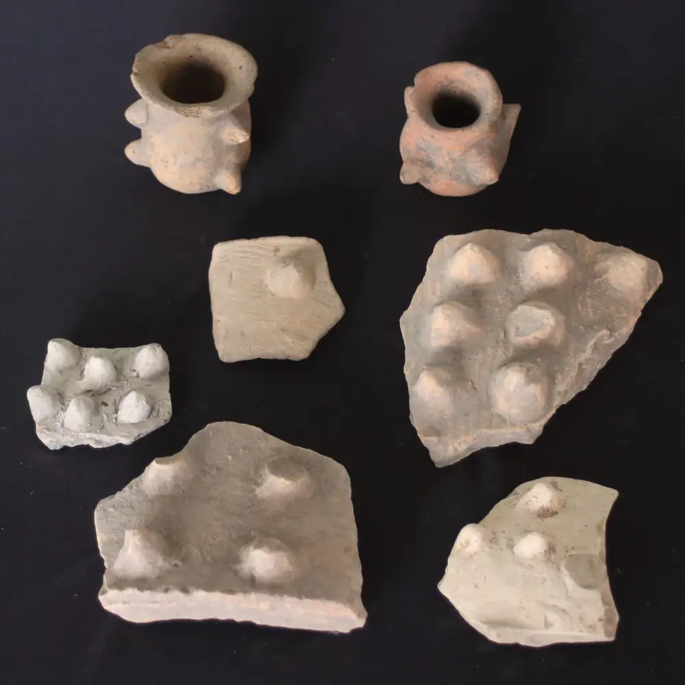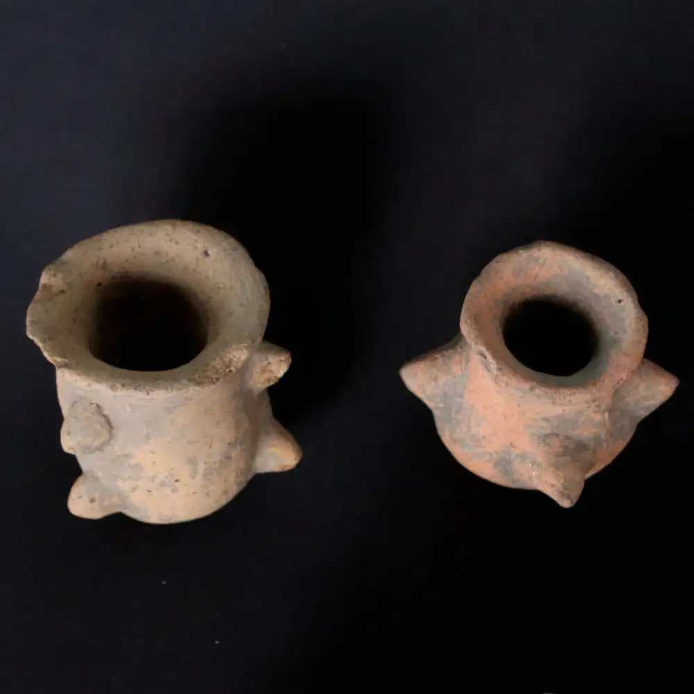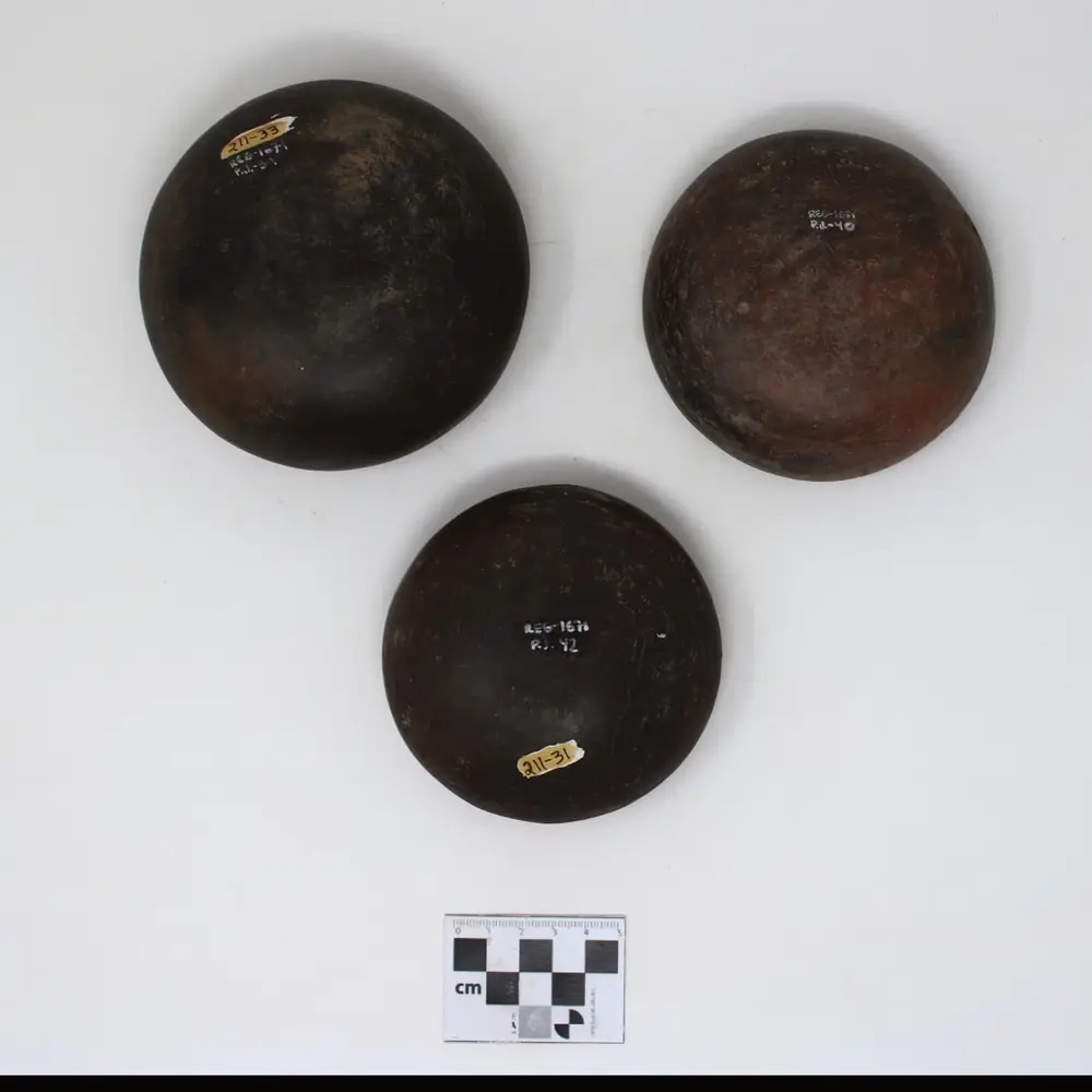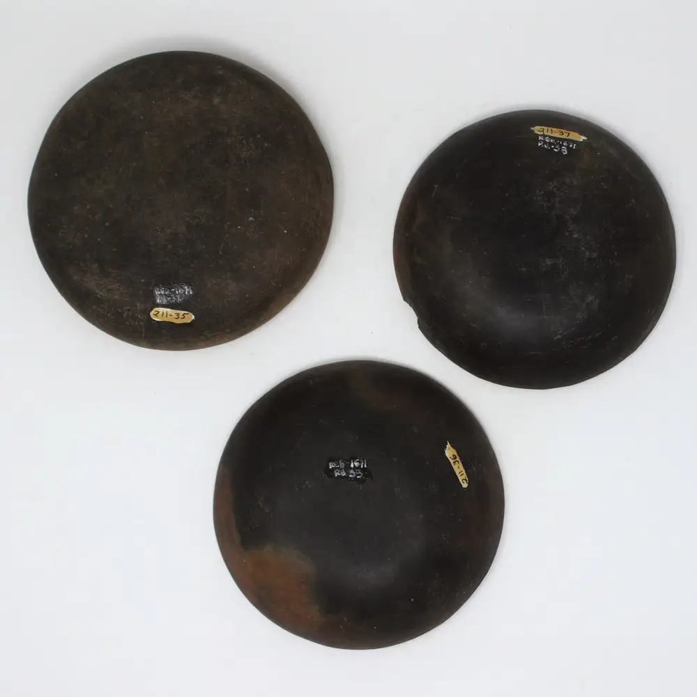 Malacates. Cerámica hecha con la técnica de modelado e incisión. Tienen medidas de entre 3.5 y 4cm de diámetro. Los dos ejemplares superiores provienen de la colección Escuela Teresa Barba (REG-1671 PJ 115). El tercero fue encontrado en un contexto funerario donde fue depositado como ofrenda, durante las excavaciones arqueológicas del sitio El Reparito (Mountjoy 2003: PV-45). Asociados a las fases Aztatlán - Banderas (900 – 1600d.C.). Malacates bicónicos utilizados para hilar algodón y producir hilo, los cuales presentan diseños geométricos incisos