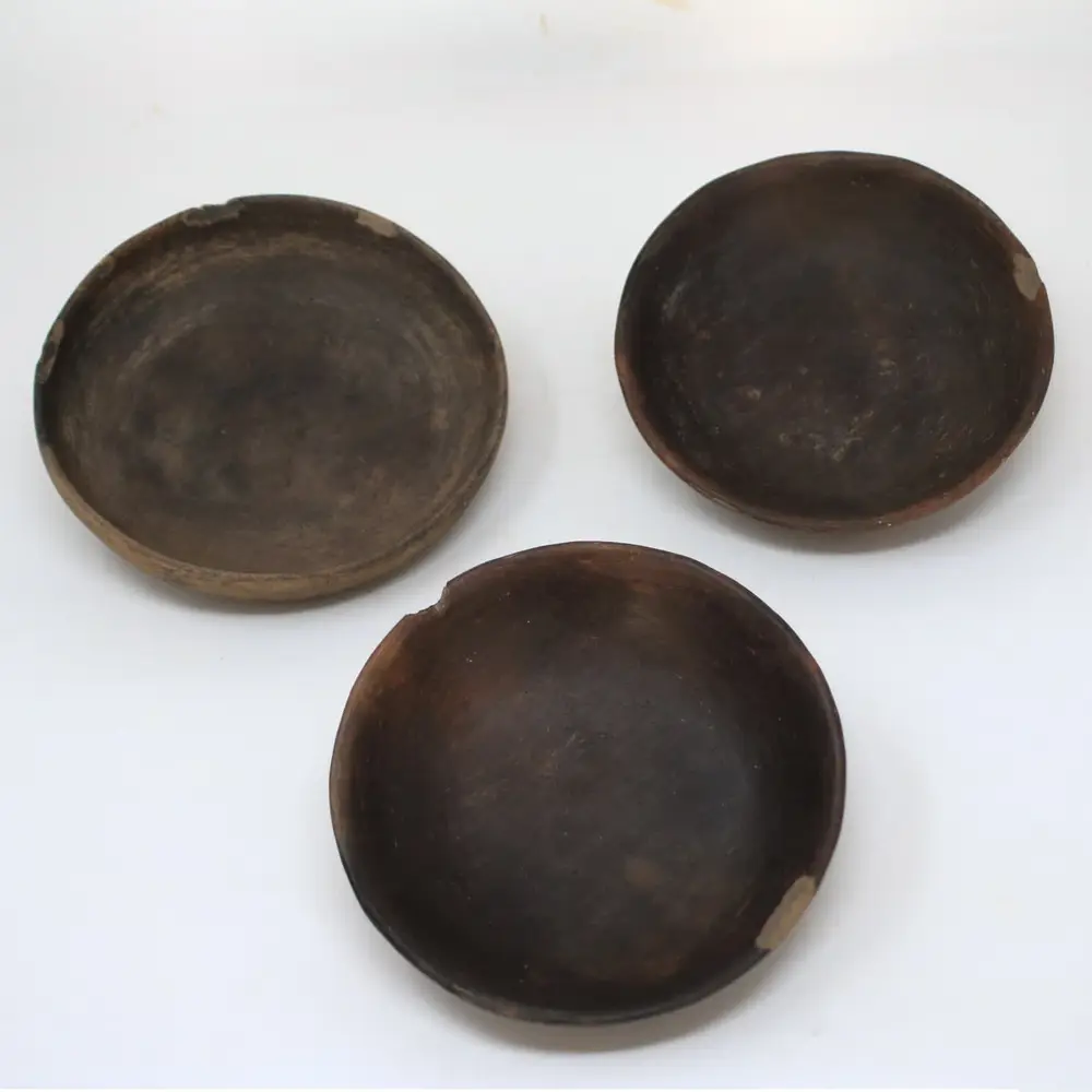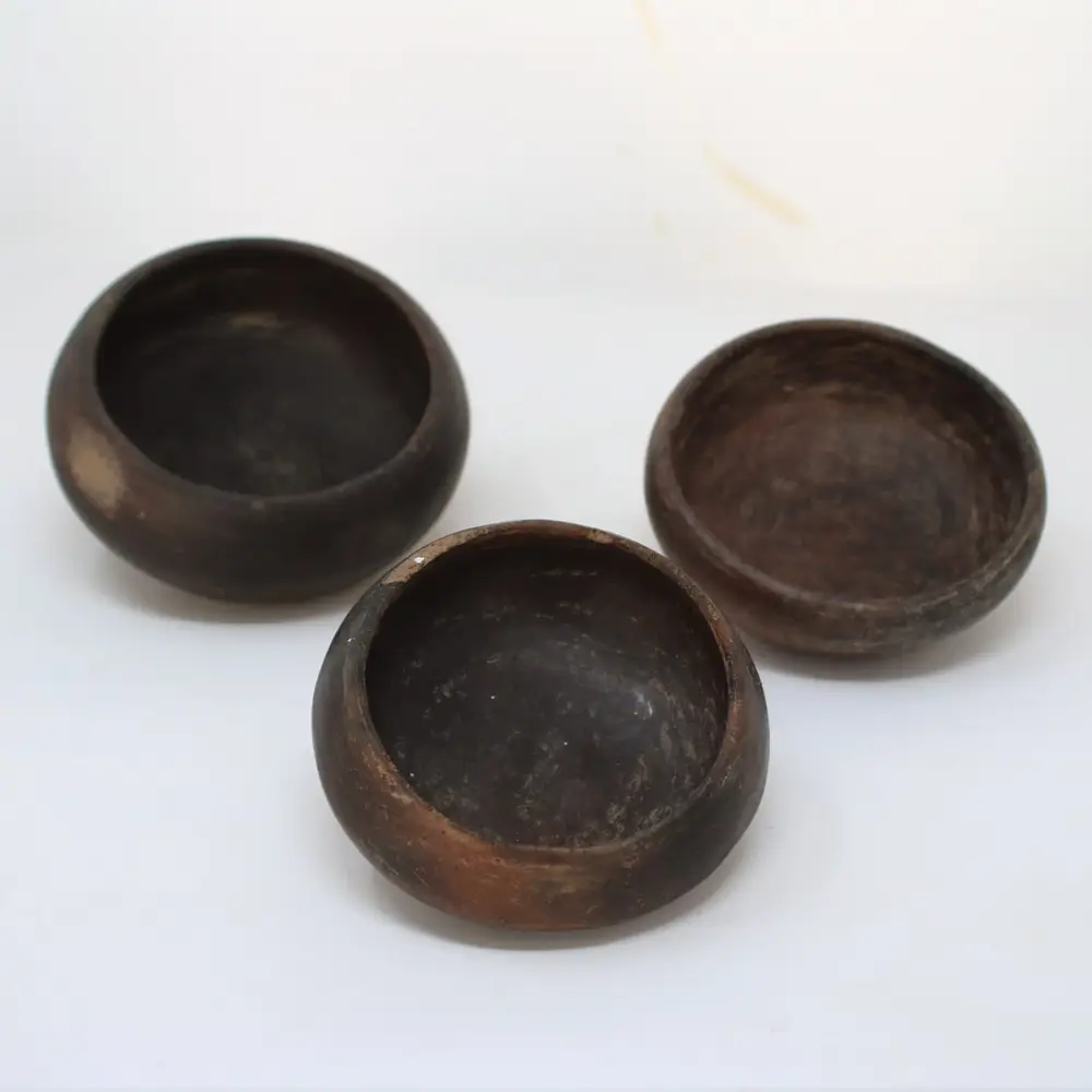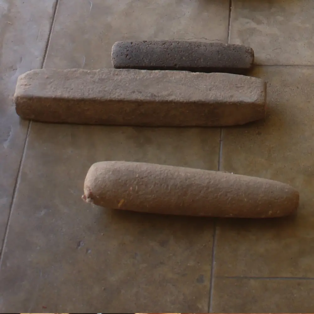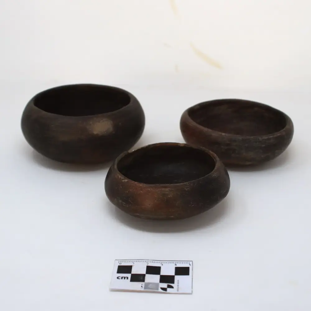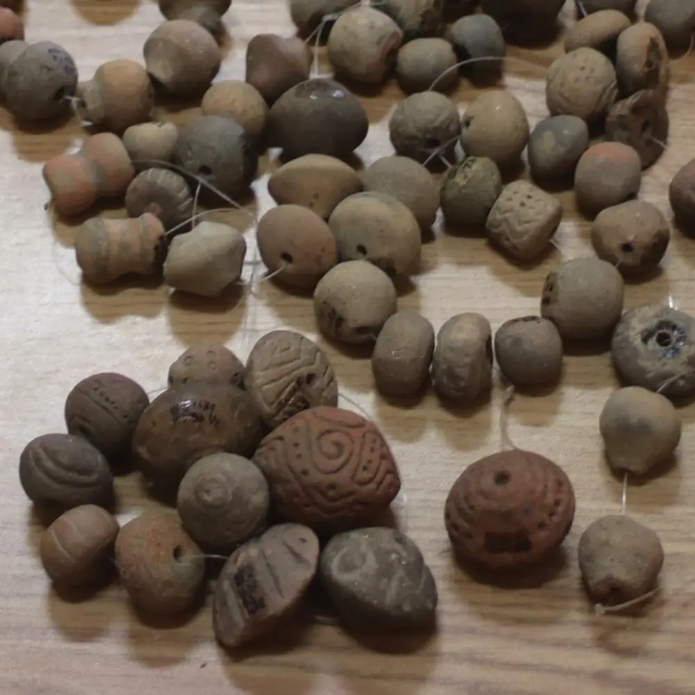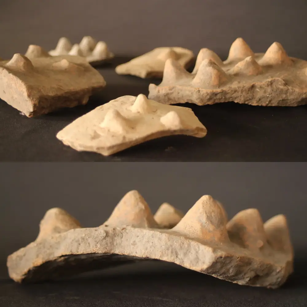 Malacates. Cerámica hecha con la técnica de modelado e incisión. Tienen medidas de entre 3.5 y 4cm de diámetro. Los dos ejemplares superiores provienen de la colección Escuela Teresa Barba (REG-1671 PJ 115). El tercero fue encontrado en un contexto funerario donde fue depositado como ofrenda, durante las excavaciones arqueológicas del sitio El Reparito (Mountjoy 2003: PV-45). Asociados a las fases Aztatlán - Banderas (900 – 1600d.C.). Malacates bicónicos utilizados para hilar algodón y producir hilo, los cuales presentan diseños geométricos incisos