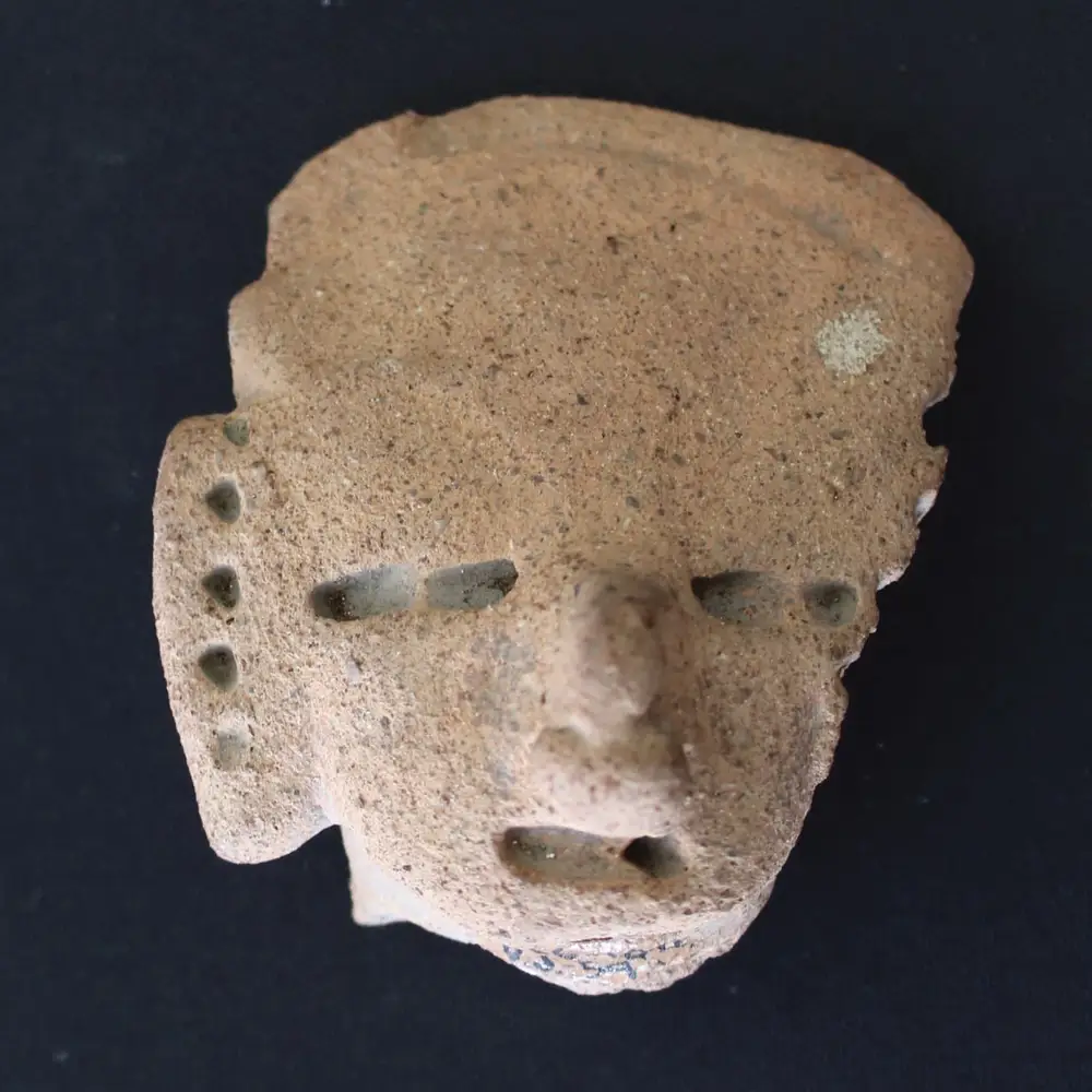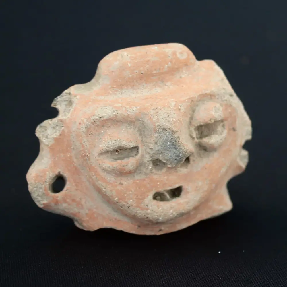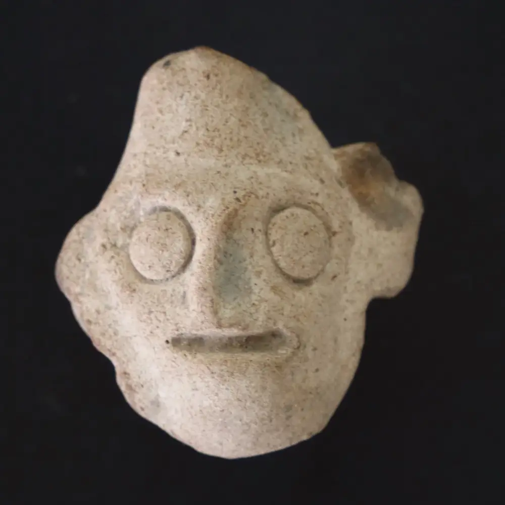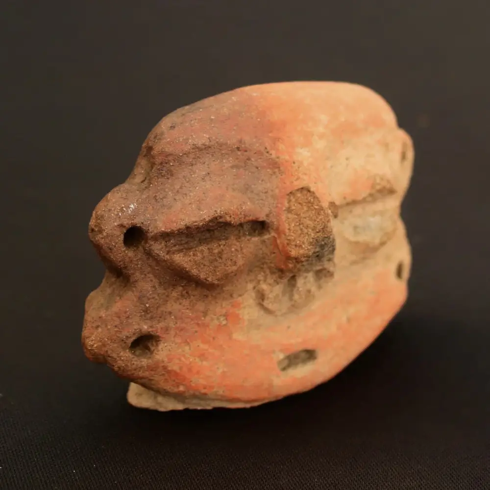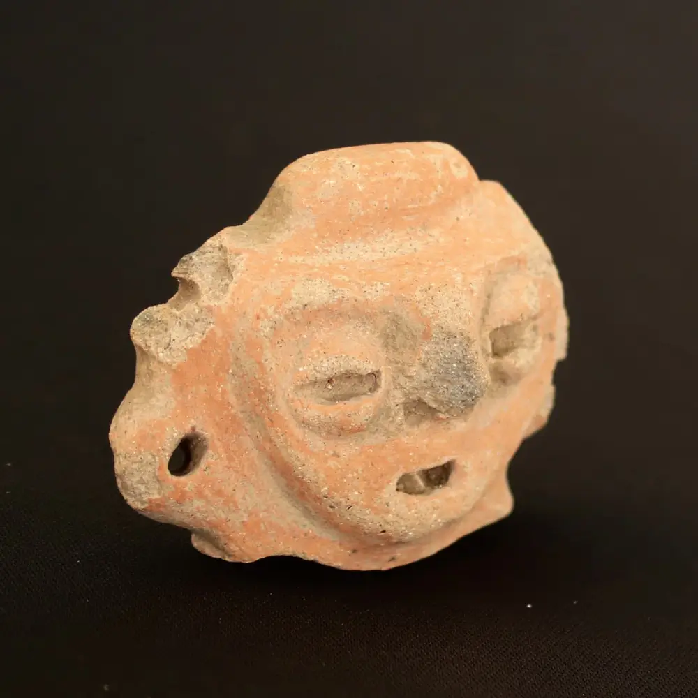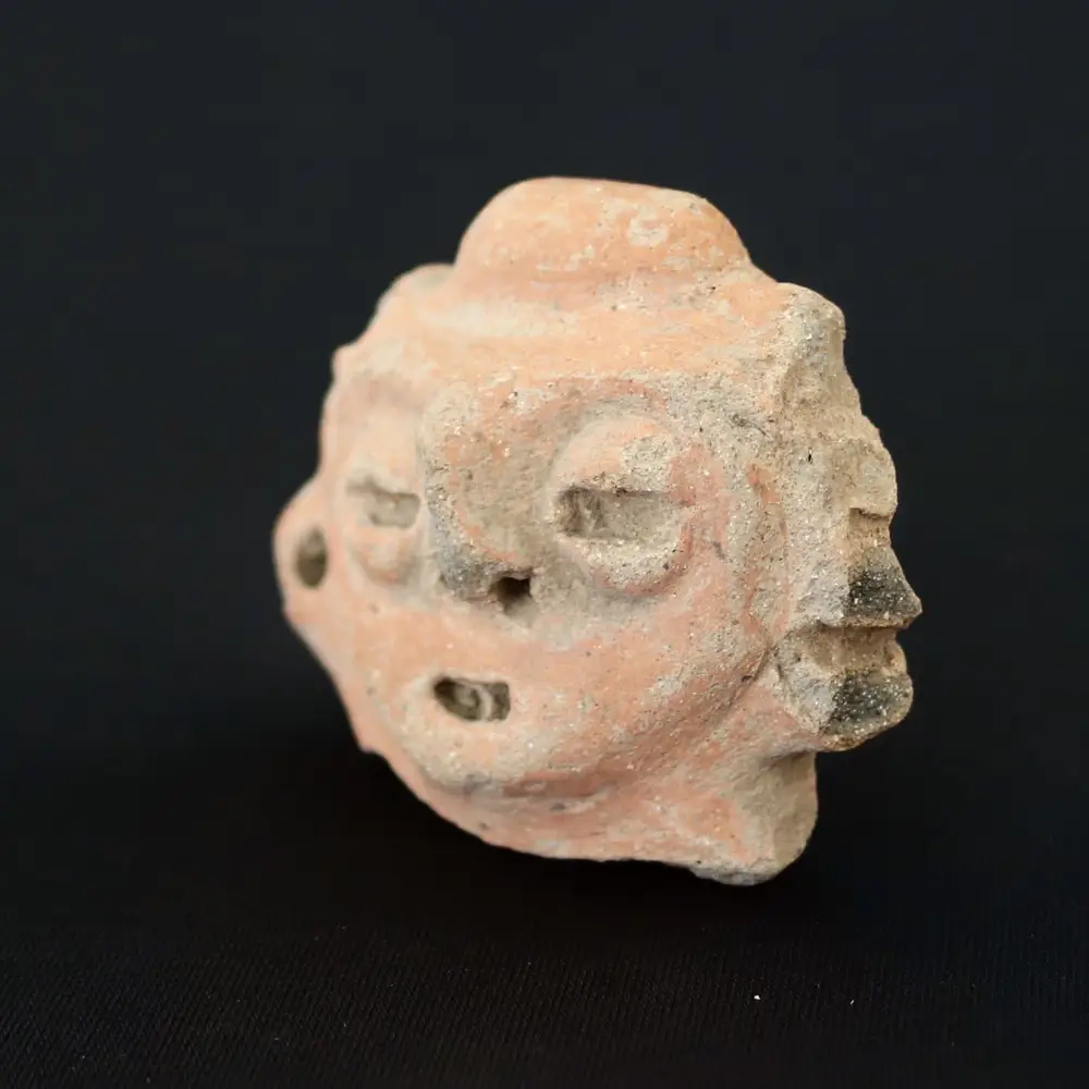 Cabeza de figurilla antropomorfa. Cerámica hecha con la técnica del barro modelado. Medidas aproximadas de 4 x 6cm. Fue encontrada en las excavaciones arqueológicas del Montículo 1 en la Zona de Monumentos de Ixtapa (Mountjoy 2003: PV-1). Está asociada a la fase Ixtapa Temprano (600 – 300a.C.). Se caracteriza por presentar la cabeza deformada tipo tabular erecta, con el rostro sumido y con las cejas unidas con la nariz que le da su peculiar expresión. Este fragmento de figurilla es una de las primeras representaciones de la figura humana encontradas arqueológicamente en la zona costera.