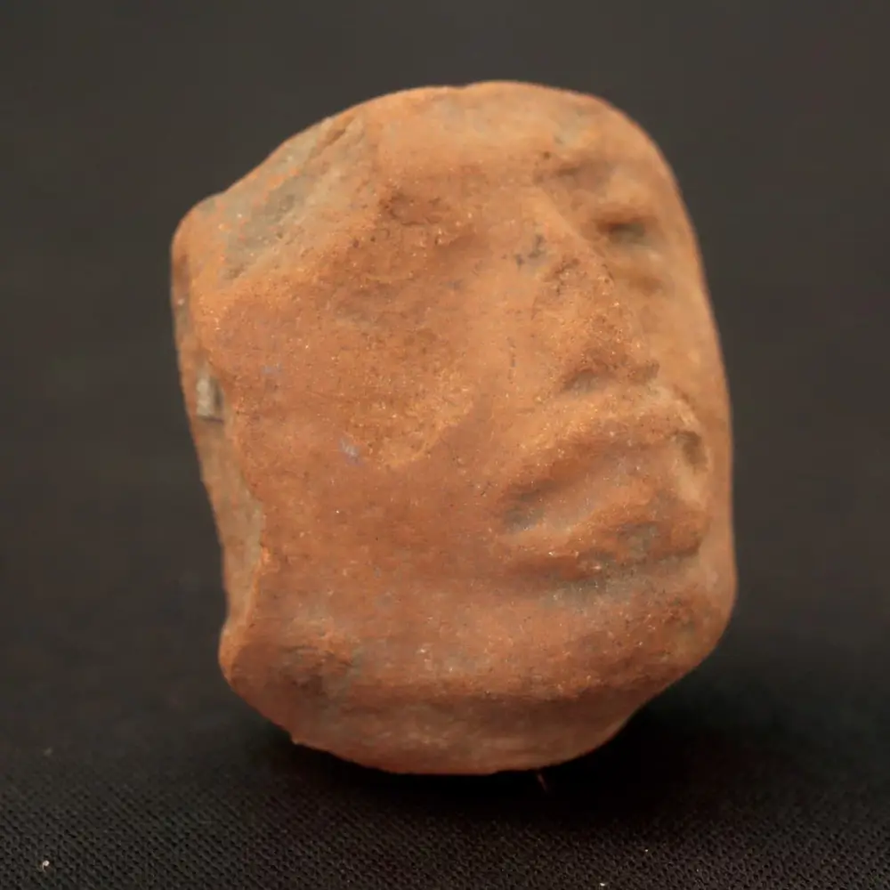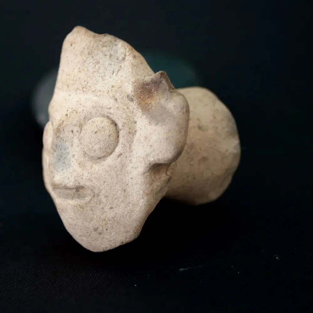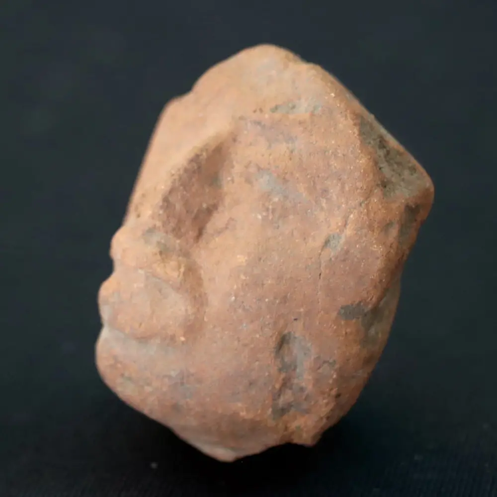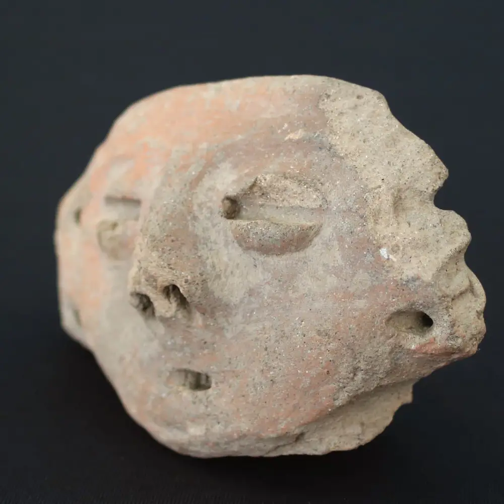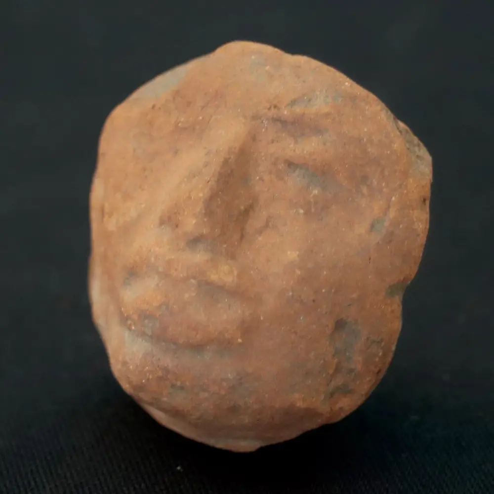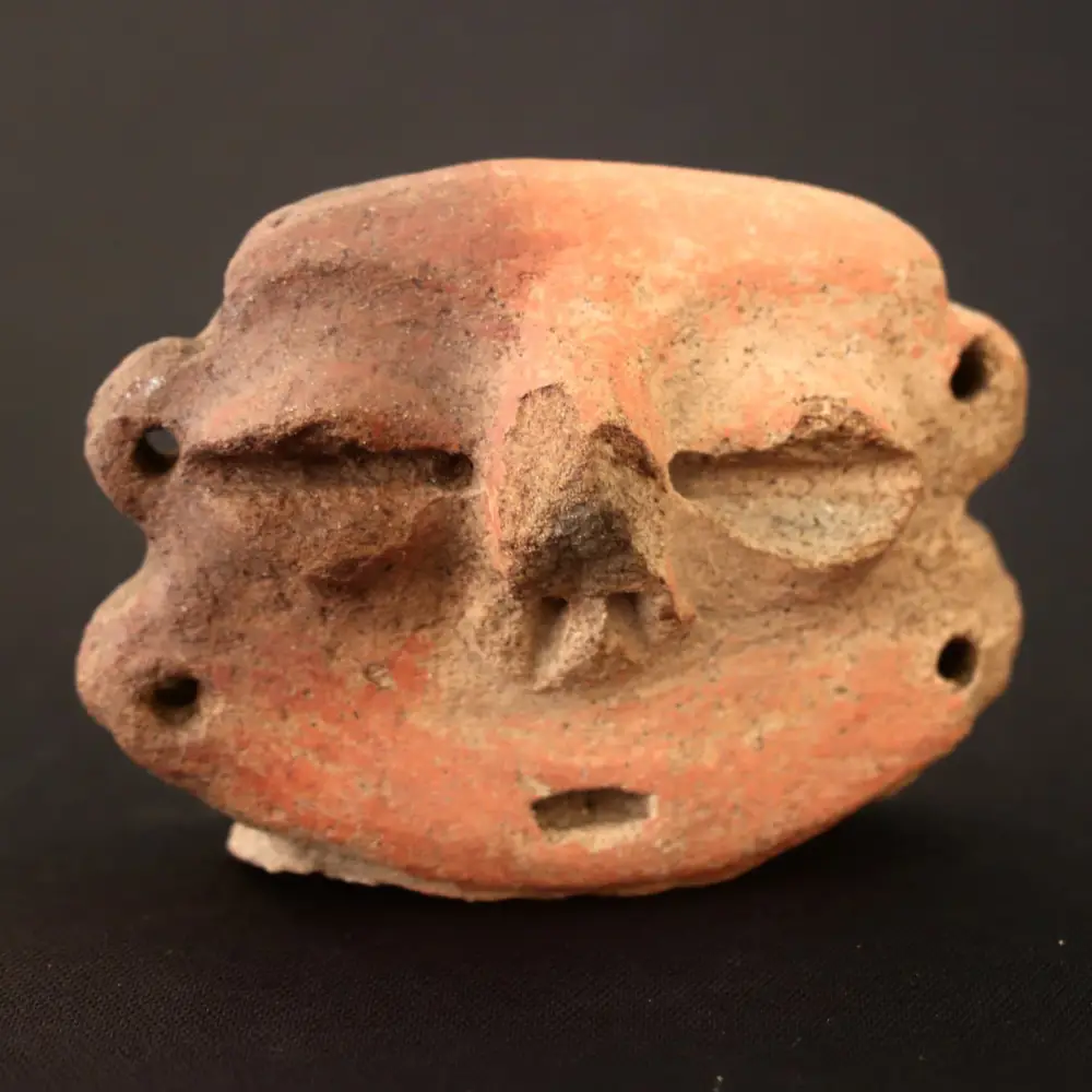 Cabeza de figurilla antropomorfa. Cerámica hecha con la técnica del barro modelado. Medidas aproximadas de 4 x 6cm. Fue encontrada en las excavaciones arqueológicas del Montículo 1 en la Zona de Monumentos de Ixtapa (Mountjoy 2003: PV-1). Está asociada a la fase Ixtapa Temprano (600 – 300a.C.). Se caracteriza por presentar la cabeza deformada tipo tabular erecta, con el rostro sumido y con las cejas unidas con la nariz que le da su peculiar expresión. Este fragmento de figurilla es una de las primeras representaciones de la figura humana encontradas arqueológicamente en la zona costera.