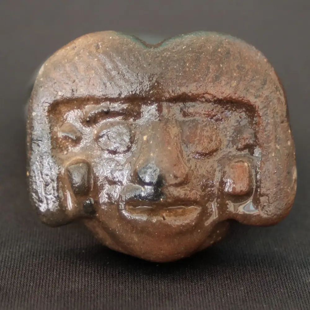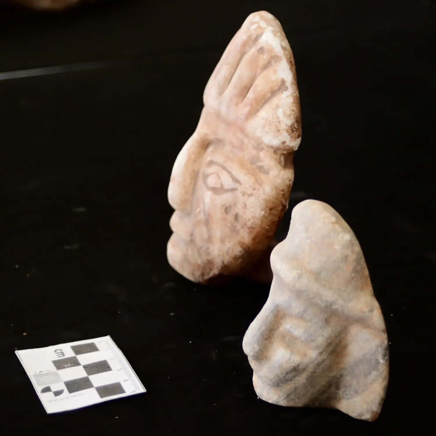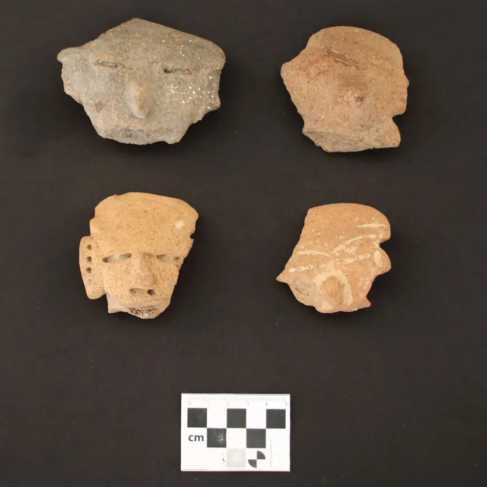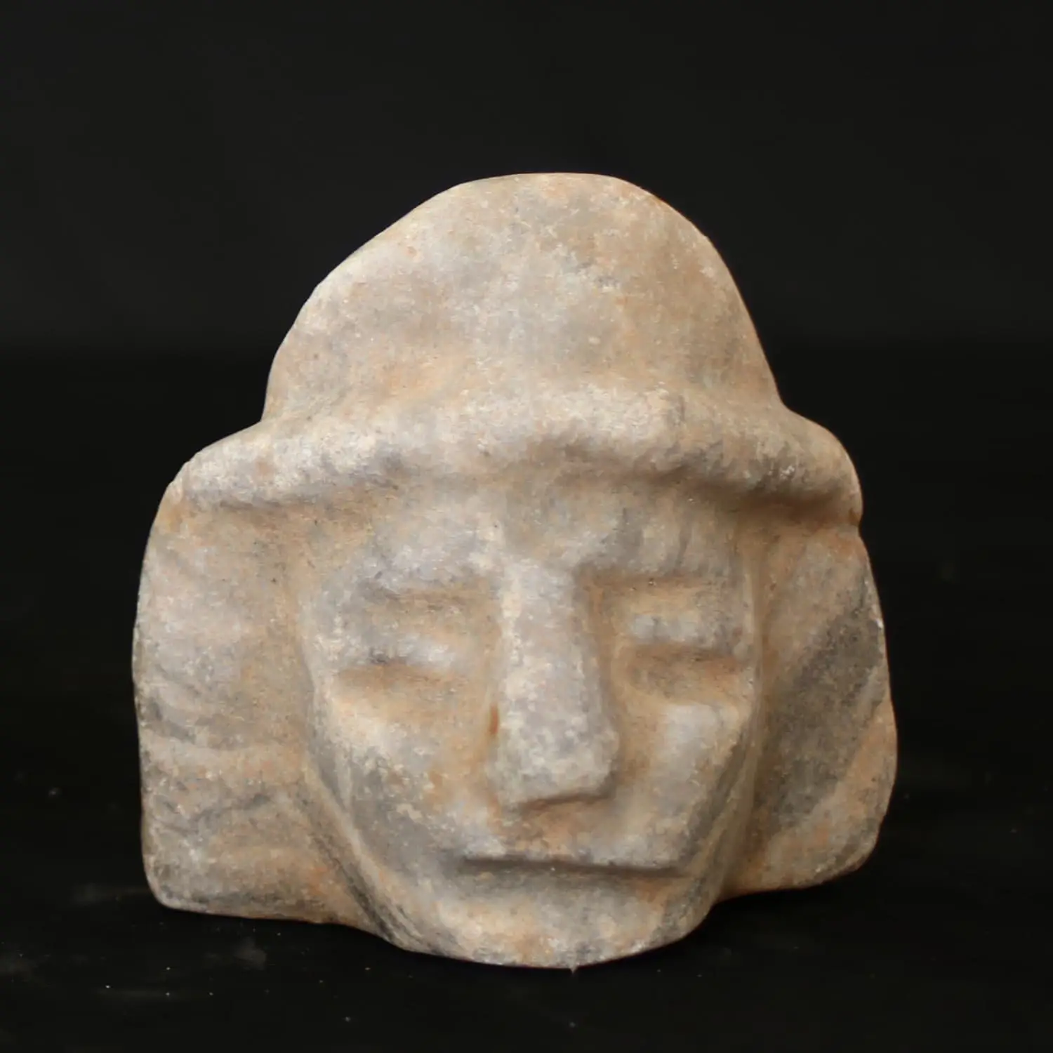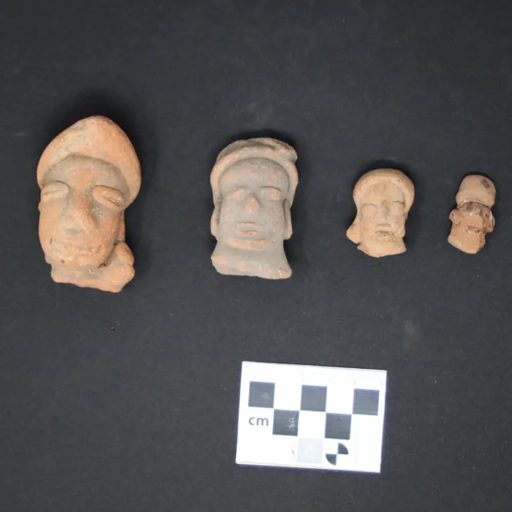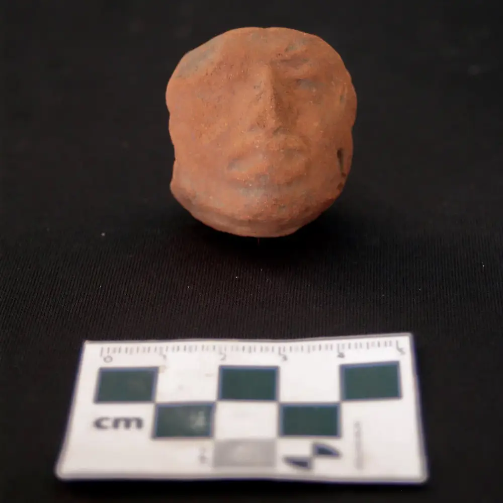 Cabeza de figurilla antropomorfa. Cerámica hecha con la técnica del barro modelado. Medidas aproximadas de 4 x 6cm. Fue encontrada en las excavaciones arqueológicas del Montículo 1 en la Zona de Monumentos de Ixtapa (Mountjoy 2003: PV-1). Está asociada a la fase Ixtapa Temprano (600 – 300a.C.). Se caracteriza por presentar la cabeza deformada tipo tabular erecta, con el rostro sumido y con las cejas unidas con la nariz que le da su peculiar expresión. Este fragmento de figurilla es una de las primeras representaciones de la figura humana encontradas arqueológicamente en la zona costera.