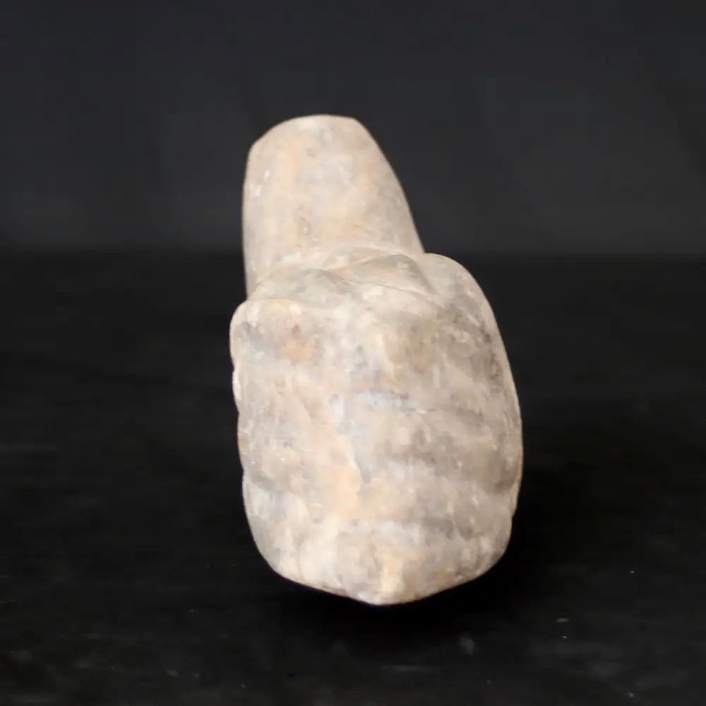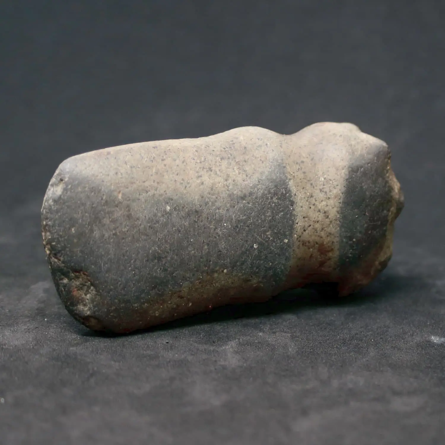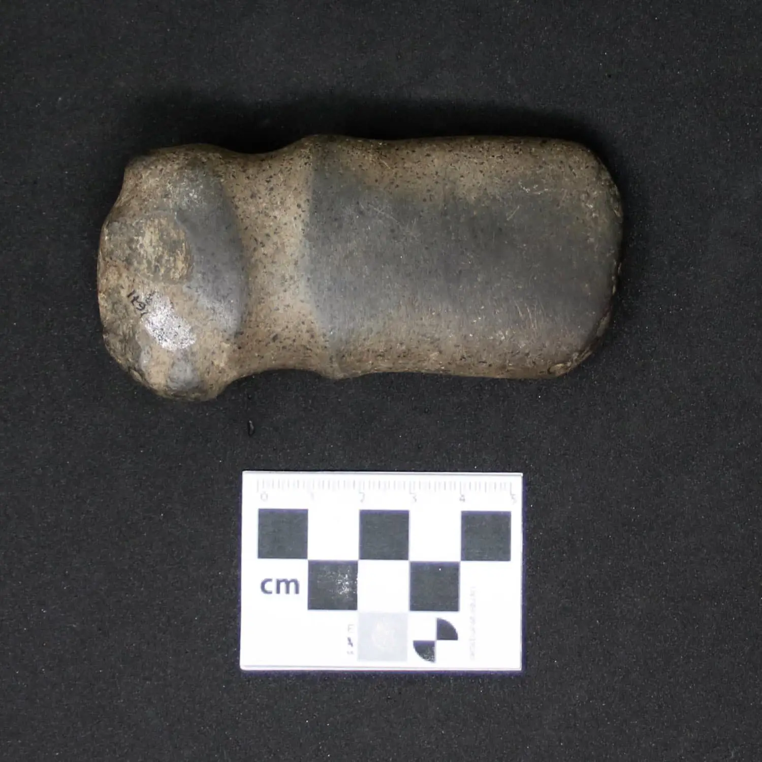 Hacha. Piedra trabajada con la técnica de tallado y pulido. Mide 10cm de largo y 7cm de ancho. Proviene de la colección Escuela Teresa Barba (REG-1671 PJ 128). Hacha llamada de “garganta” por la forma corrida del área de enmangue, la cual servía para montar el hacha en un mango de madera.