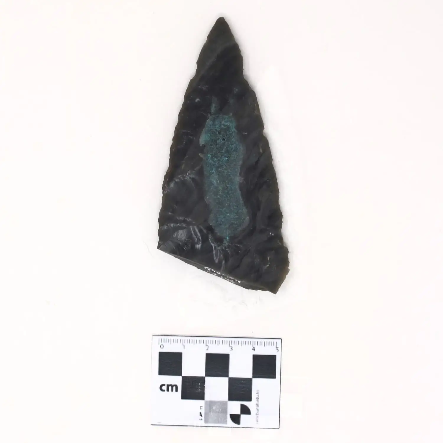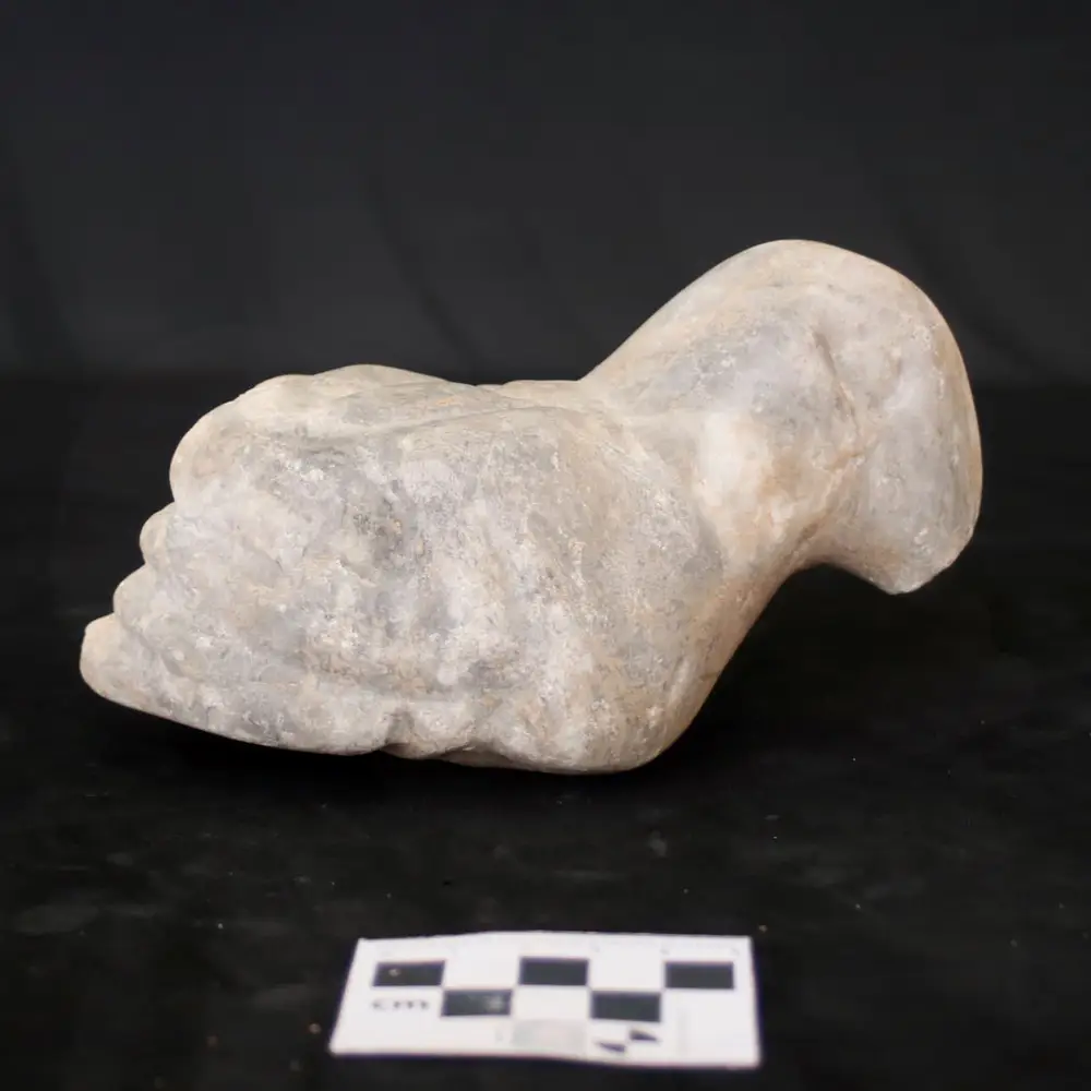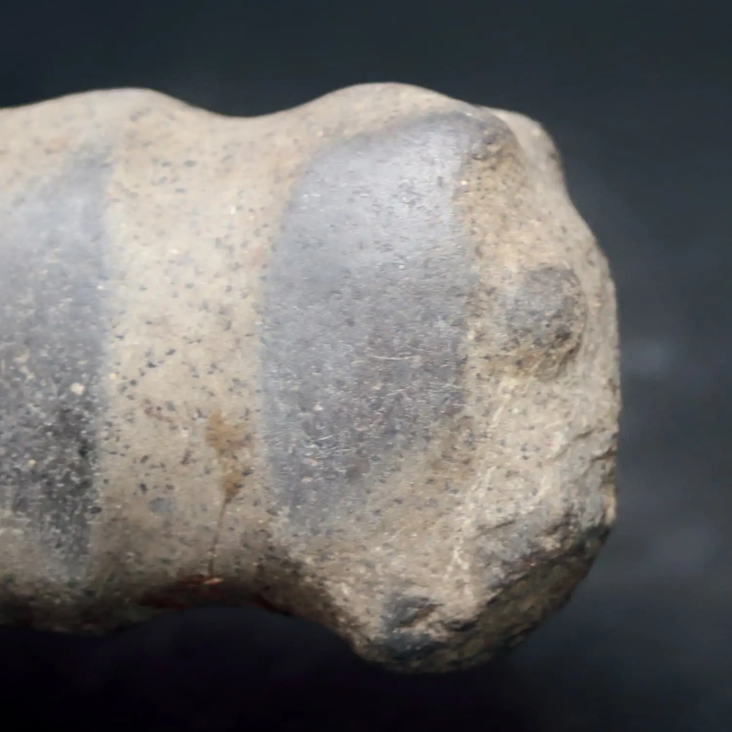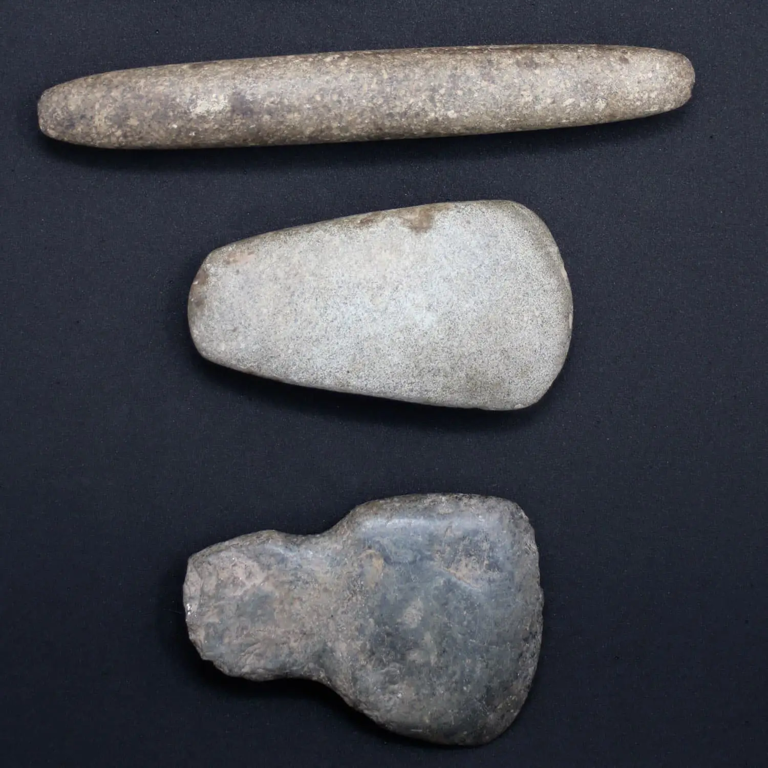 Hacha. Piedra trabajada con la técnica de tallado y pulido. Mide 10cm de largo y 7cm de ancho. Proviene de la colección Escuela Teresa Barba (REG-1671 PJ 128). Hacha llamada de “garganta” por la forma corrida del área de enmangue, la cual servía para montar el hacha en un mango de madera.