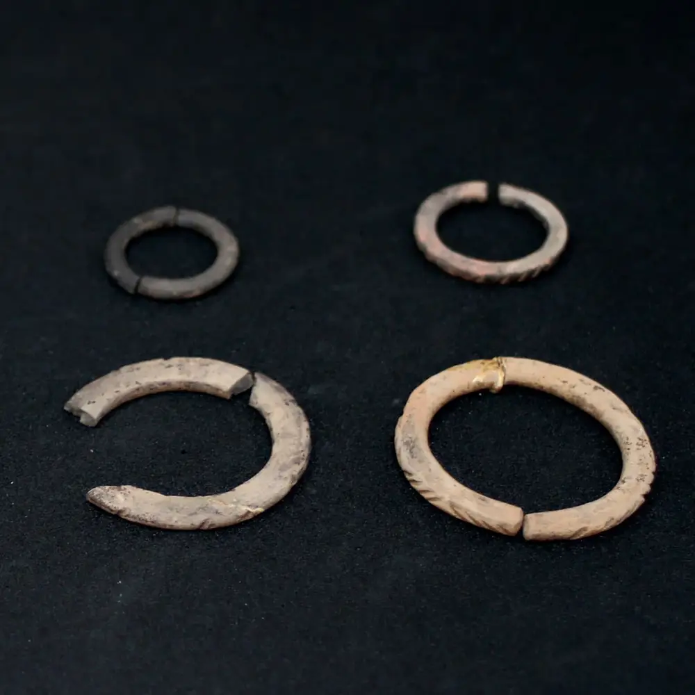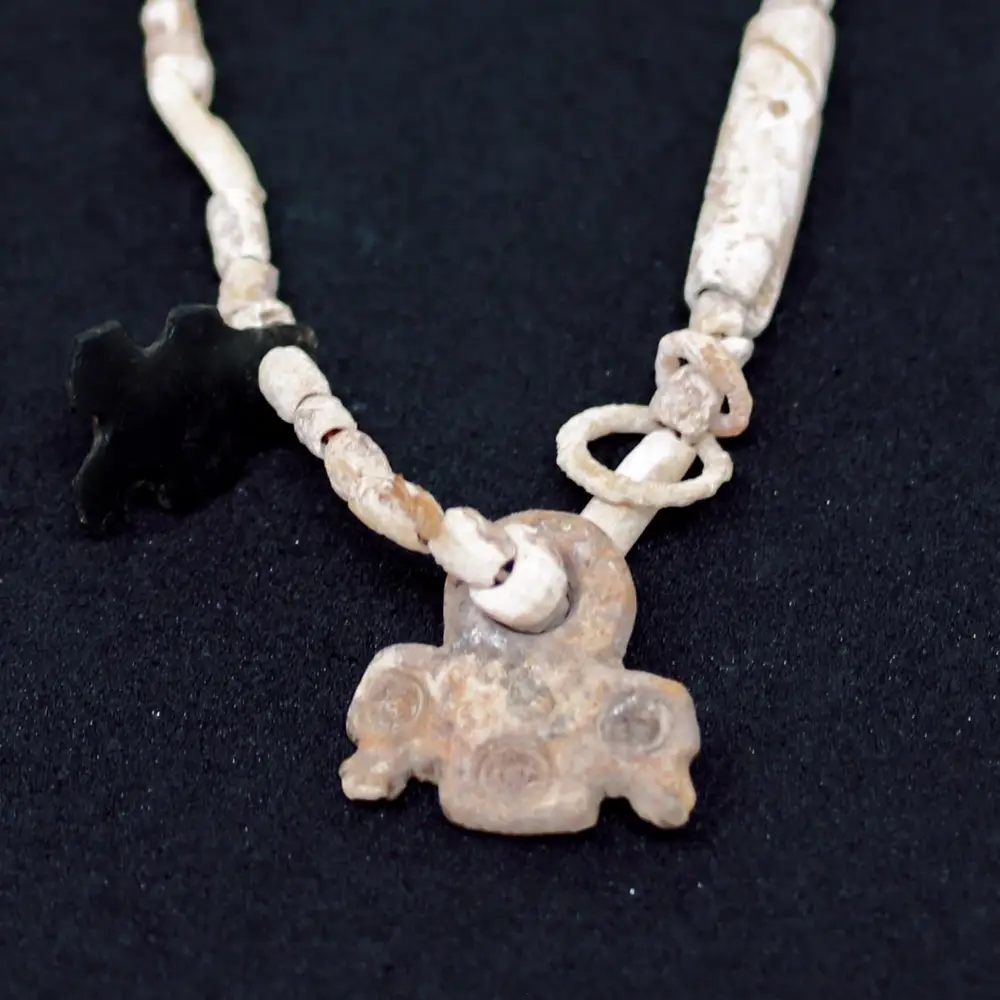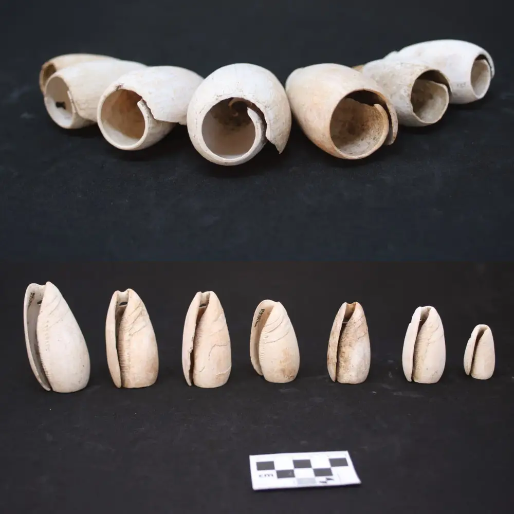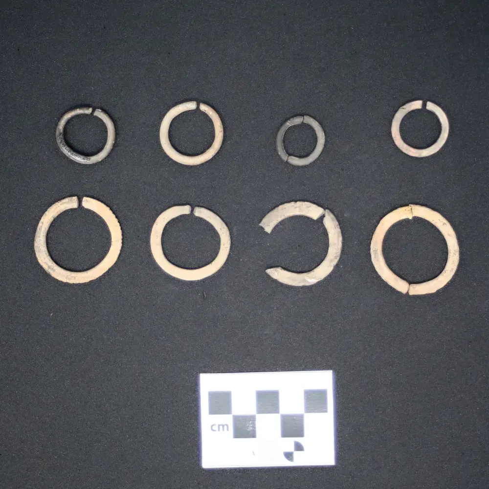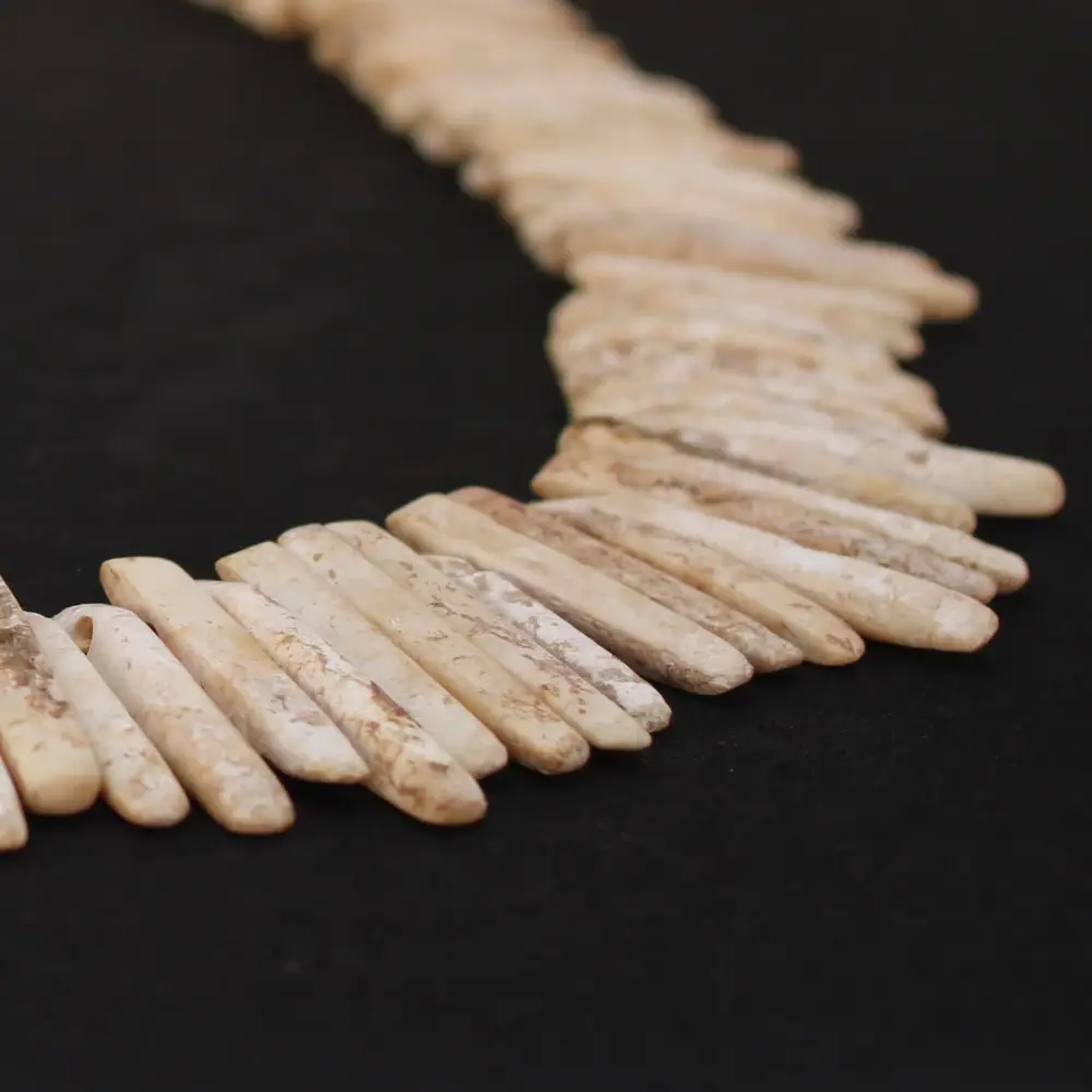 Pendientes de concha. Moluscos de la familia Conidae trabajados con la técnica de corte y abrasión. Tienen unas medidas entre los 5 y 7 cm de largo. Proviene de la colección Escuela Teresa Barba (REG-1671 PJ 159). Asociados a las fases Aztatlán-Banderas (900 – 1600d.C.). Los conos (caracoles) presentan un corte con el cual se le retiró todo la espira, además tiene en el otro extremo un corte en forma de acanaladura para poder engarzarse.