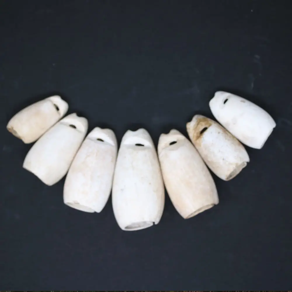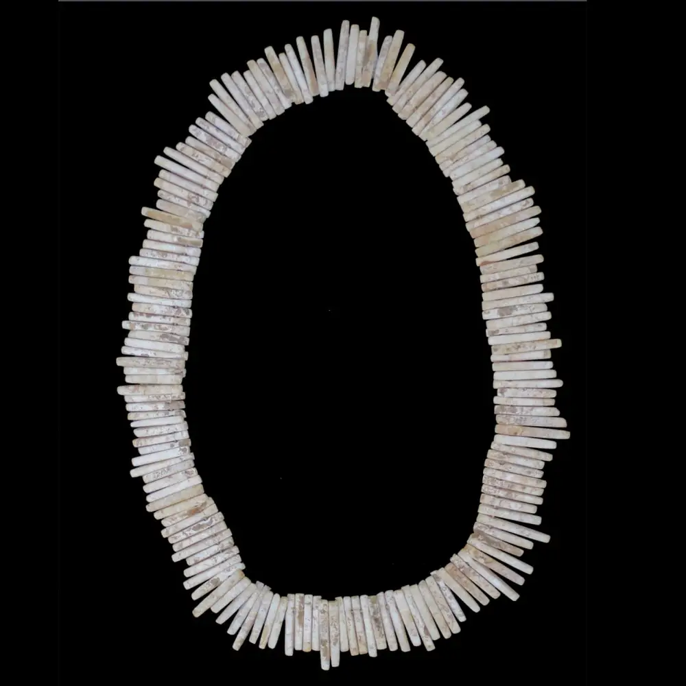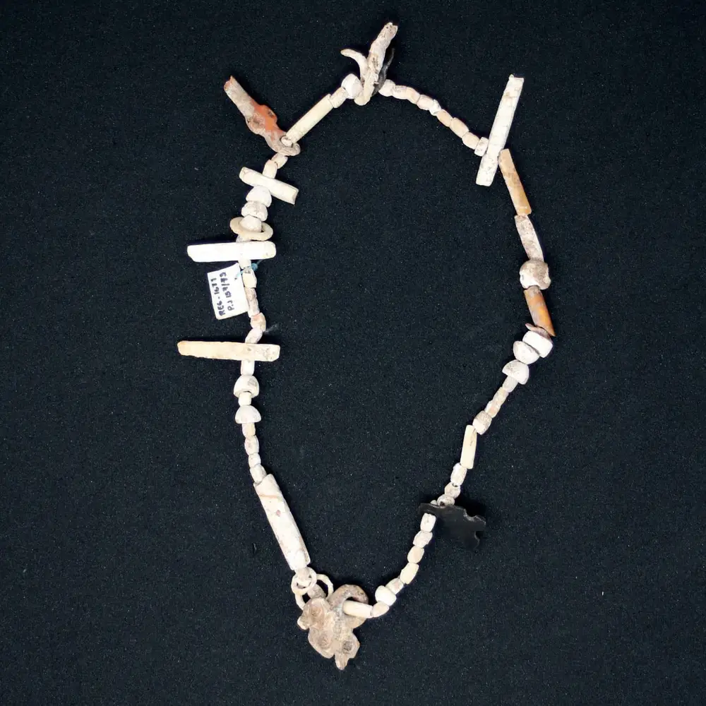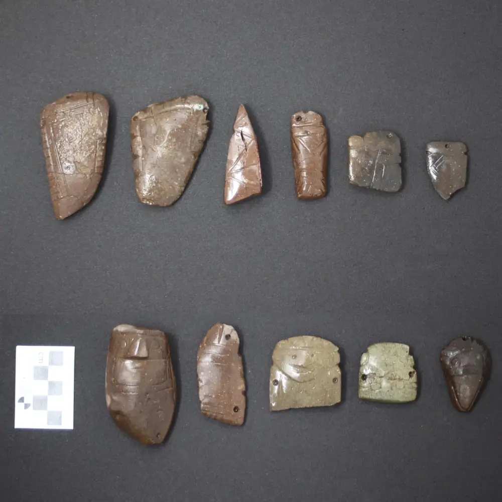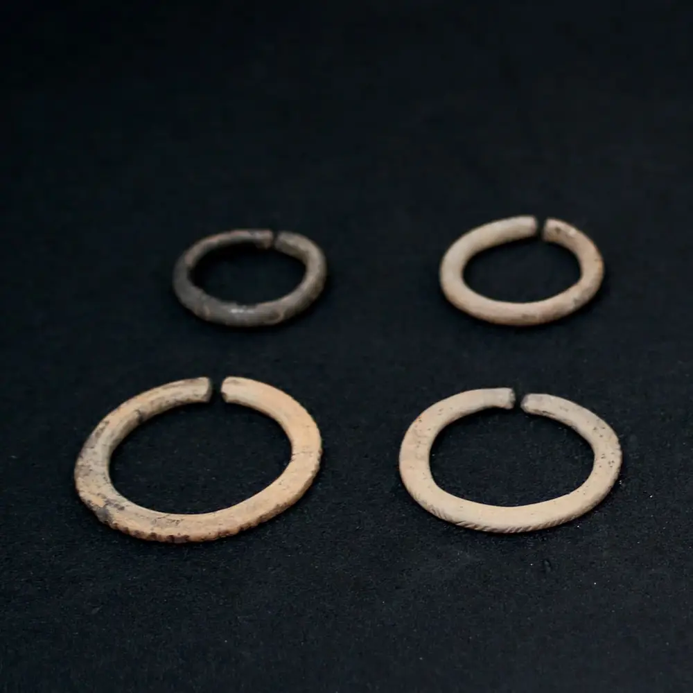 Pendientes de concha. Moluscos de la familia Conidae trabajados con la técnica de corte y abrasión. Tienen unas medidas entre los 5 y 7 cm de largo. Proviene de la colección Escuela Teresa Barba (REG-1671 PJ 159). Asociados a las fases Aztatlán-Banderas (900 – 1600d.C.). Los conos (caracoles) presentan un corte con el cual se le retiró todo la espira, además tiene en el otro extremo un corte en forma de acanaladura para poder engarzarse.