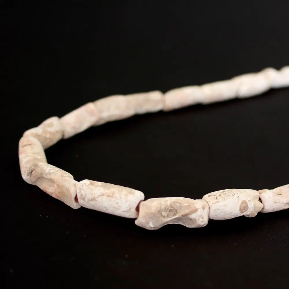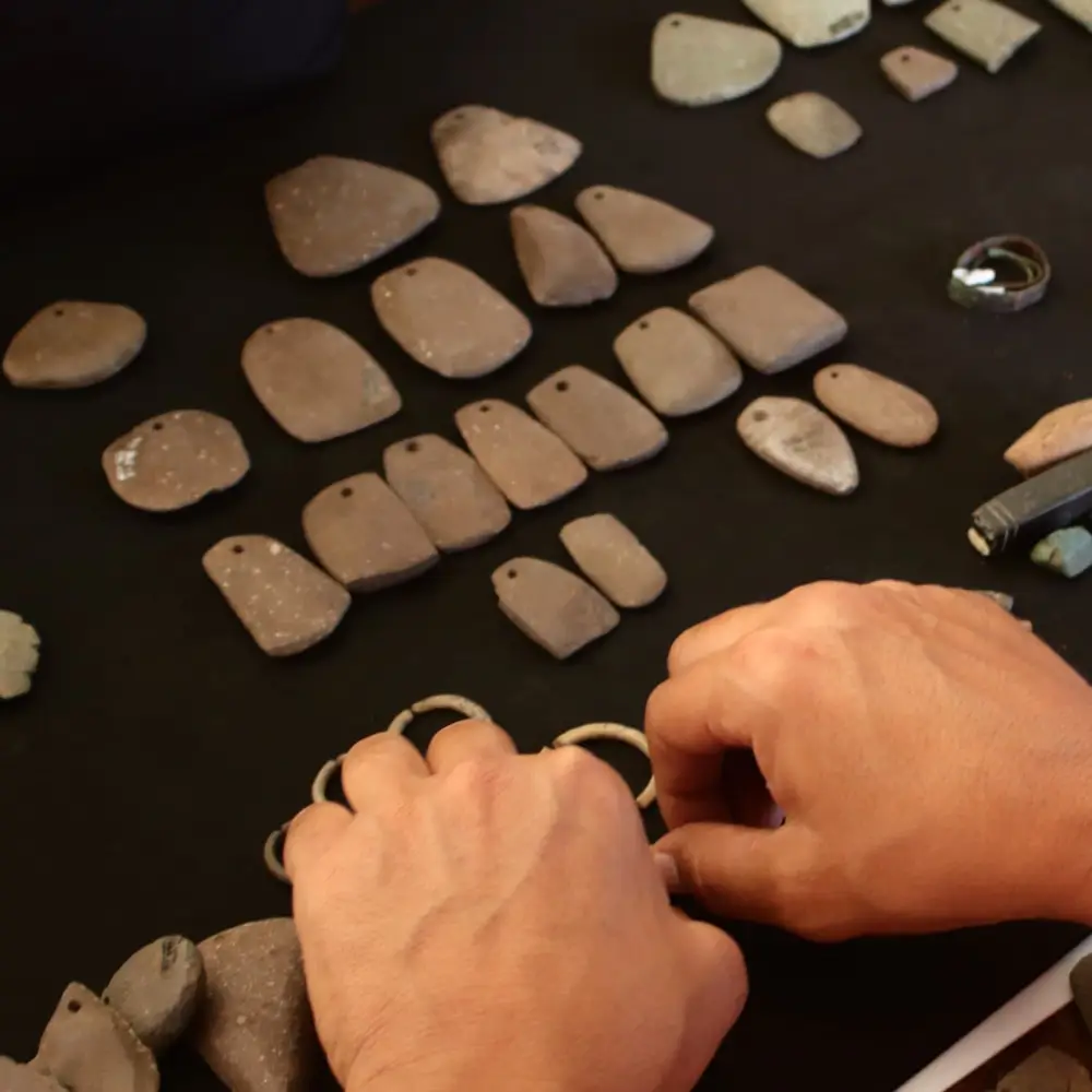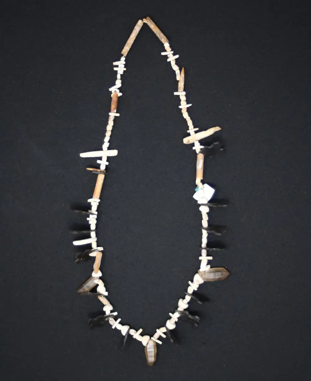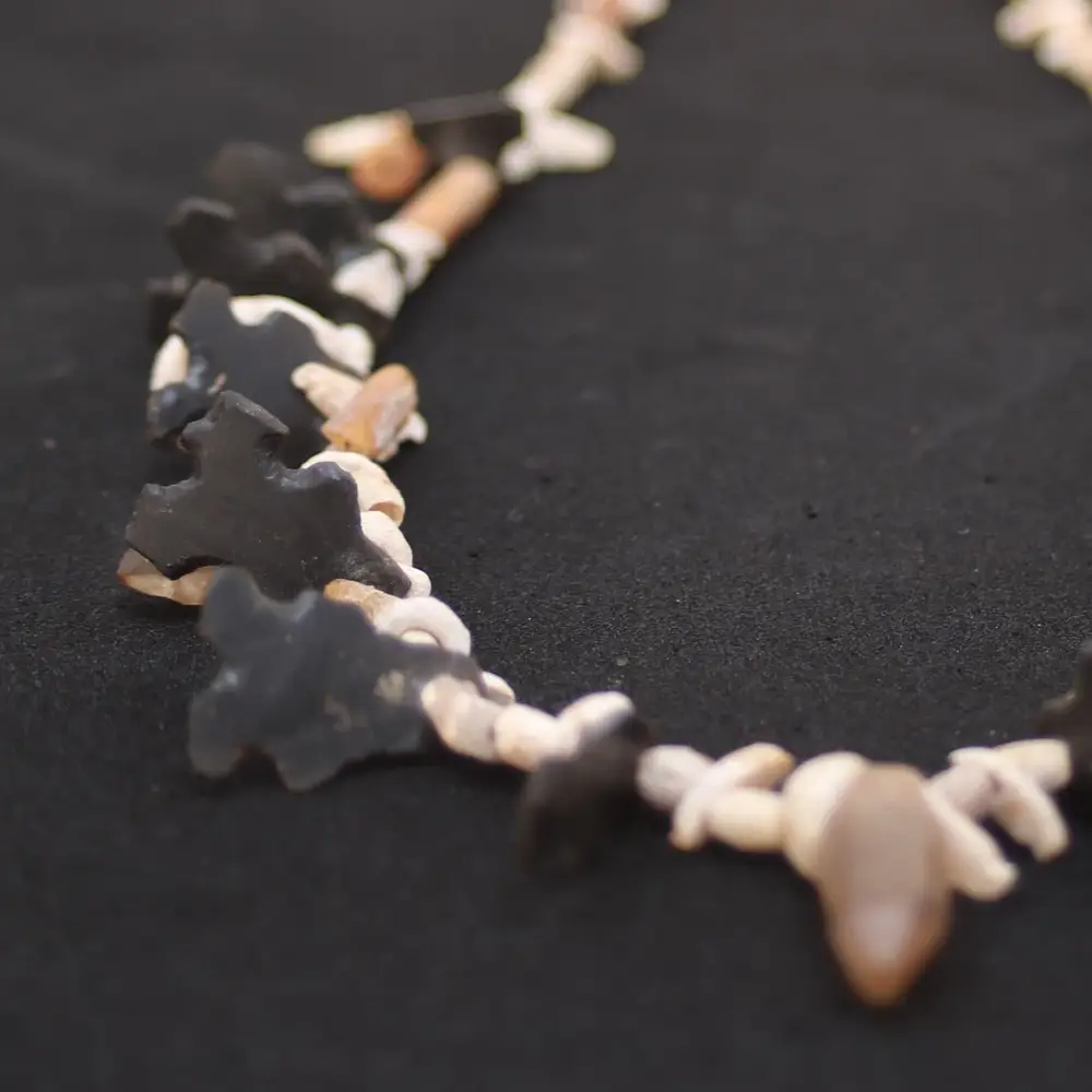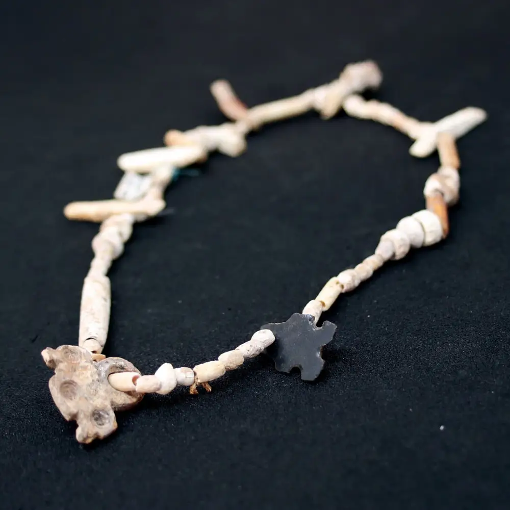 Pendientes de concha. Moluscos de la familia Conidae trabajados con la técnica de corte y abrasión. Tienen unas medidas entre los 5 y 7 cm de largo. Proviene de la colección Escuela Teresa Barba (REG-1671 PJ 159). Asociados a las fases Aztatlán-Banderas (900 – 1600d.C.). Los conos (caracoles) presentan un corte con el cual se le retiró todo la espira, además tiene en el otro extremo un corte en forma de acanaladura para poder engarzarse.