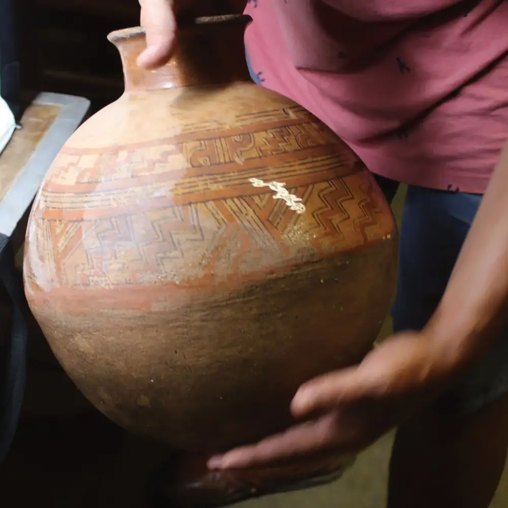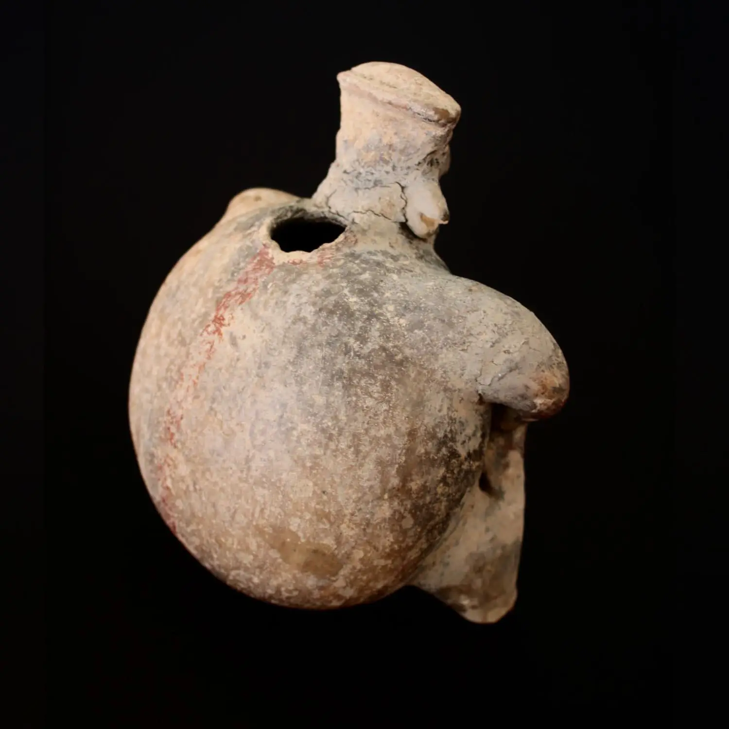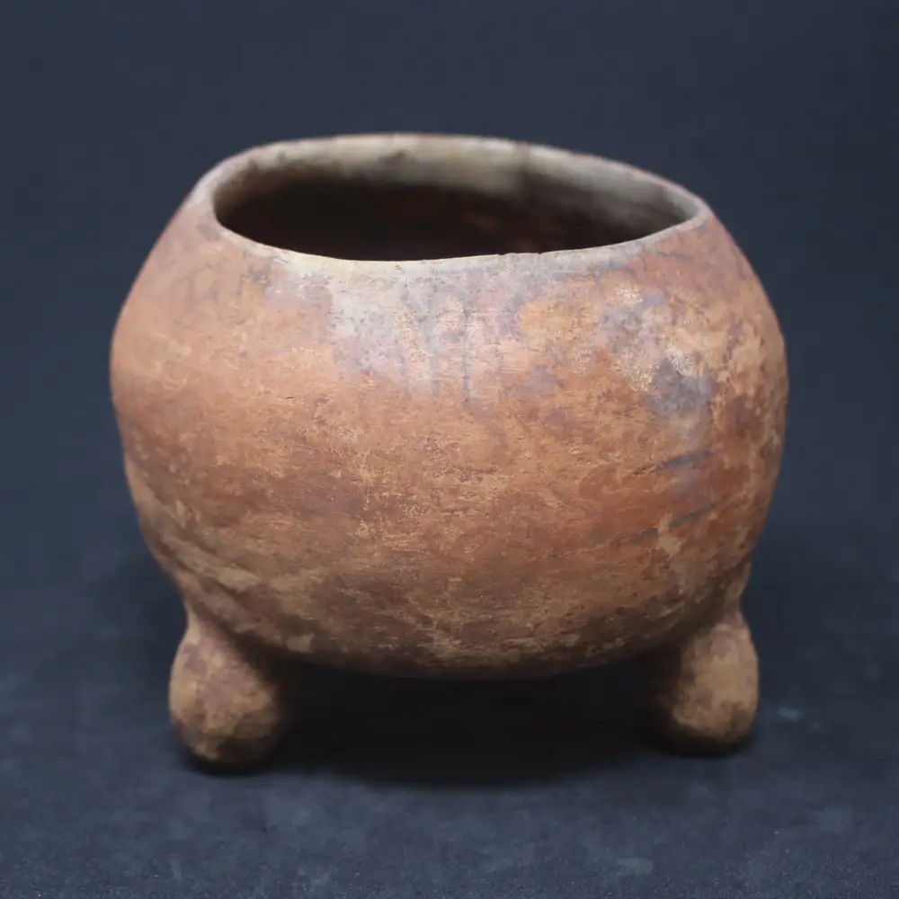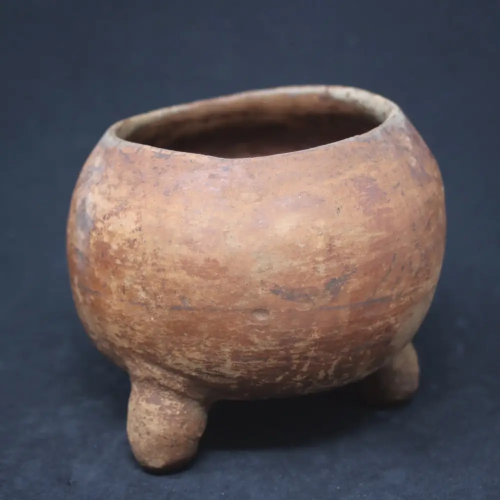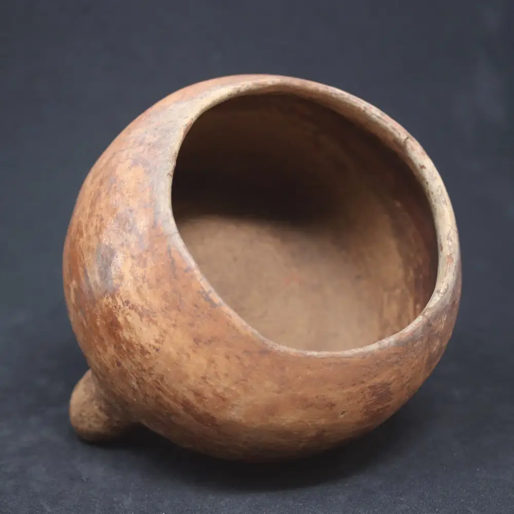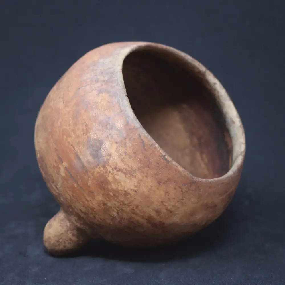 Vaso chocolatero. Cerámica hecha con la técnica de enrolladoraspado, engobe y pulido. Mide 25 cm de altura y 17 cm de ancho. Proviene de las excavaciones arqueológicas del sitio El Ranchito (Mountjoy 2003: PV–33). Asociado a la fase Banderas (900 – 1600d.C.). Vasija trípode de color anaranjado la cual muestra huellas de su uso y además muestra evidencias de haber sido reparada, ya que cuenta con un par de orificios que sirvieron para sujetar el fragmento quebrado. La vasija terminó utilizada como urna funeraria.