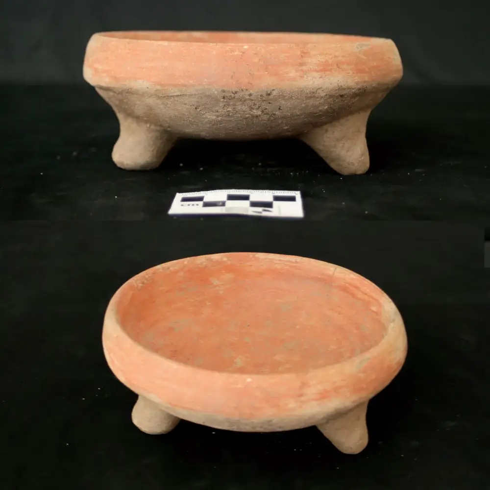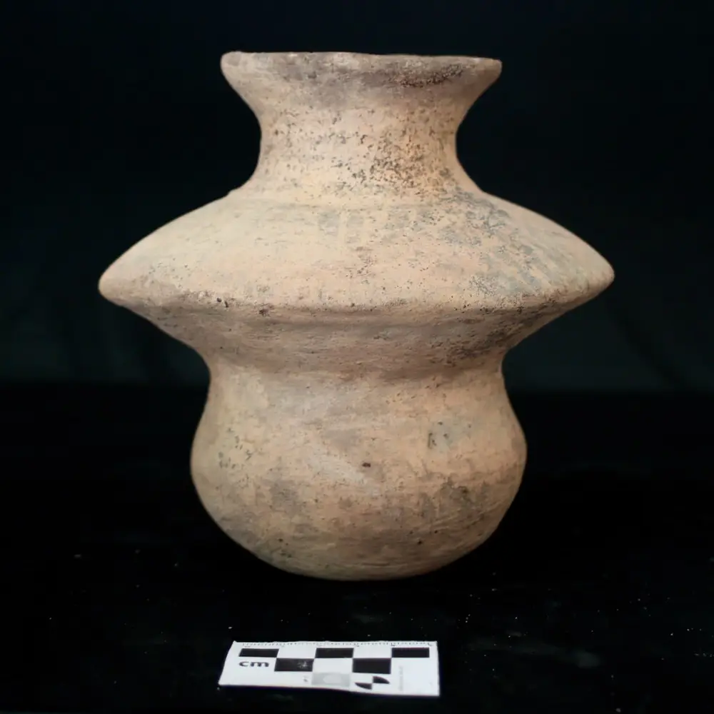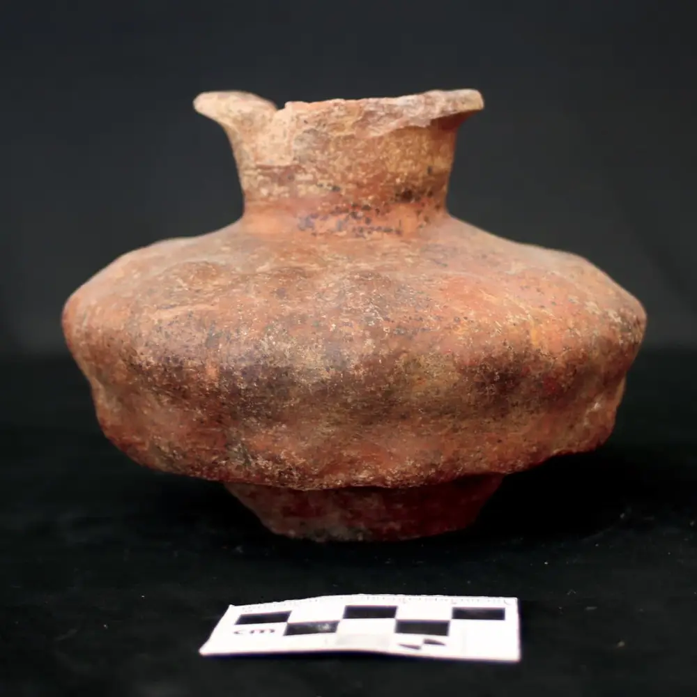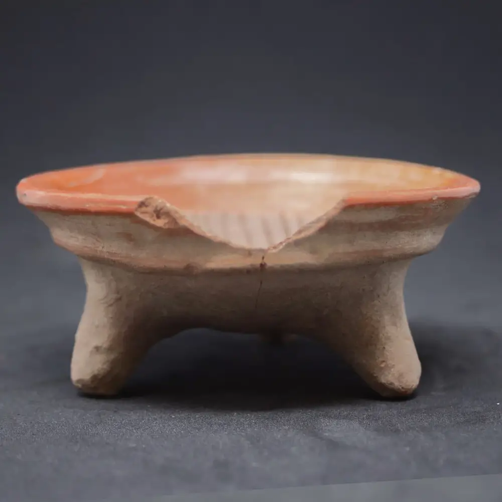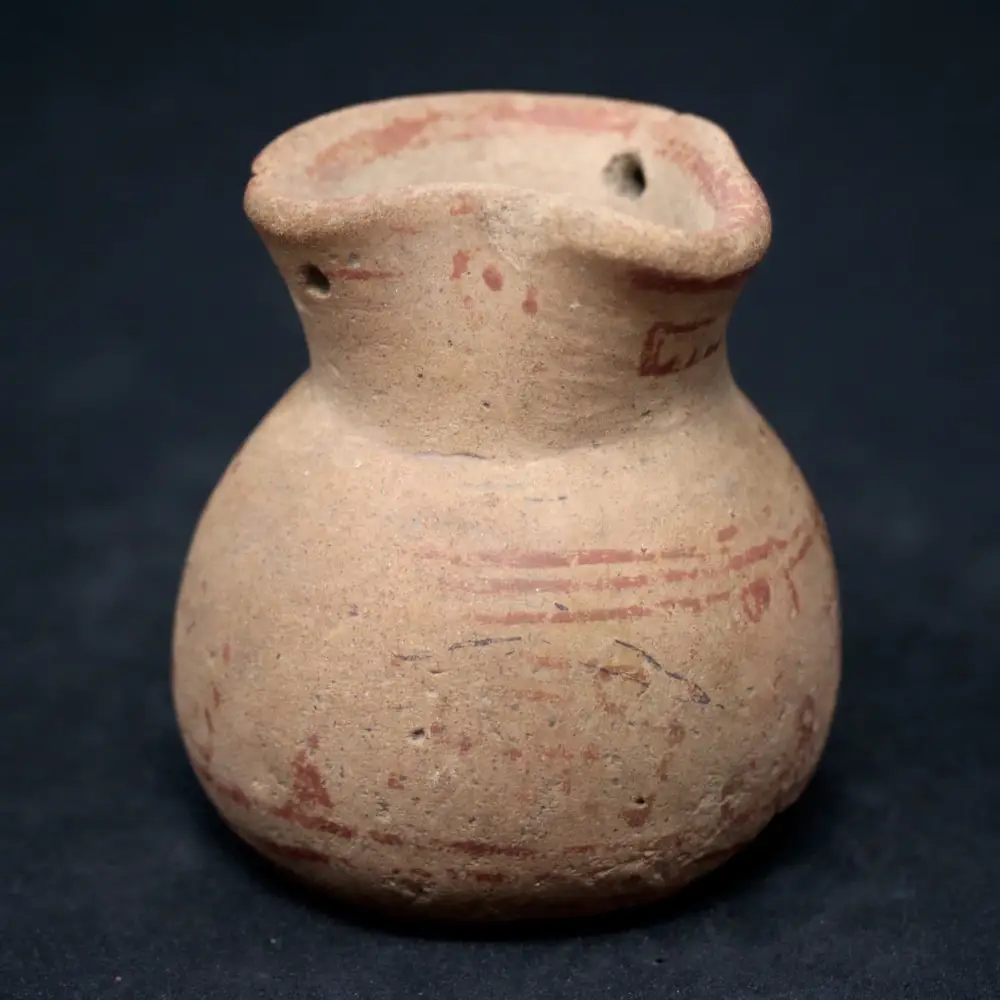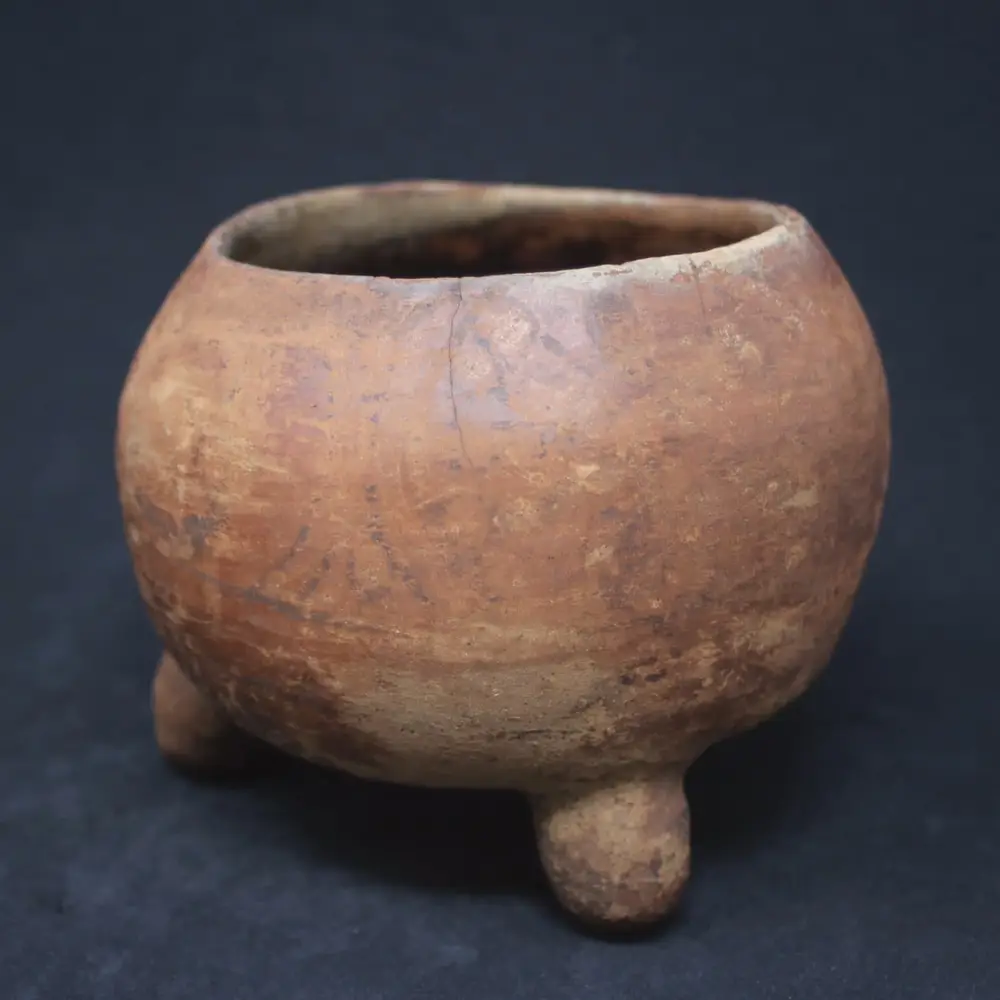 Vaso chocolatero. Cerámica hecha con la técnica de enrolladoraspado, engobe y pulido. Mide 25 cm de altura y 17 cm de ancho. Proviene de las excavaciones arqueológicas del sitio El Ranchito (Mountjoy 2003: PV–33). Asociado a la fase Banderas (900 – 1600d.C.). Vasija trípode de color anaranjado la cual muestra huellas de su uso y además muestra evidencias de haber sido reparada, ya que cuenta con un par de orificios que sirvieron para sujetar el fragmento quebrado. La vasija terminó utilizada como urna funeraria.