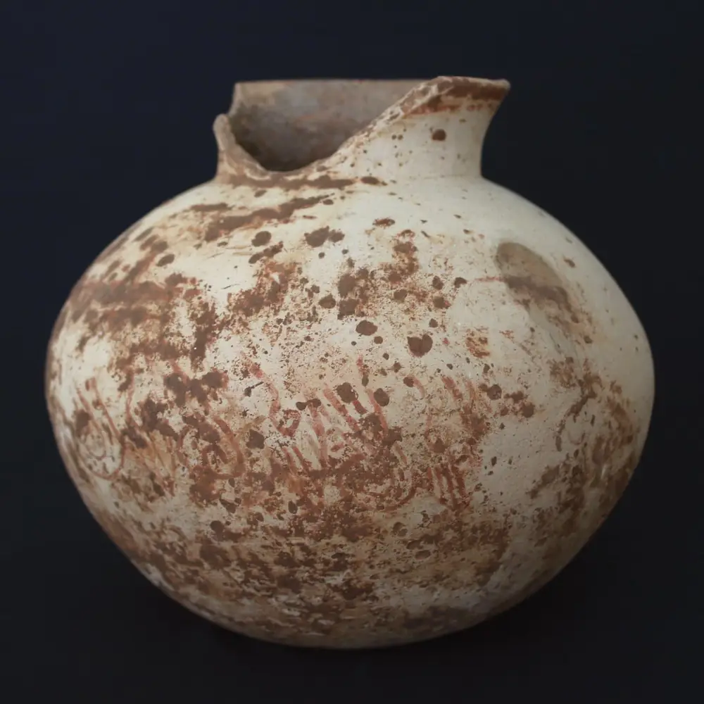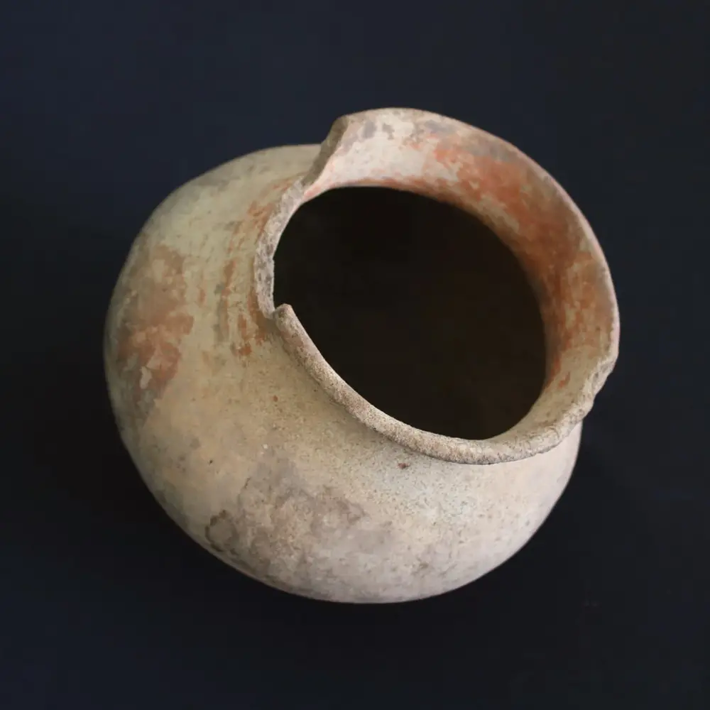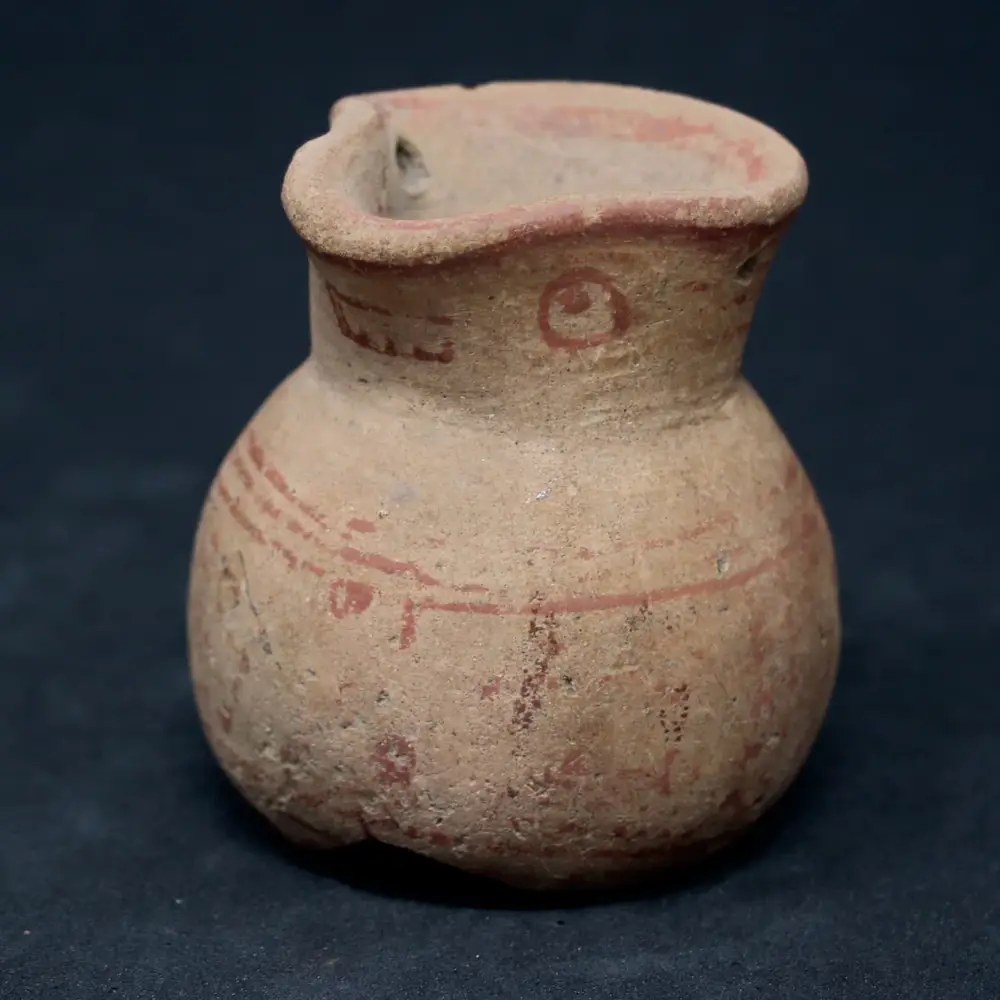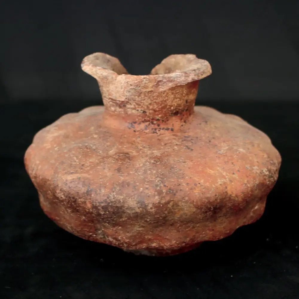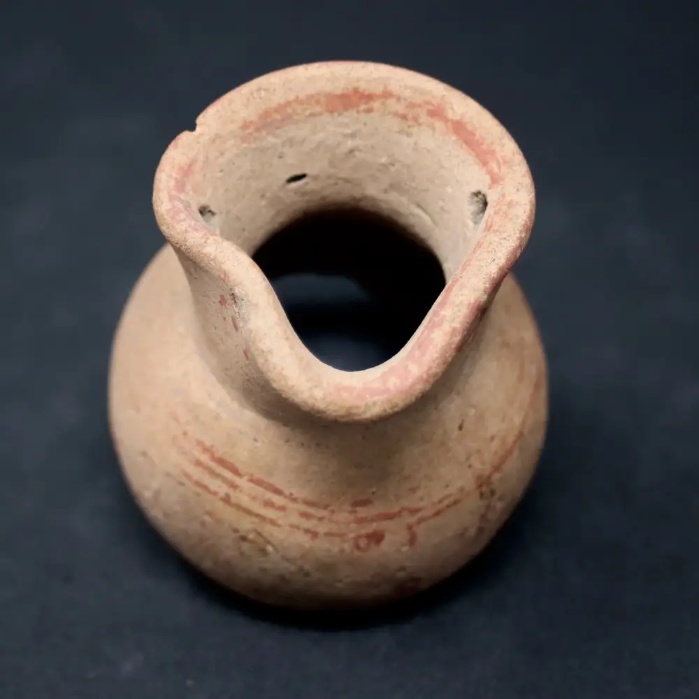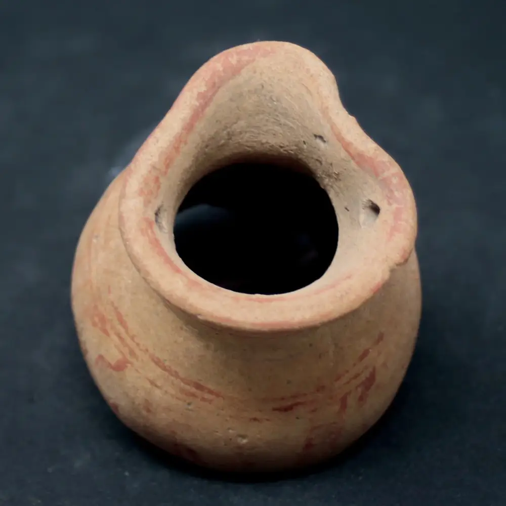 Vaso chocolatero. Cerámica hecha con la técnica de enrolladoraspado, engobe y pulido. Mide 25 cm de altura y 17 cm de ancho. Proviene de las excavaciones arqueológicas del sitio El Ranchito (Mountjoy 2003: PV–33). Asociado a la fase Banderas (900 – 1600d.C.). Vasija trípode de color anaranjado la cual muestra huellas de su uso y además muestra evidencias de haber sido reparada, ya que cuenta con un par de orificios que sirvieron para sujetar el fragmento quebrado. La vasija terminó utilizada como urna funeraria.
