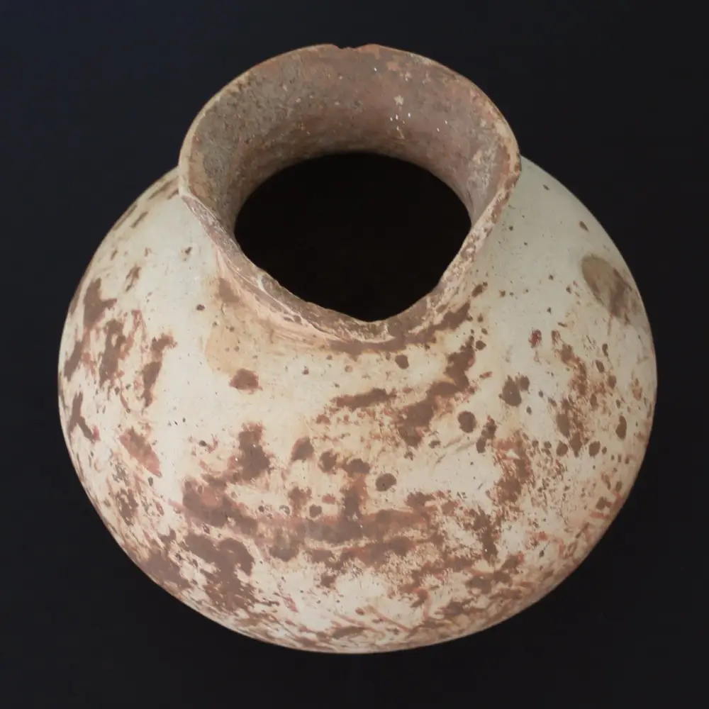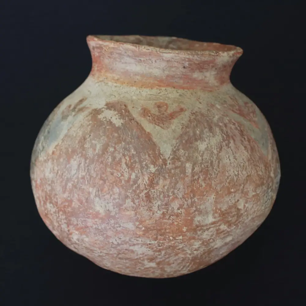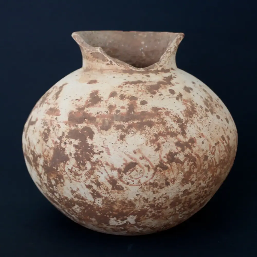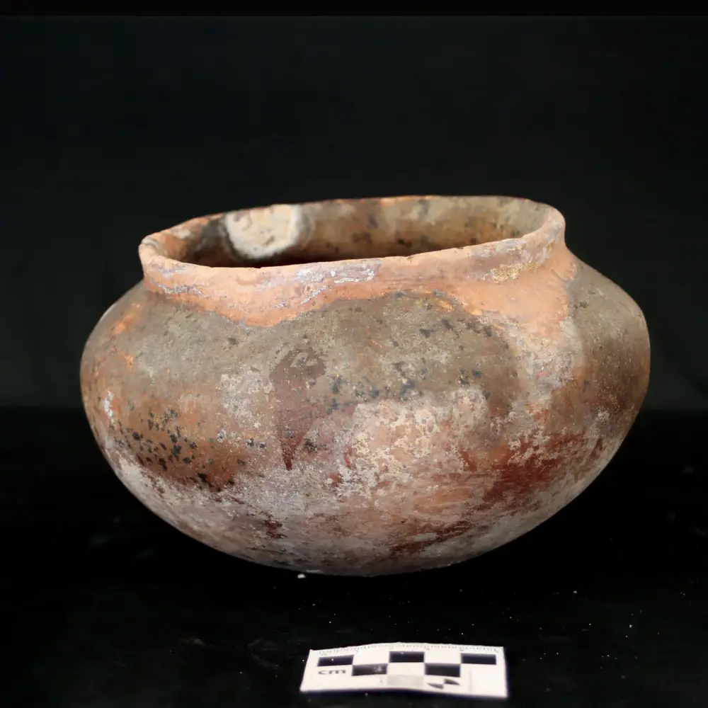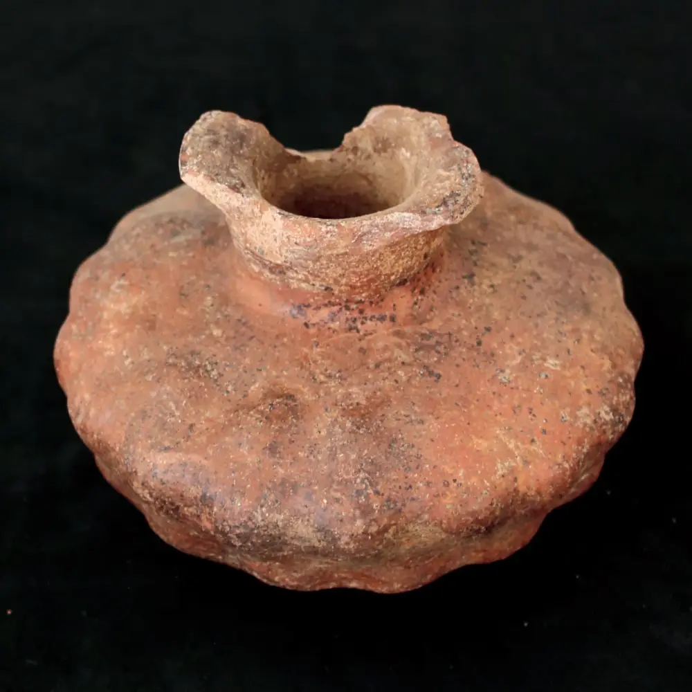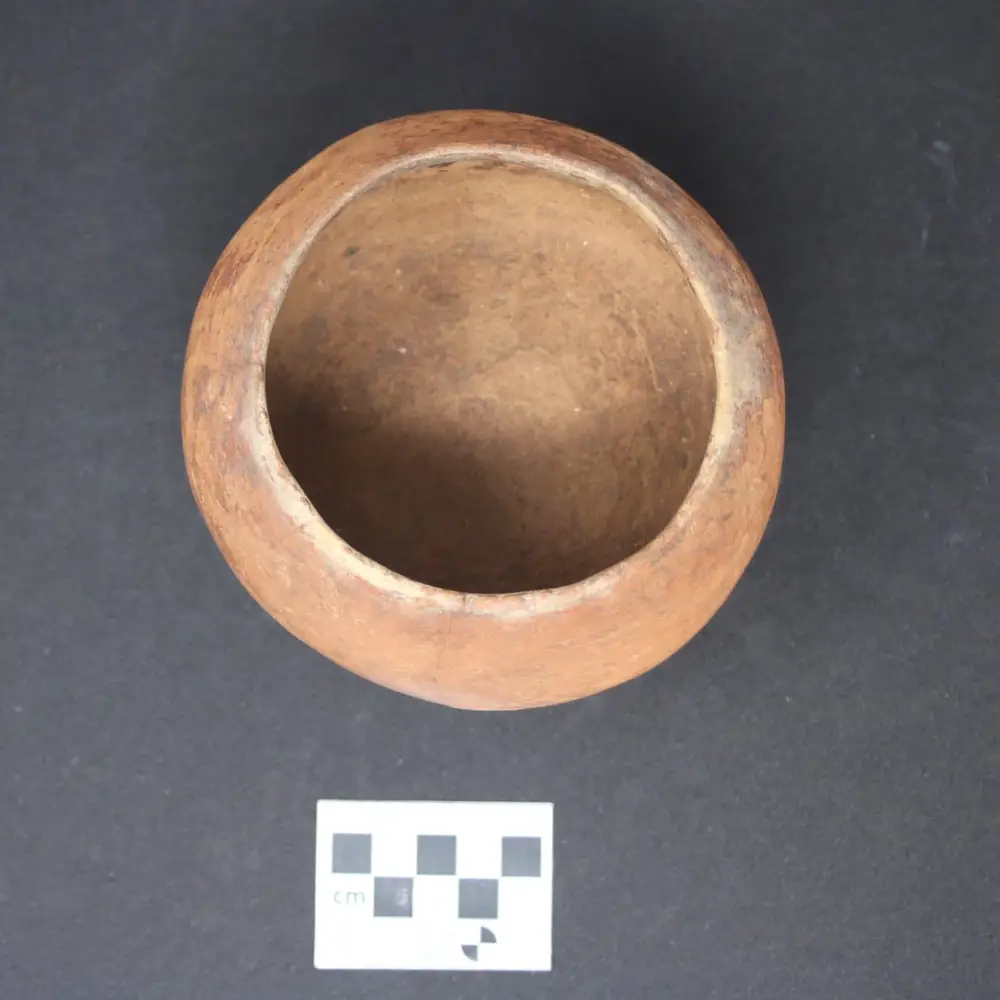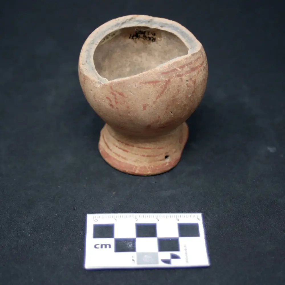 Vaso chocolatero. Cerámica hecha con la técnica de enrolladoraspado, engobe y pulido. Mide 25 cm de altura y 17 cm de ancho. Proviene de las excavaciones arqueológicas del sitio El Ranchito (Mountjoy 2003: PV–33). Asociado a la fase Banderas (900 – 1600d.C.). Vasija trípode de color anaranjado la cual muestra huellas de su uso y además muestra evidencias de haber sido reparada, ya que cuenta con un par de orificios que sirvieron para sujetar el fragmento quebrado. La vasija terminó utilizada como urna funeraria.