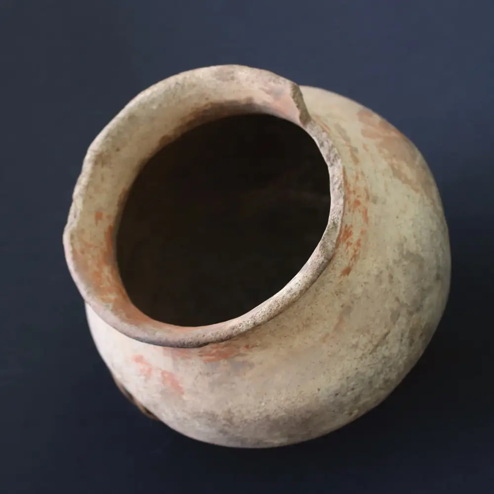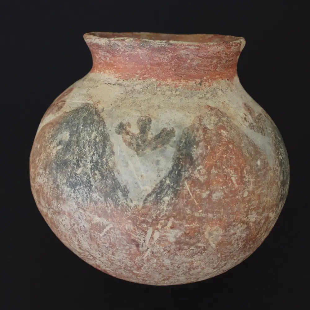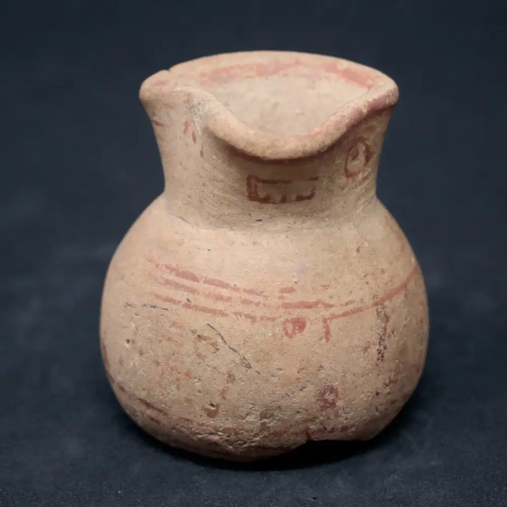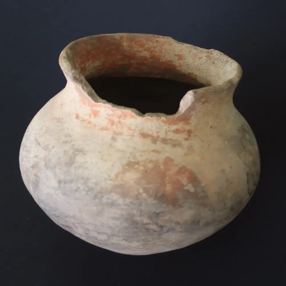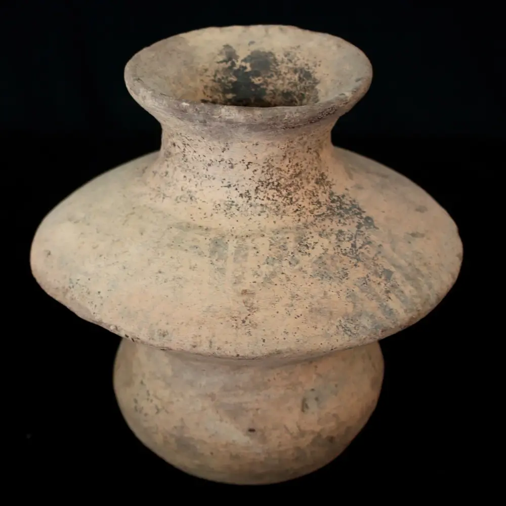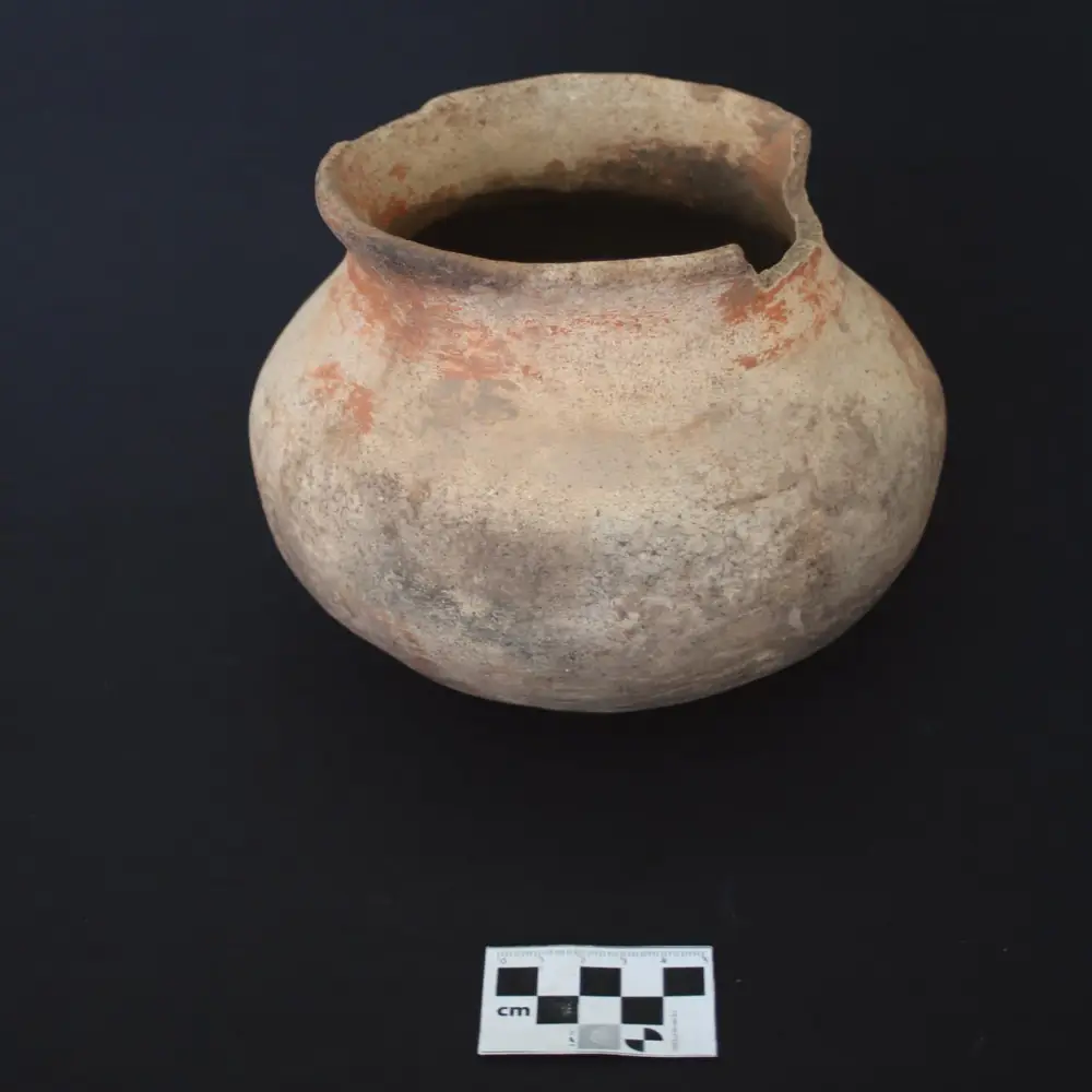 Vaso chocolatero. Cerámica hecha con la técnica de enrolladoraspado, engobe y pulido. Mide 25 cm de altura y 17 cm de ancho. Proviene de las excavaciones arqueológicas del sitio El Ranchito (Mountjoy 2003: PV–33). Asociado a la fase Banderas (900 – 1600d.C.). Vasija trípode de color anaranjado la cual muestra huellas de su uso y además muestra evidencias de haber sido reparada, ya que cuenta con un par de orificios que sirvieron para sujetar el fragmento quebrado. La vasija terminó utilizada como urna funeraria.