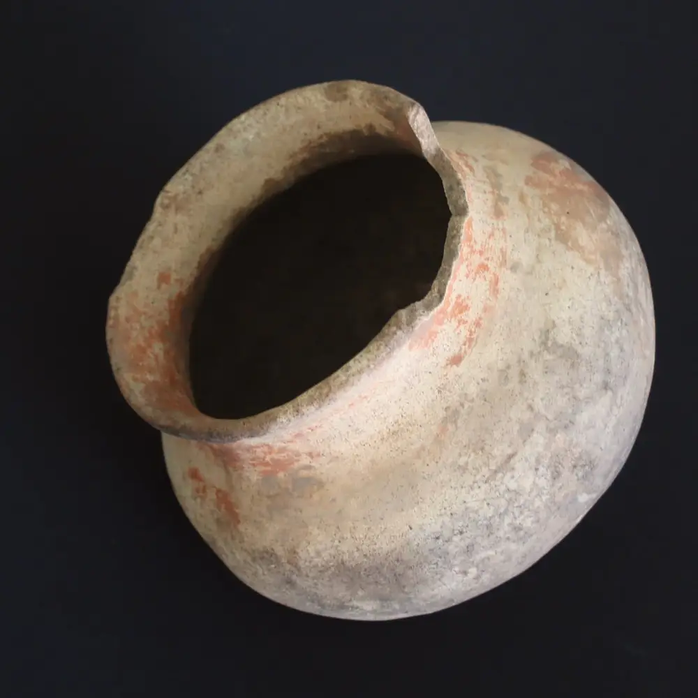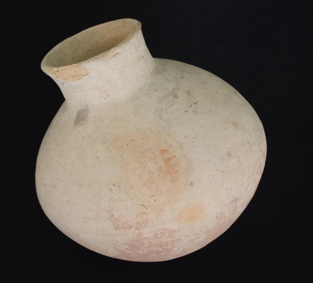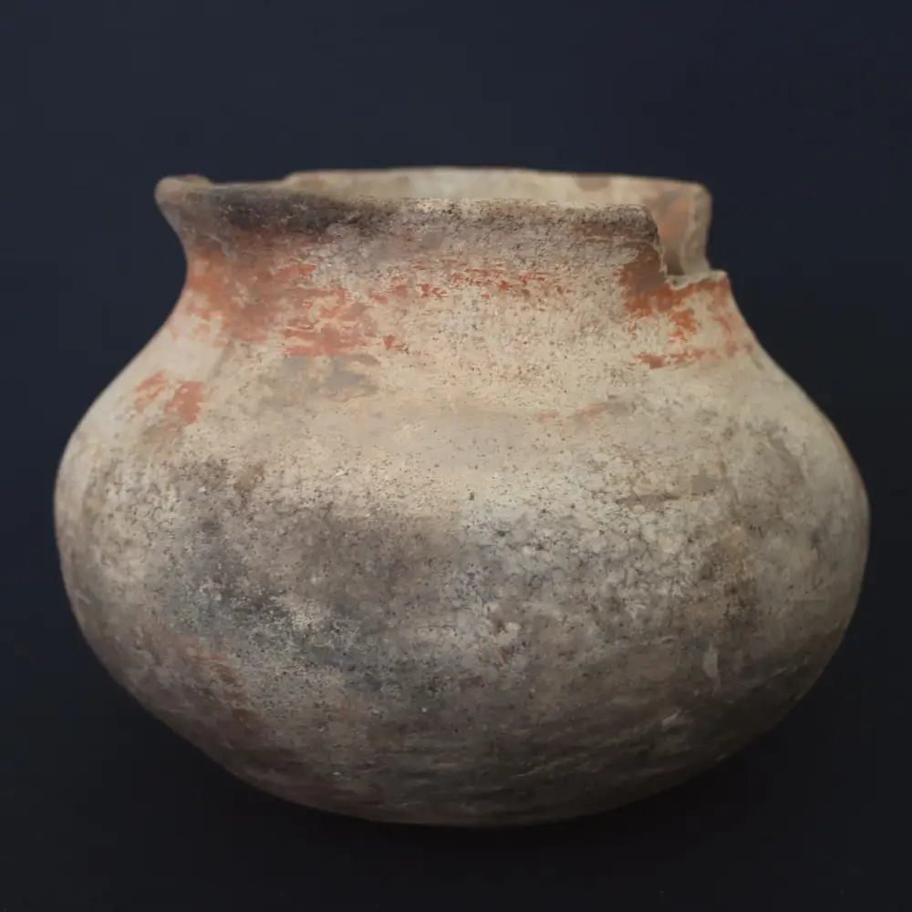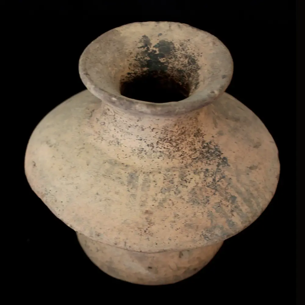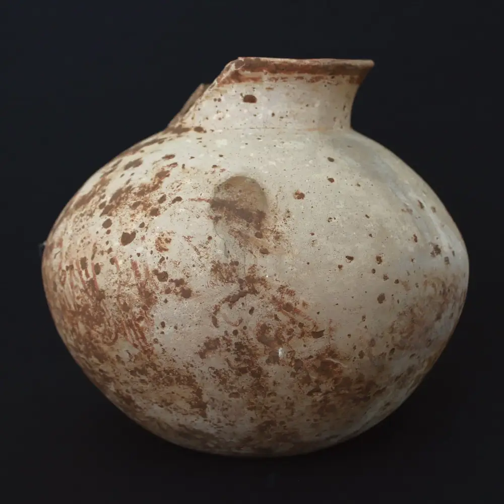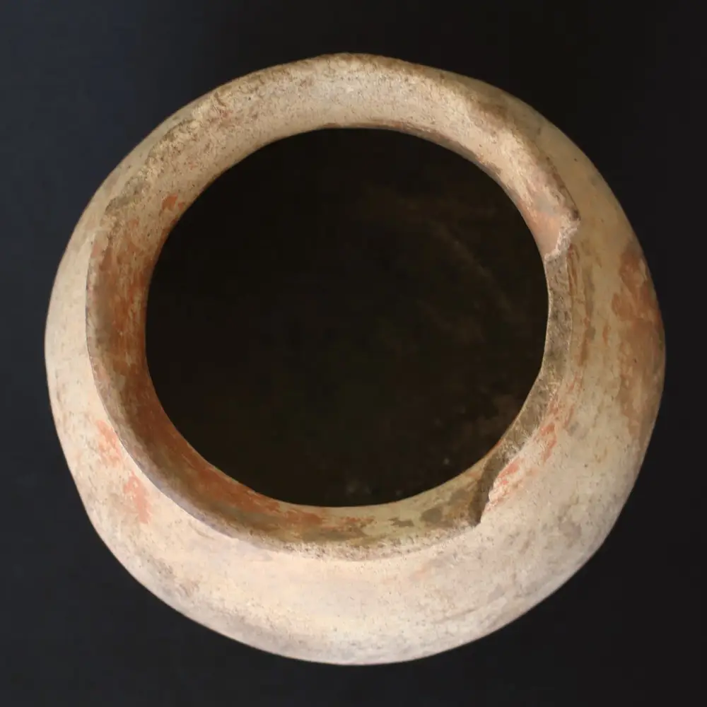 Vaso chocolatero. Cerámica hecha con la técnica de enrolladoraspado, engobe y pulido. Mide 25 cm de altura y 17 cm de ancho. Proviene de las excavaciones arqueológicas del sitio El Ranchito (Mountjoy 2003: PV–33). Asociado a la fase Banderas (900 – 1600d.C.). Vasija trípode de color anaranjado la cual muestra huellas de su uso y además muestra evidencias de haber sido reparada, ya que cuenta con un par de orificios que sirvieron para sujetar el fragmento quebrado. La vasija terminó utilizada como urna funeraria.