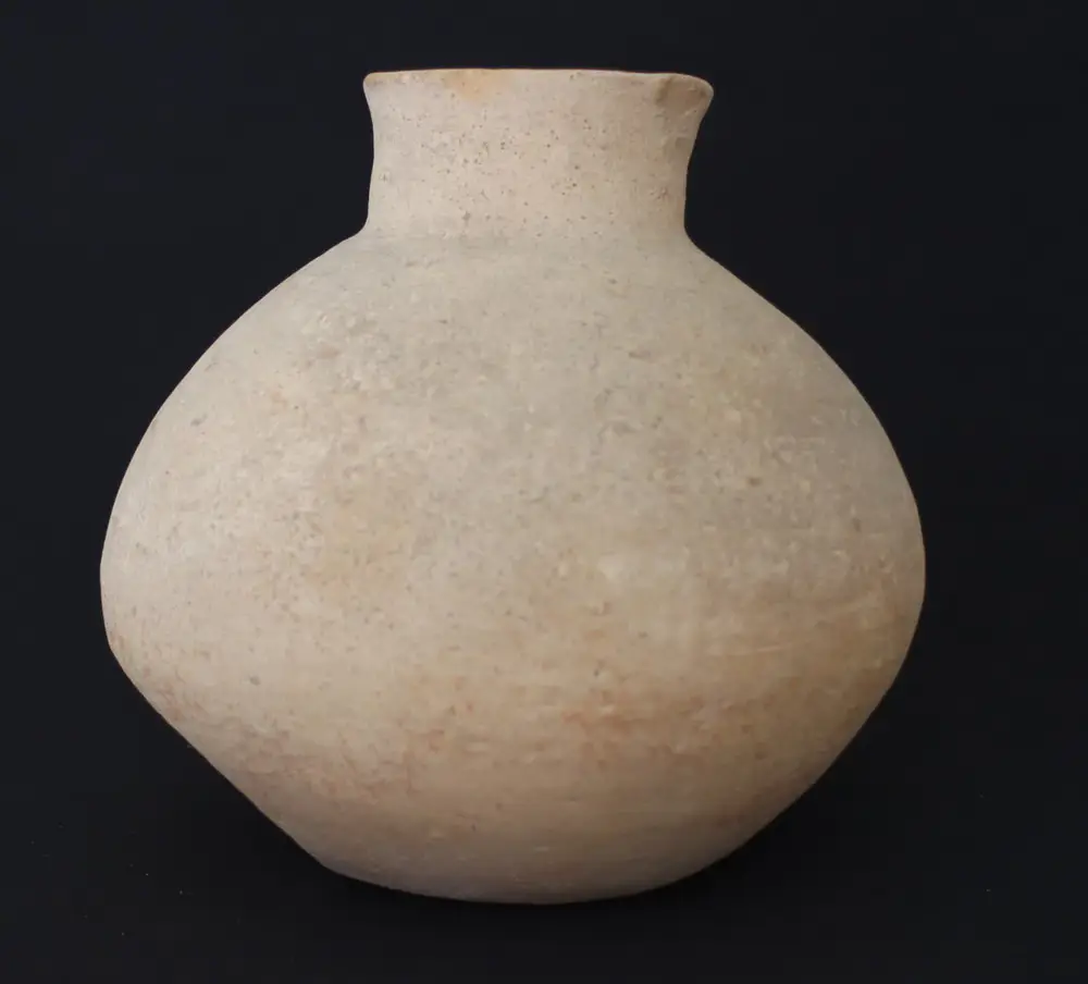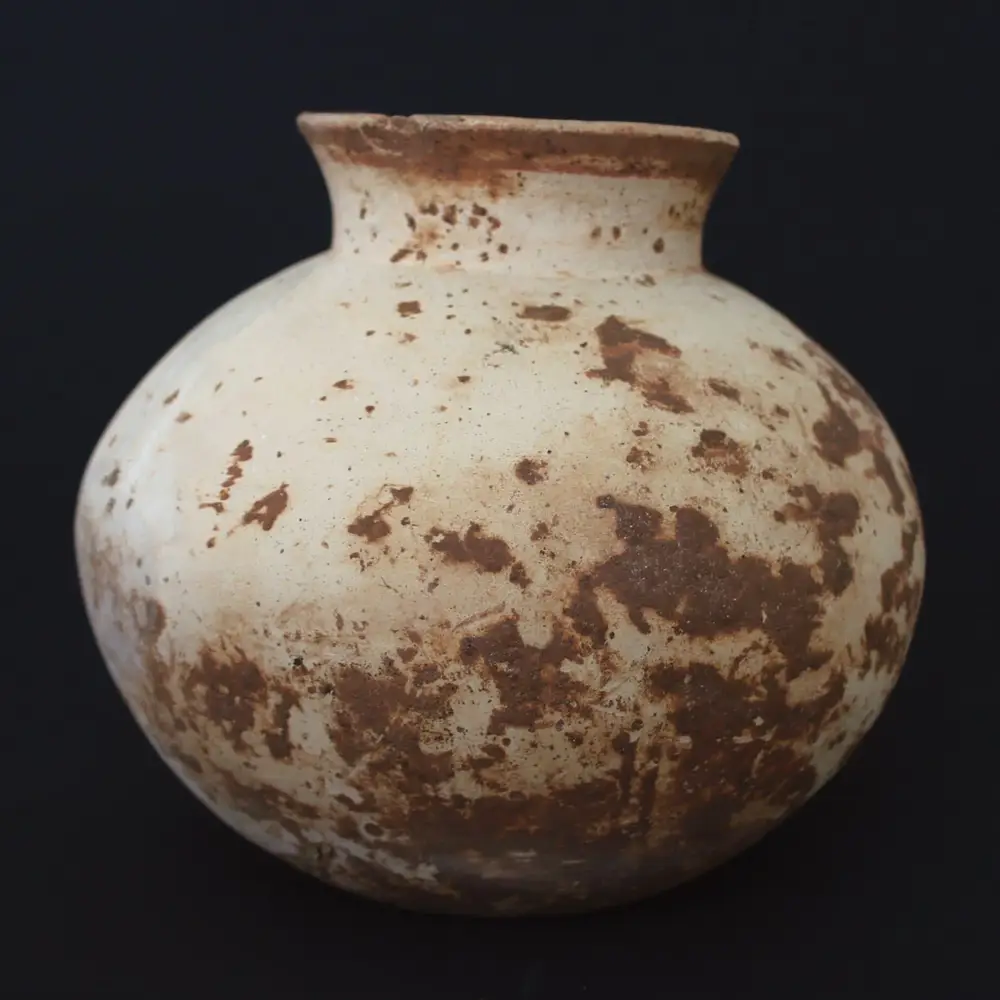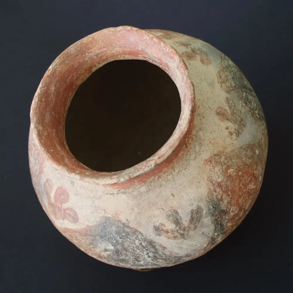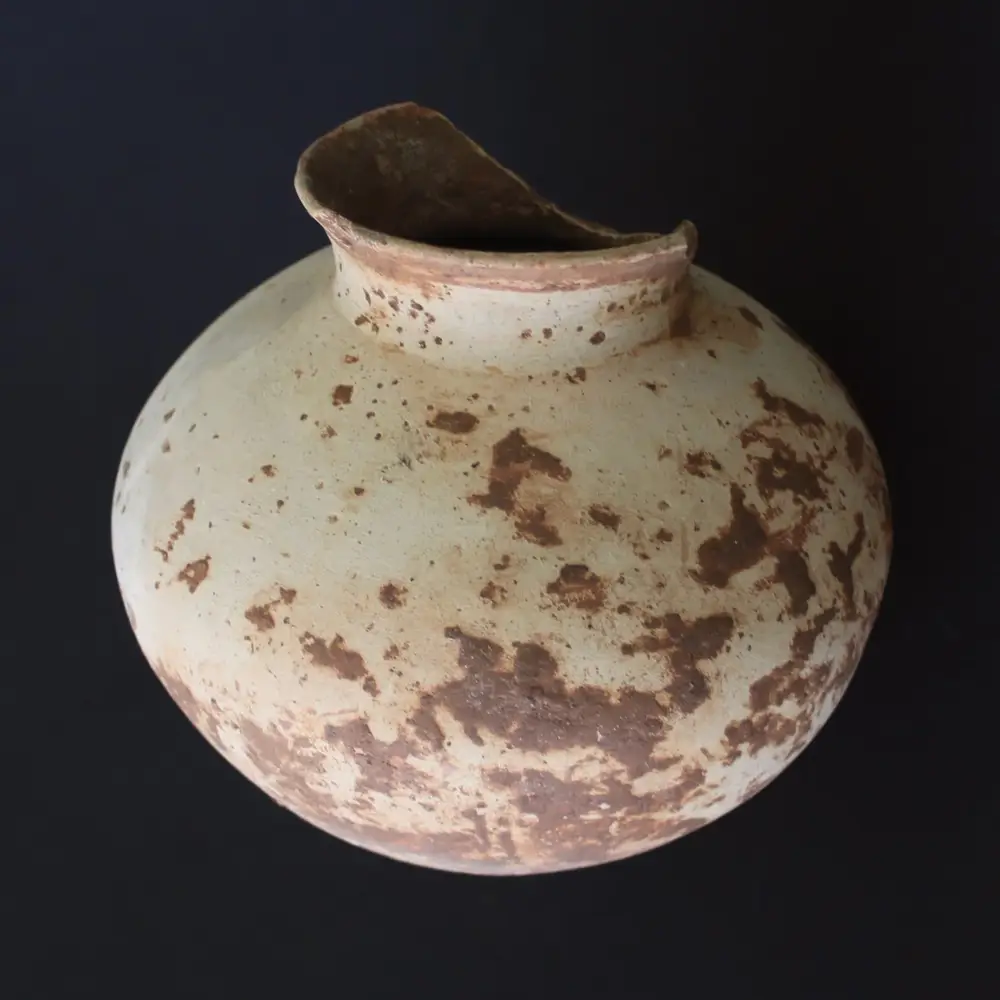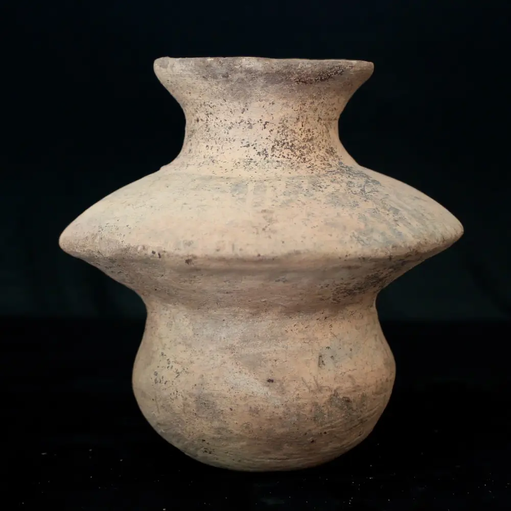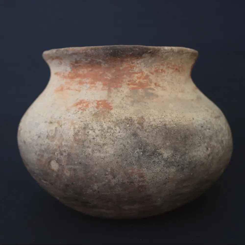 Vaso chocolatero. Cerámica hecha con la técnica de enrolladoraspado, engobe y pulido. Mide 25 cm de altura y 17 cm de ancho. Proviene de las excavaciones arqueológicas del sitio El Ranchito (Mountjoy 2003: PV–33). Asociado a la fase Banderas (900 – 1600d.C.). Vasija trípode de color anaranjado la cual muestra huellas de su uso y además muestra evidencias de haber sido reparada, ya que cuenta con un par de orificios que sirvieron para sujetar el fragmento quebrado. La vasija terminó utilizada como urna funeraria.