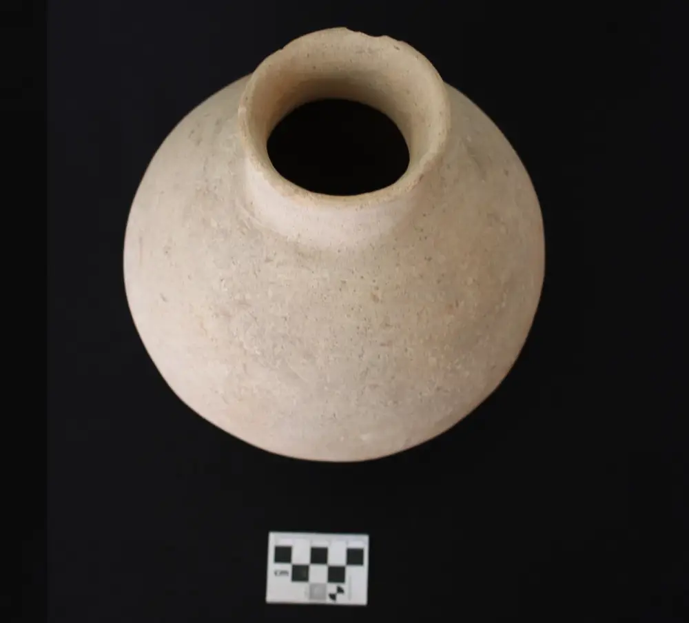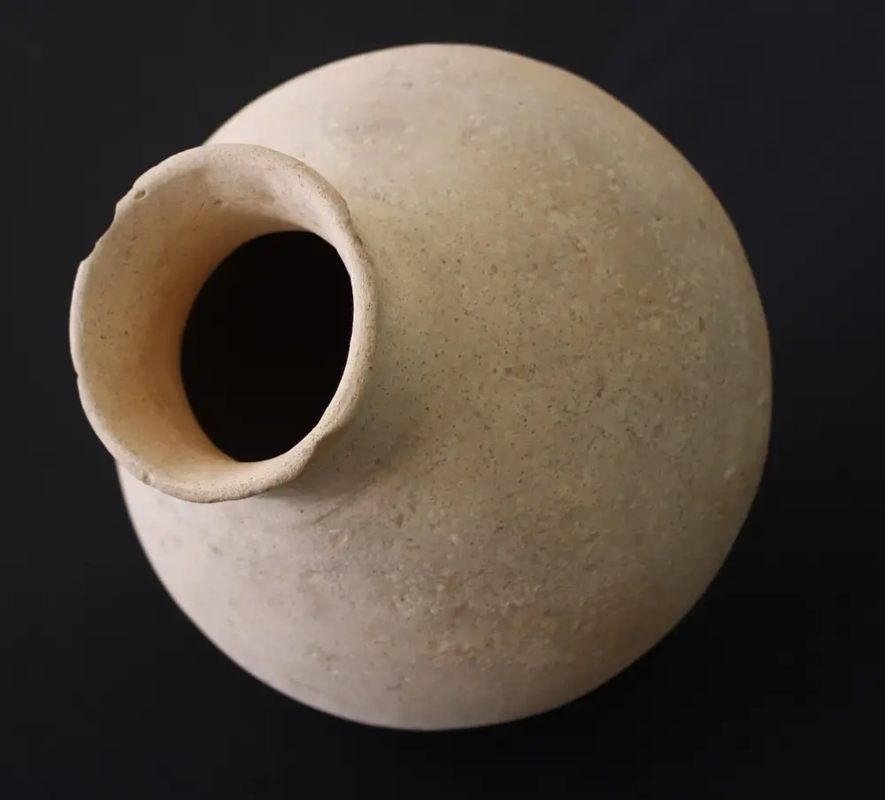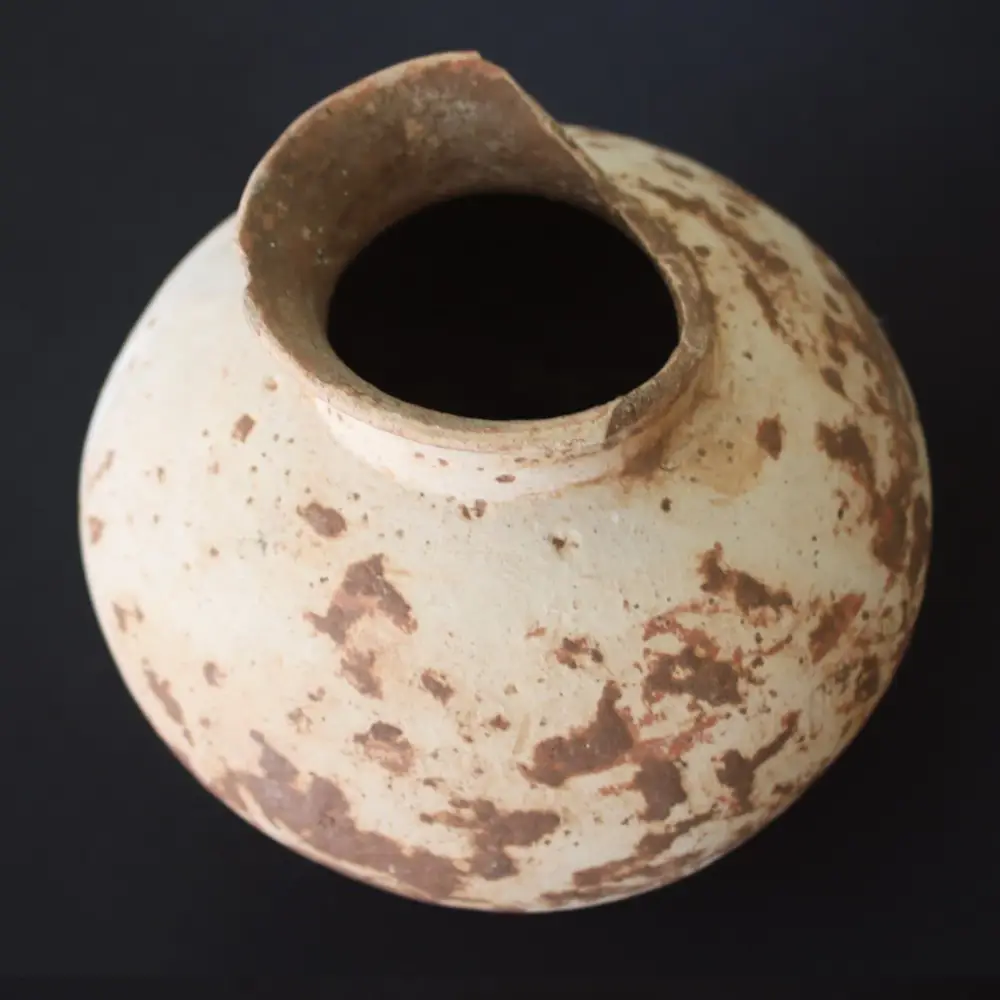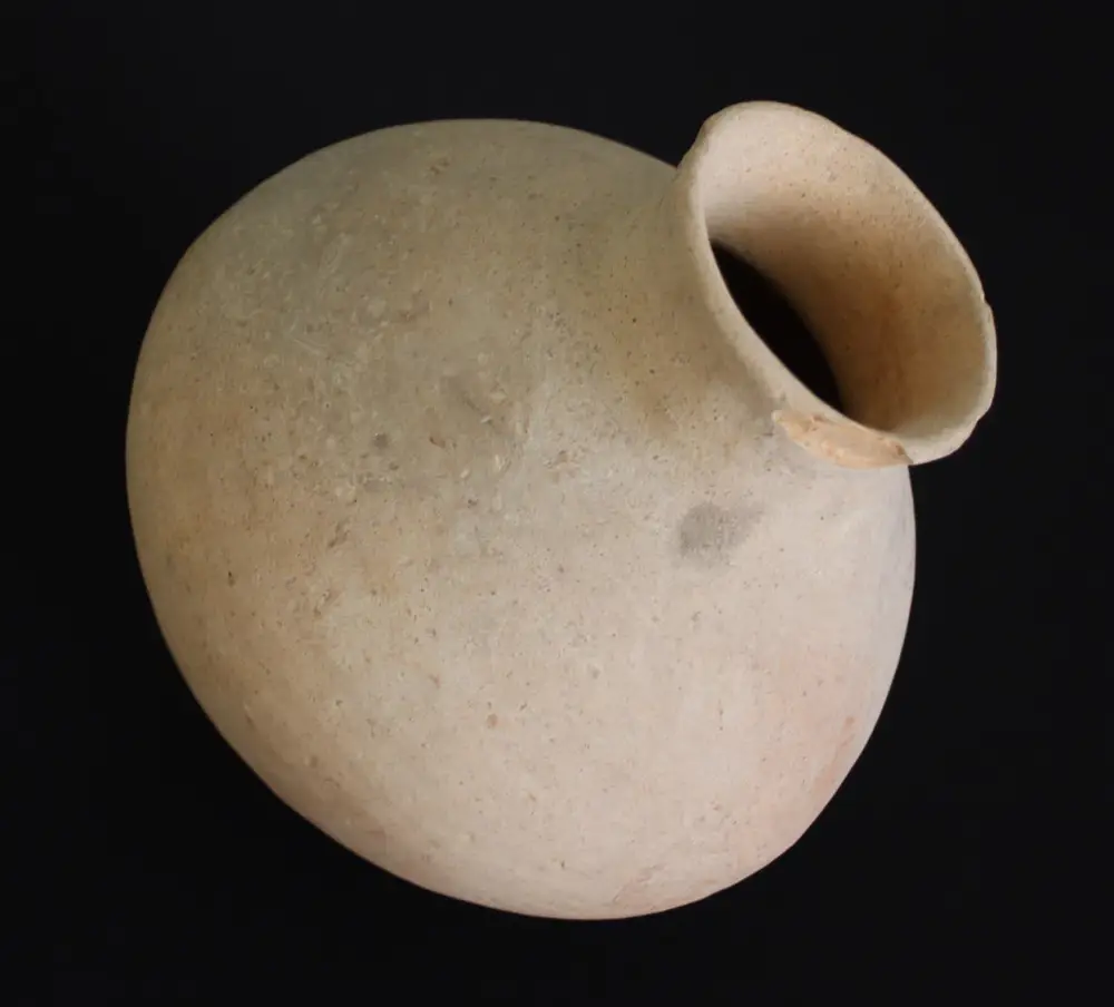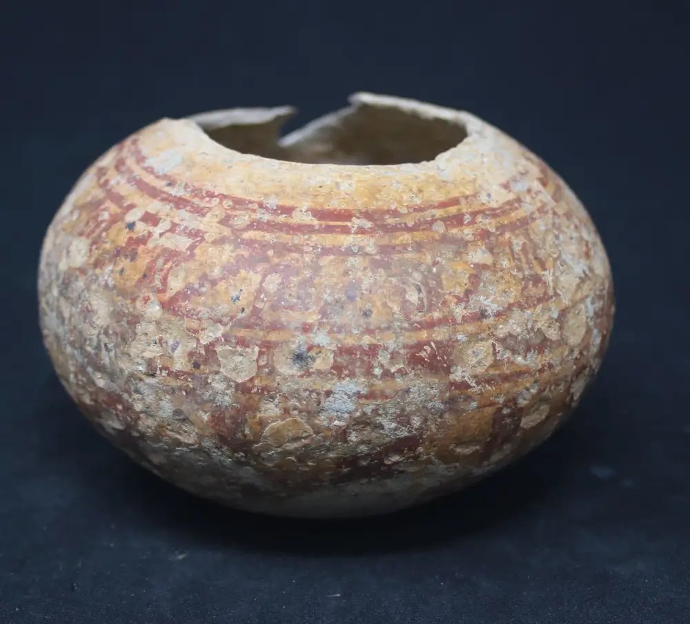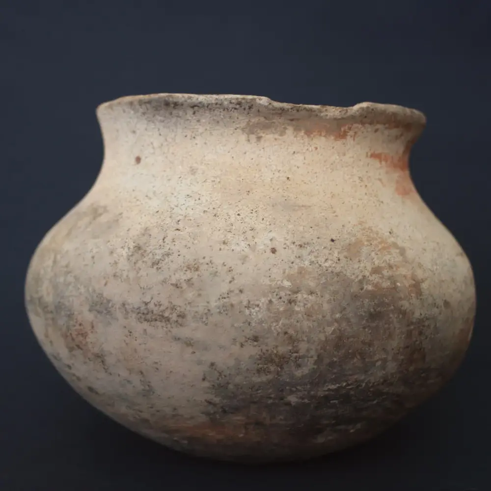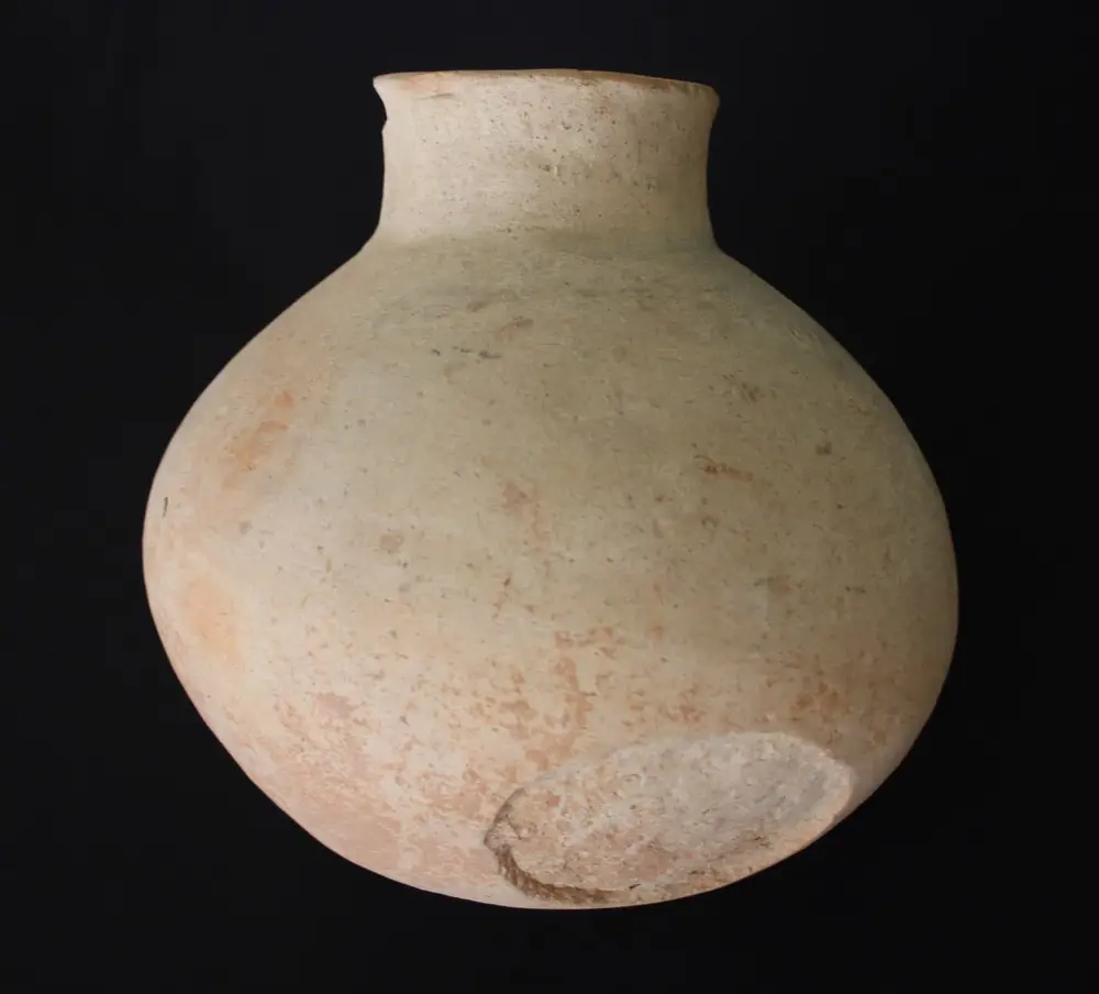 Vaso chocolatero. Cerámica hecha con la técnica de enrolladoraspado, engobe y pulido. Mide 25 cm de altura y 17 cm de ancho. Proviene de las excavaciones arqueológicas del sitio El Ranchito (Mountjoy 2003: PV–33). Asociado a la fase Banderas (900 – 1600d.C.). Vasija trípode de color anaranjado la cual muestra huellas de su uso y además muestra evidencias de haber sido reparada, ya que cuenta con un par de orificios que sirvieron para sujetar el fragmento quebrado. La vasija terminó utilizada como urna funeraria.
