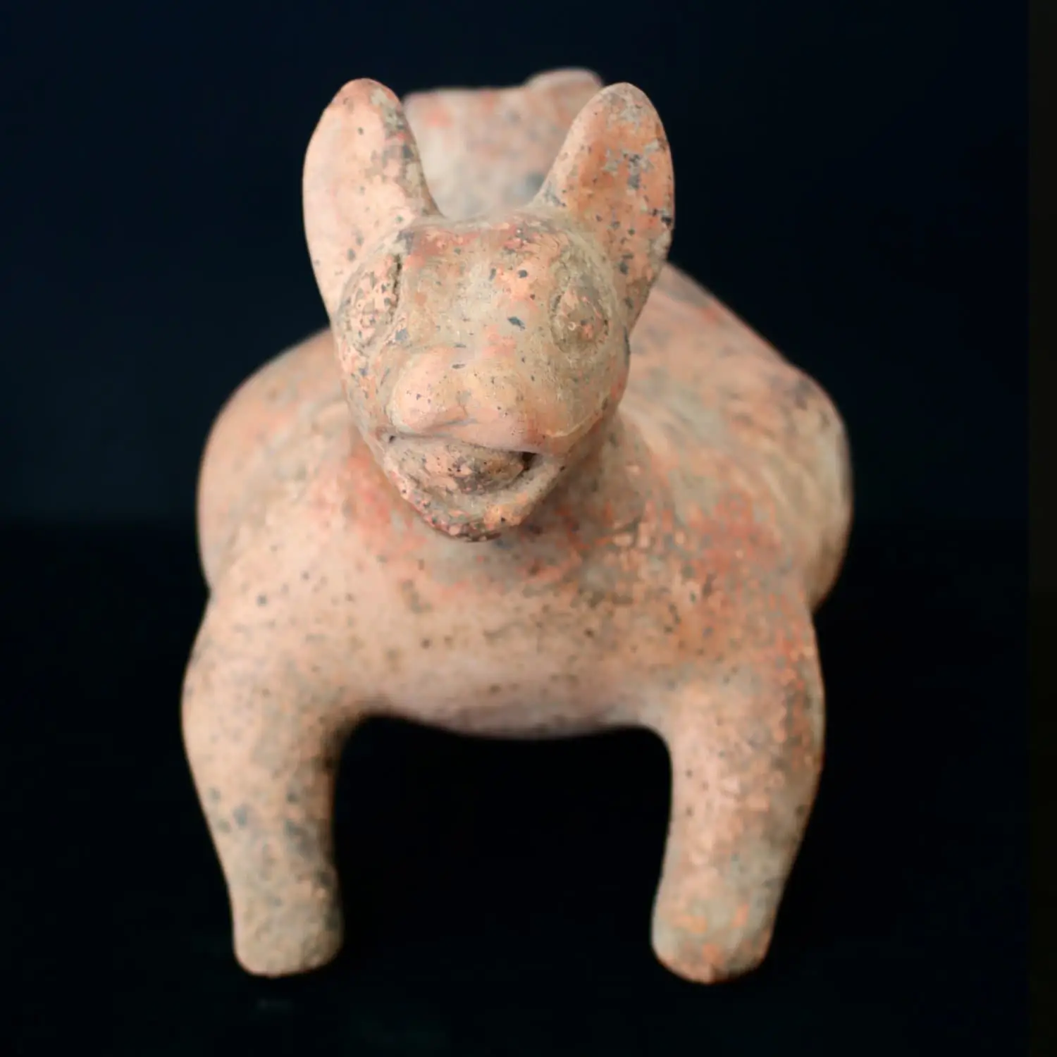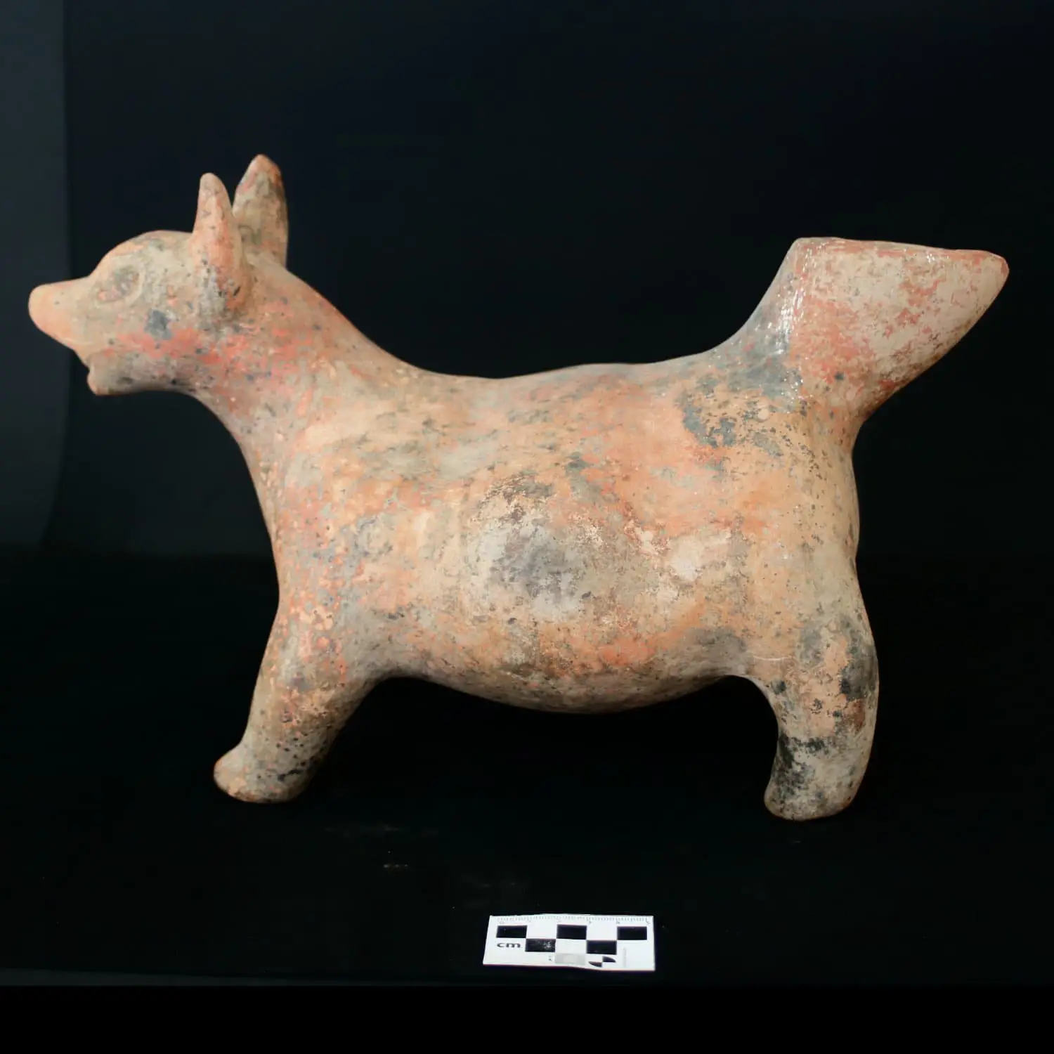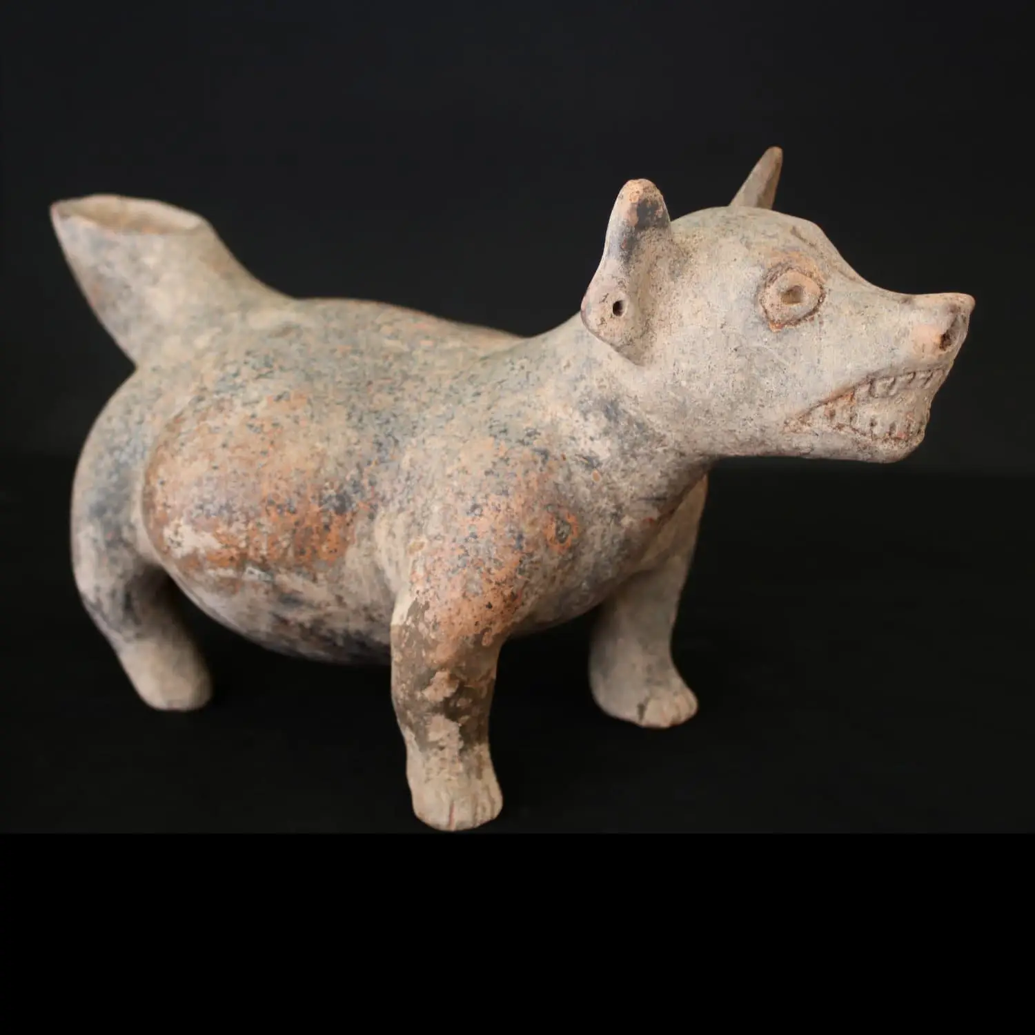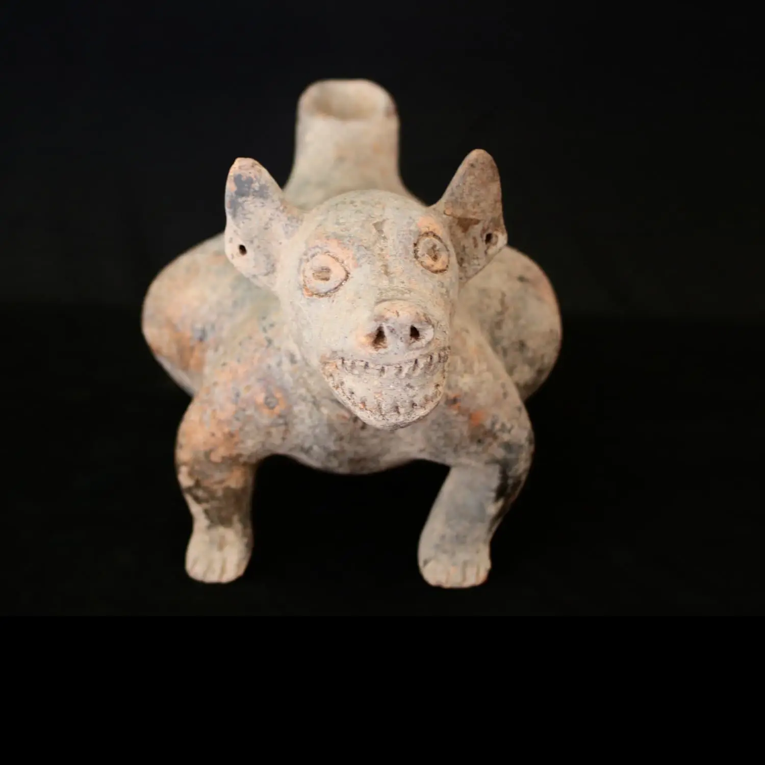 Ocarina de perro. Cerámica hecha con la técnica de barro modelado, punzonado y bicromía. Fue encontrada durante las excavaciones arqueológicas del sitio de La Pedrera, ubicado sobre una loma en la calle de Costa Rica en la colonia Emiliano Zapata (Mountjoy 2003: PV-28). Asociado a la fase Amparo (300a.C. – 300d.C.). La ocarina tiene un orificio para soplar sobre la frente y el orificio de salida sobre la parte posterior del cuello, además presenta dos obturadores (agujeros) en la espalda que generan dos tonos. Presenta restos de pintura blanca y roja sobre el cuerpo y cara.
