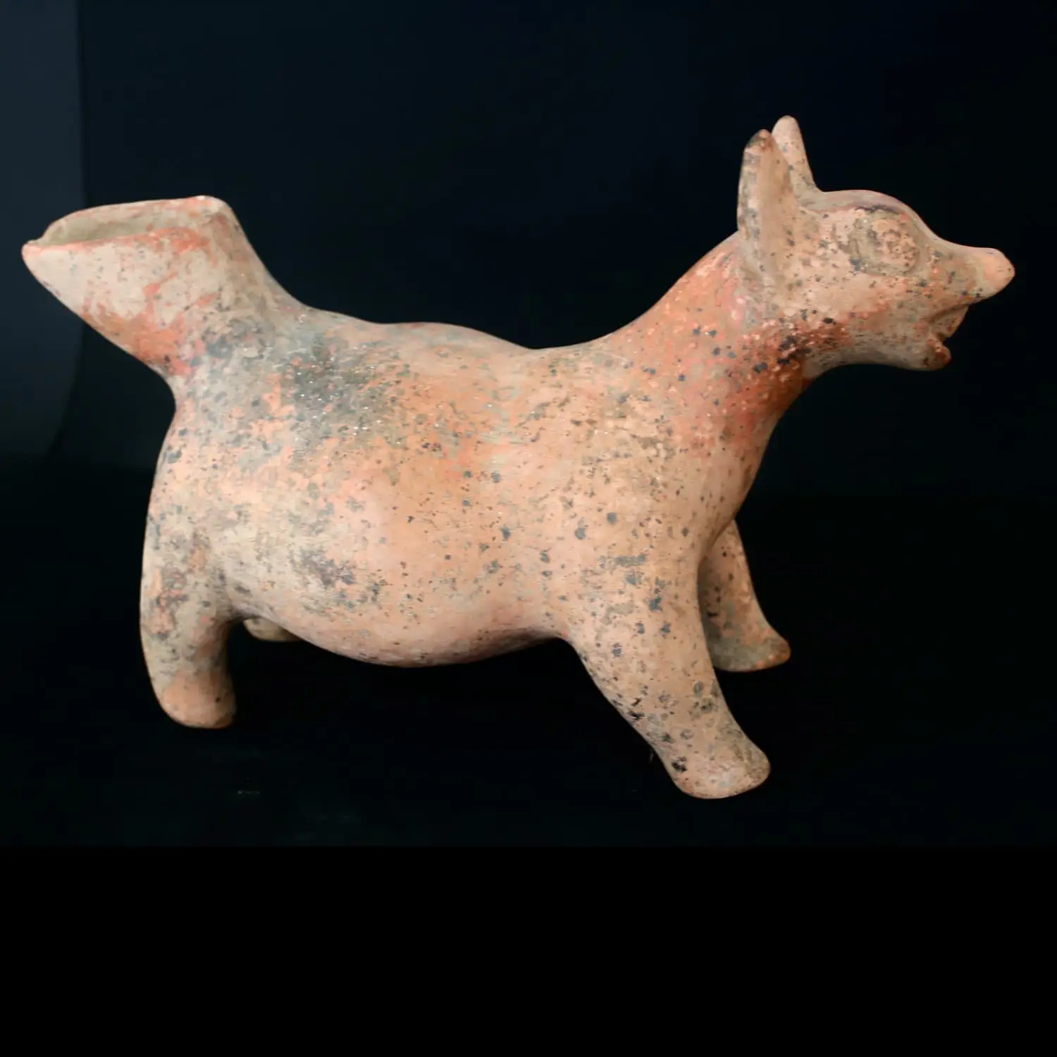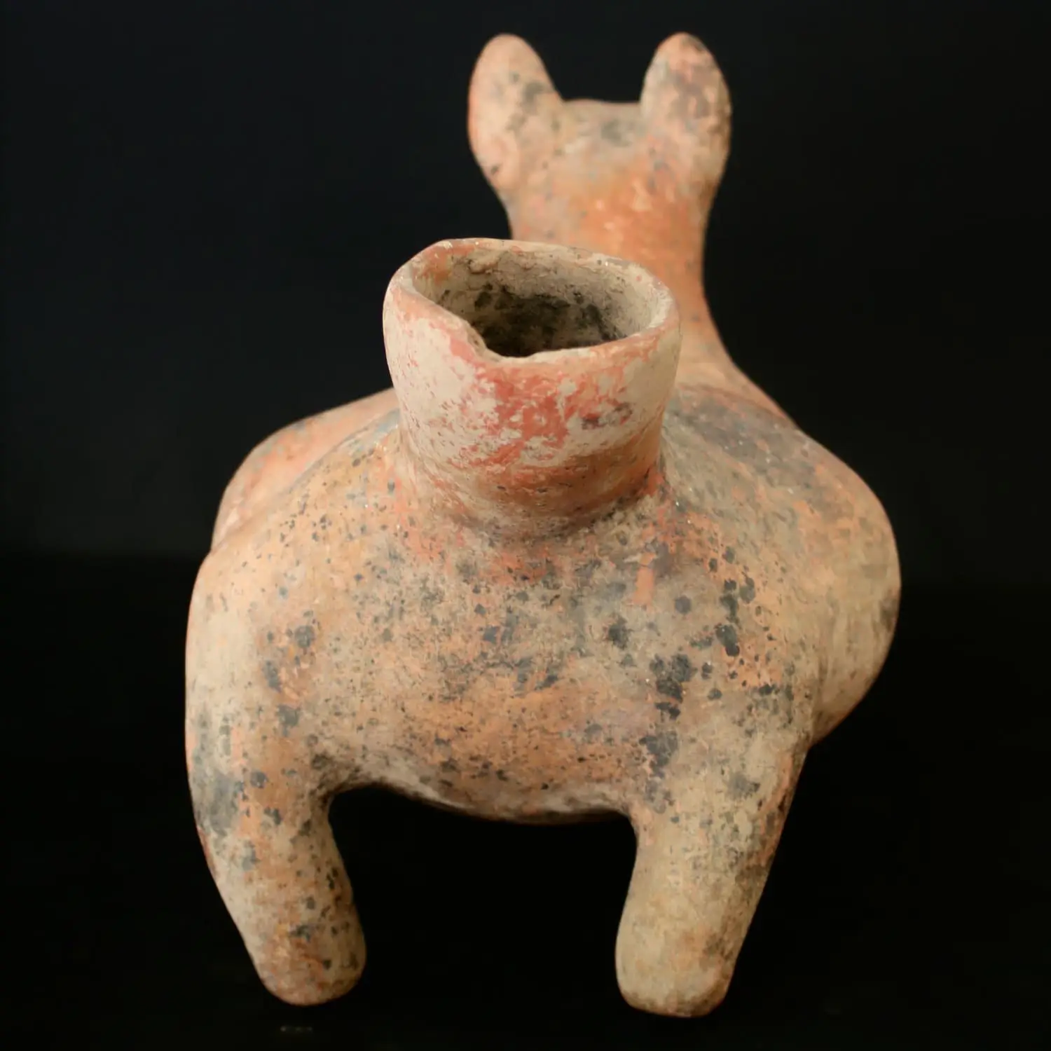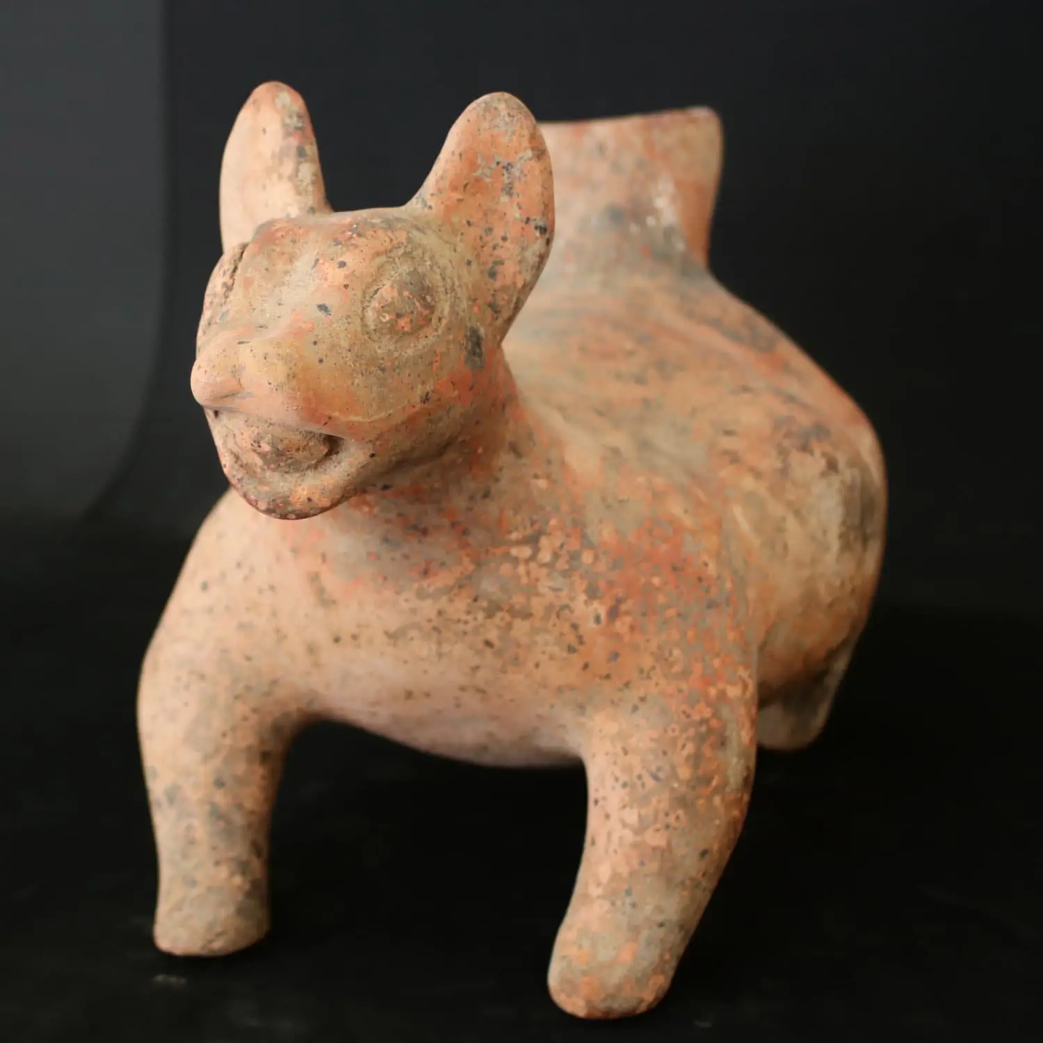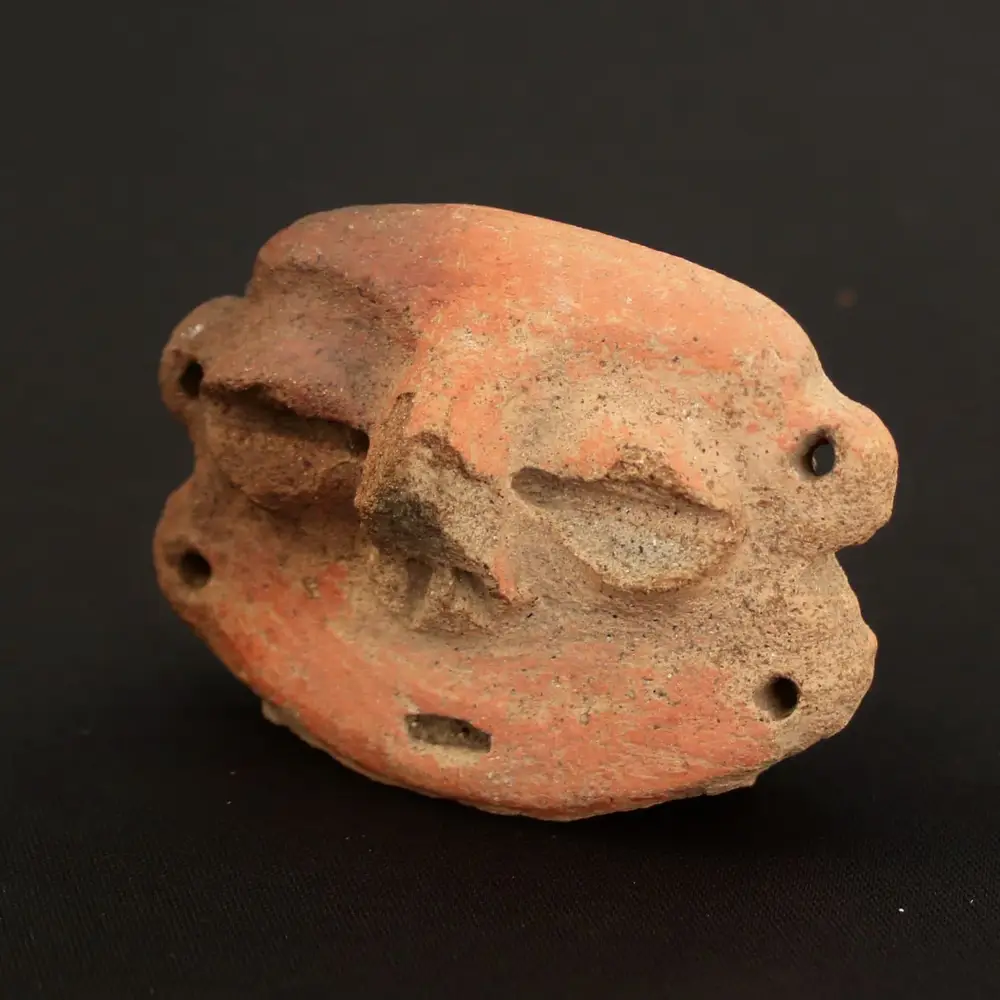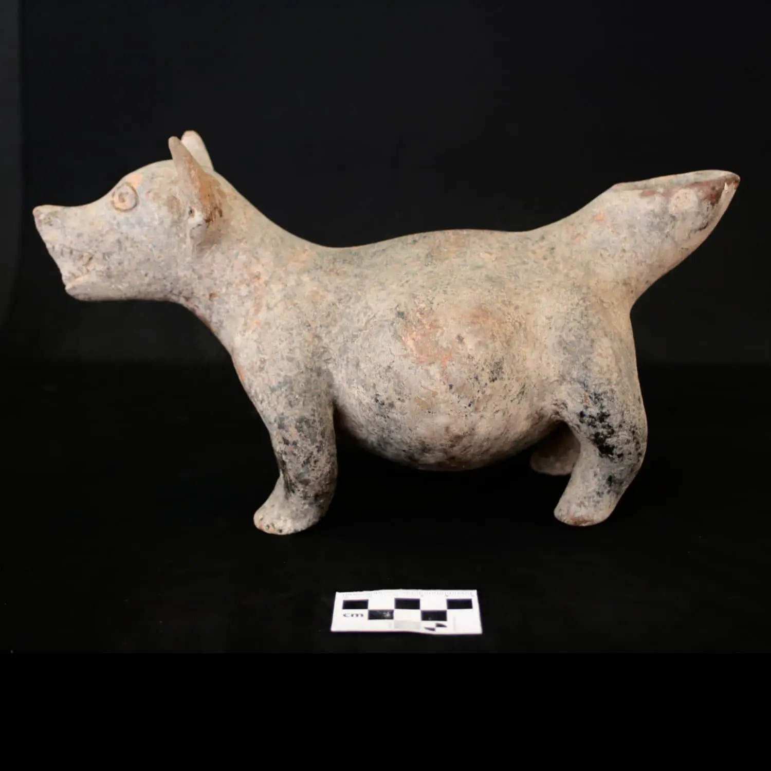 Ocarina de perro. Cerámica hecha con la técnica de barro modelado, punzonado y bicromía. Fue encontrada durante las excavaciones arqueológicas del sitio de La Pedrera, ubicado sobre una loma en la calle de Costa Rica en la colonia Emiliano Zapata (Mountjoy 2003: PV-28). Asociado a la fase Amparo (300a.C. – 300d.C.). La ocarina tiene un orificio para soplar sobre la frente y el orificio de salida sobre la parte posterior del cuello, además presenta dos obturadores (agujeros) en la espalda que generan dos tonos. Presenta restos de pintura blanca y roja sobre el cuerpo y cara.