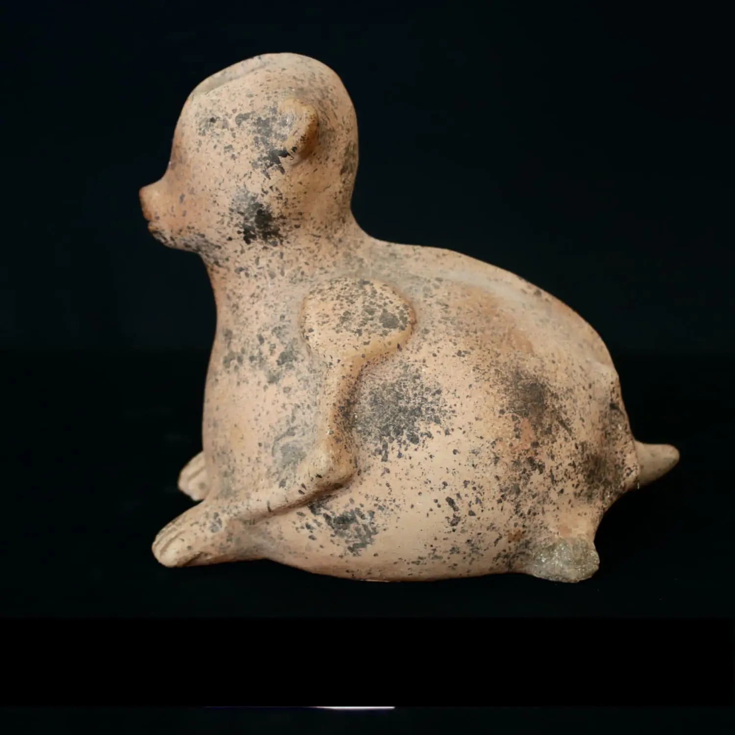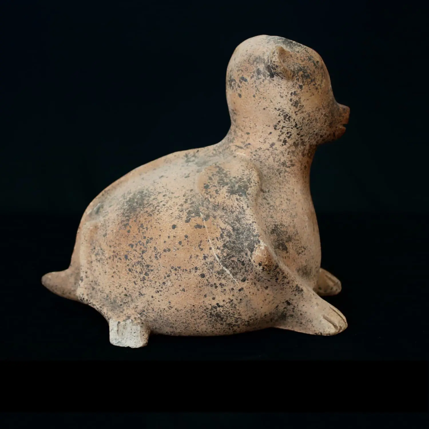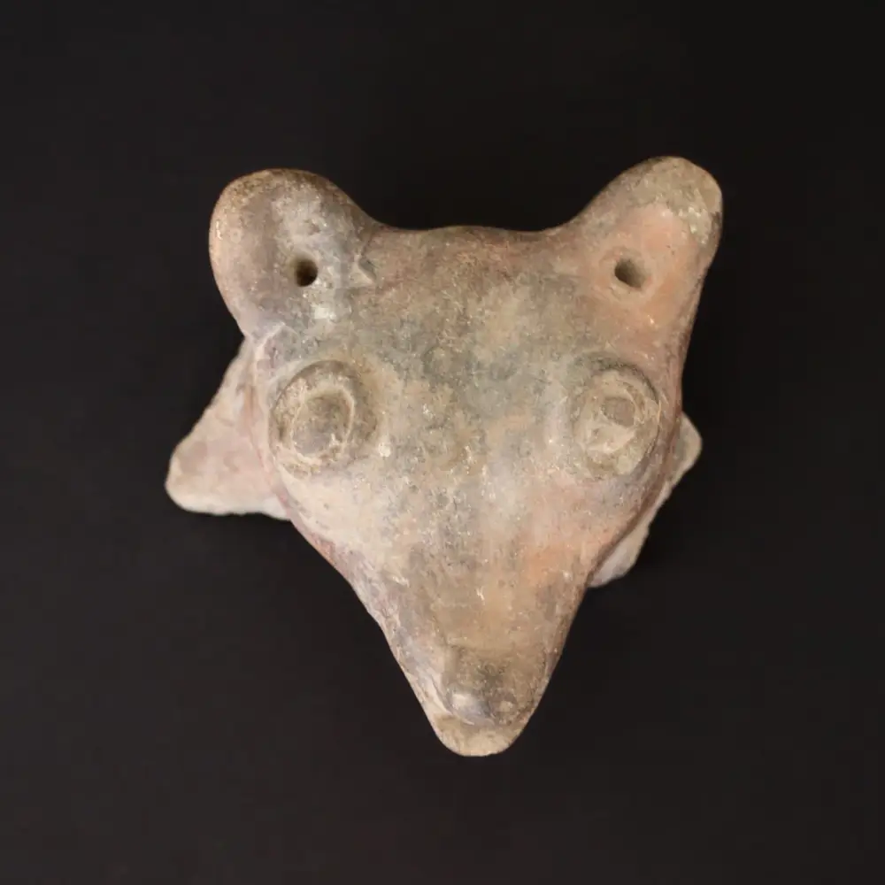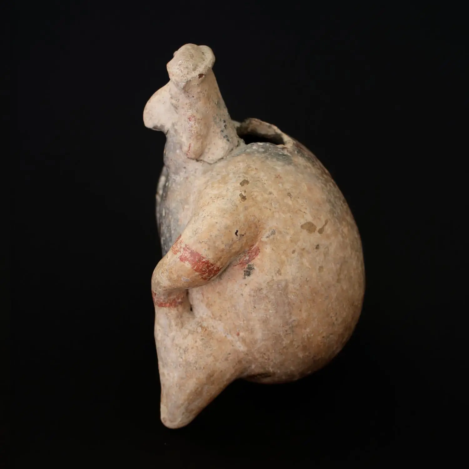 Ocarina de perro. Cerámica hecha con la técnica de barro modelado, punzonado y bicromía. Fue encontrada durante las excavaciones arqueológicas del sitio de La Pedrera, ubicado sobre una loma en la calle de Costa Rica en la colonia Emiliano Zapata (Mountjoy 2003: PV-28). Asociado a la fase Amparo (300a.C. – 300d.C.). La ocarina tiene un orificio para soplar sobre la frente y el orificio de salida sobre la parte posterior del cuello, además presenta dos obturadores (agujeros) en la espalda que generan dos tonos. Presenta restos de pintura blanca y roja sobre el cuerpo y cara.
