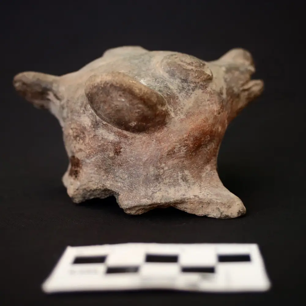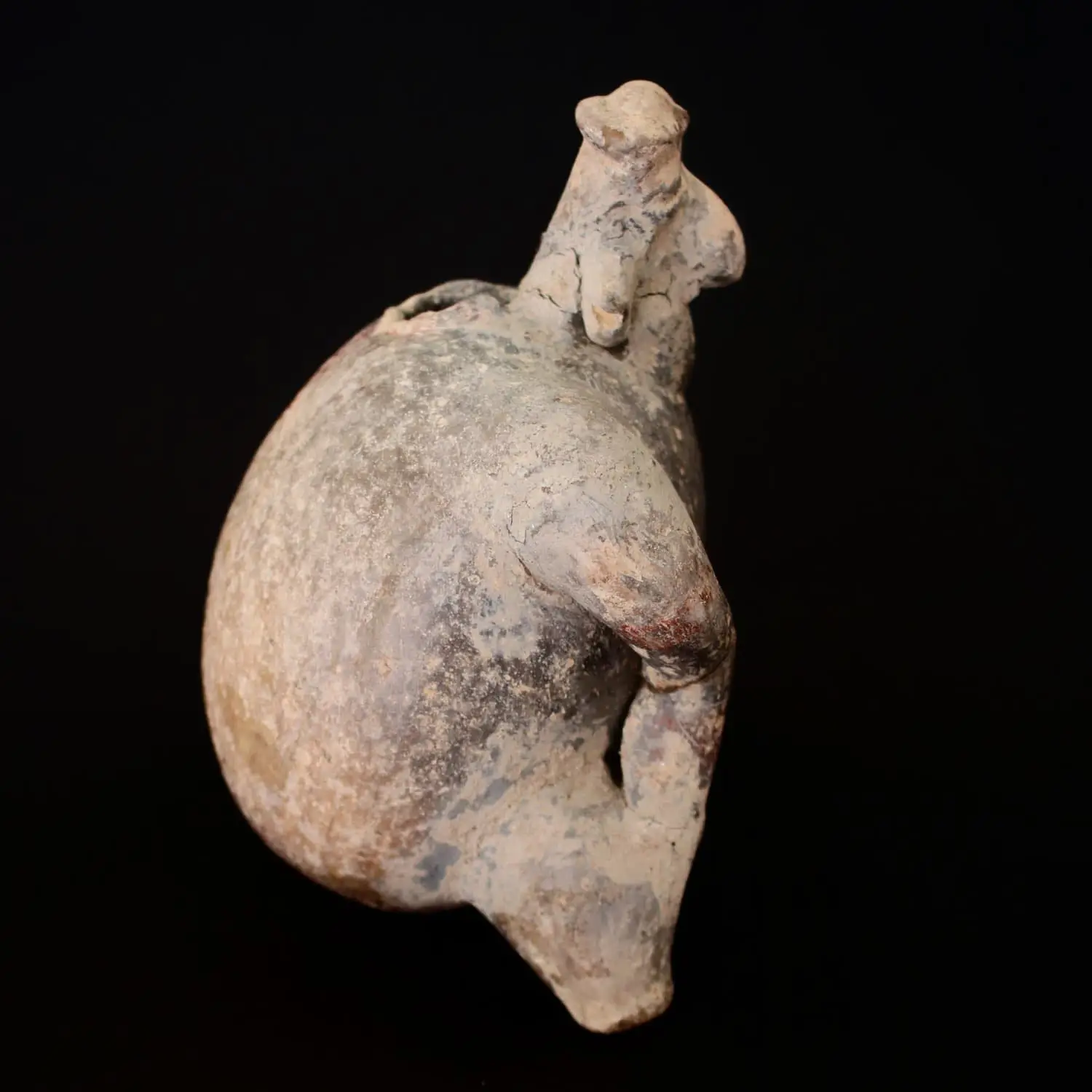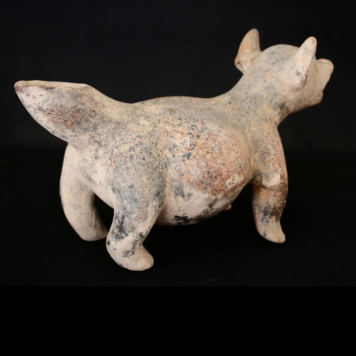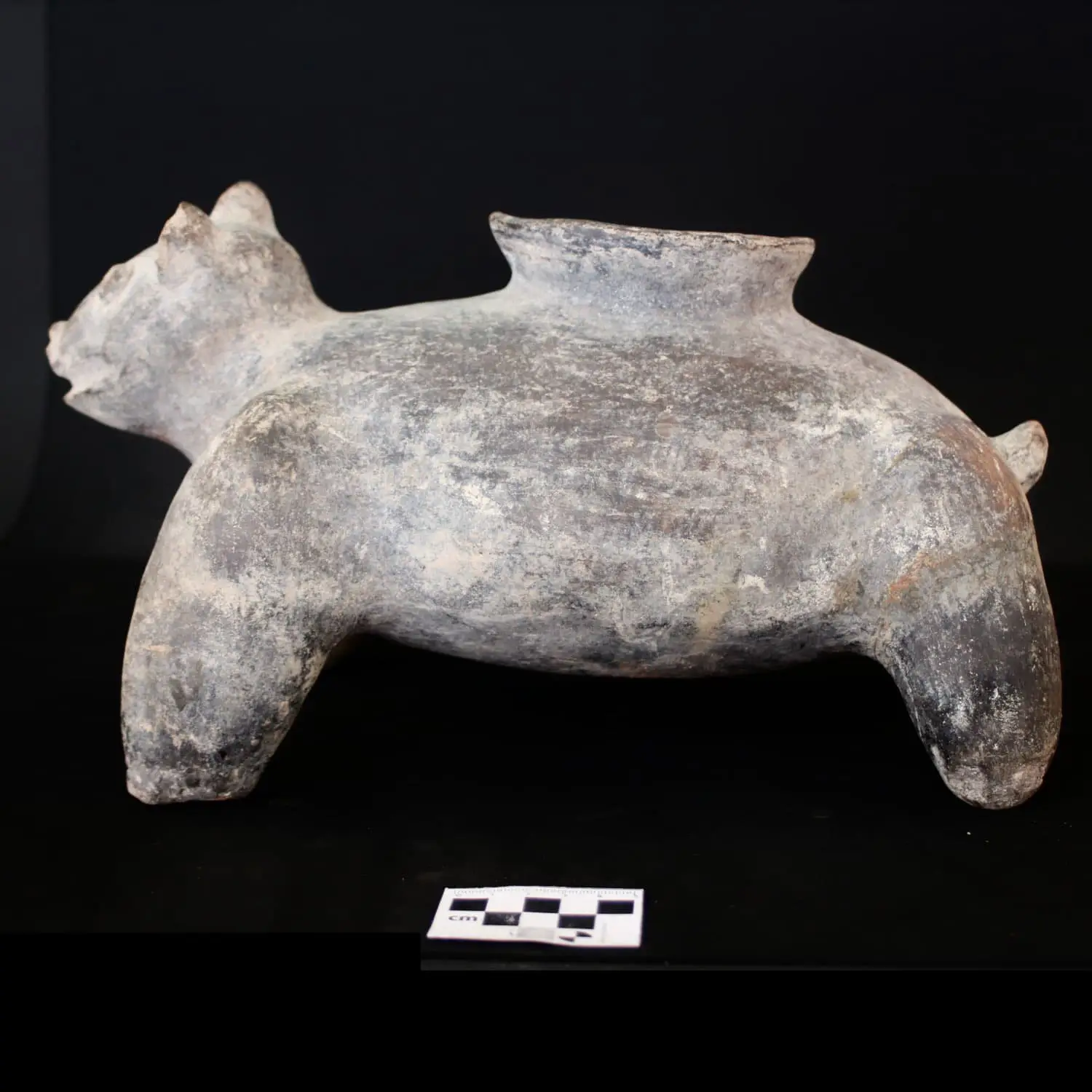 Ocarina de perro. Cerámica hecha con la técnica de barro modelado, punzonado y bicromía. Fue encontrada durante las excavaciones arqueológicas del sitio de La Pedrera, ubicado sobre una loma en la calle de Costa Rica en la colonia Emiliano Zapata (Mountjoy 2003: PV-28). Asociado a la fase Amparo (300a.C. – 300d.C.). La ocarina tiene un orificio para soplar sobre la frente y el orificio de salida sobre la parte posterior del cuello, además presenta dos obturadores (agujeros) en la espalda que generan dos tonos. Presenta restos de pintura blanca y roja sobre el cuerpo y cara.