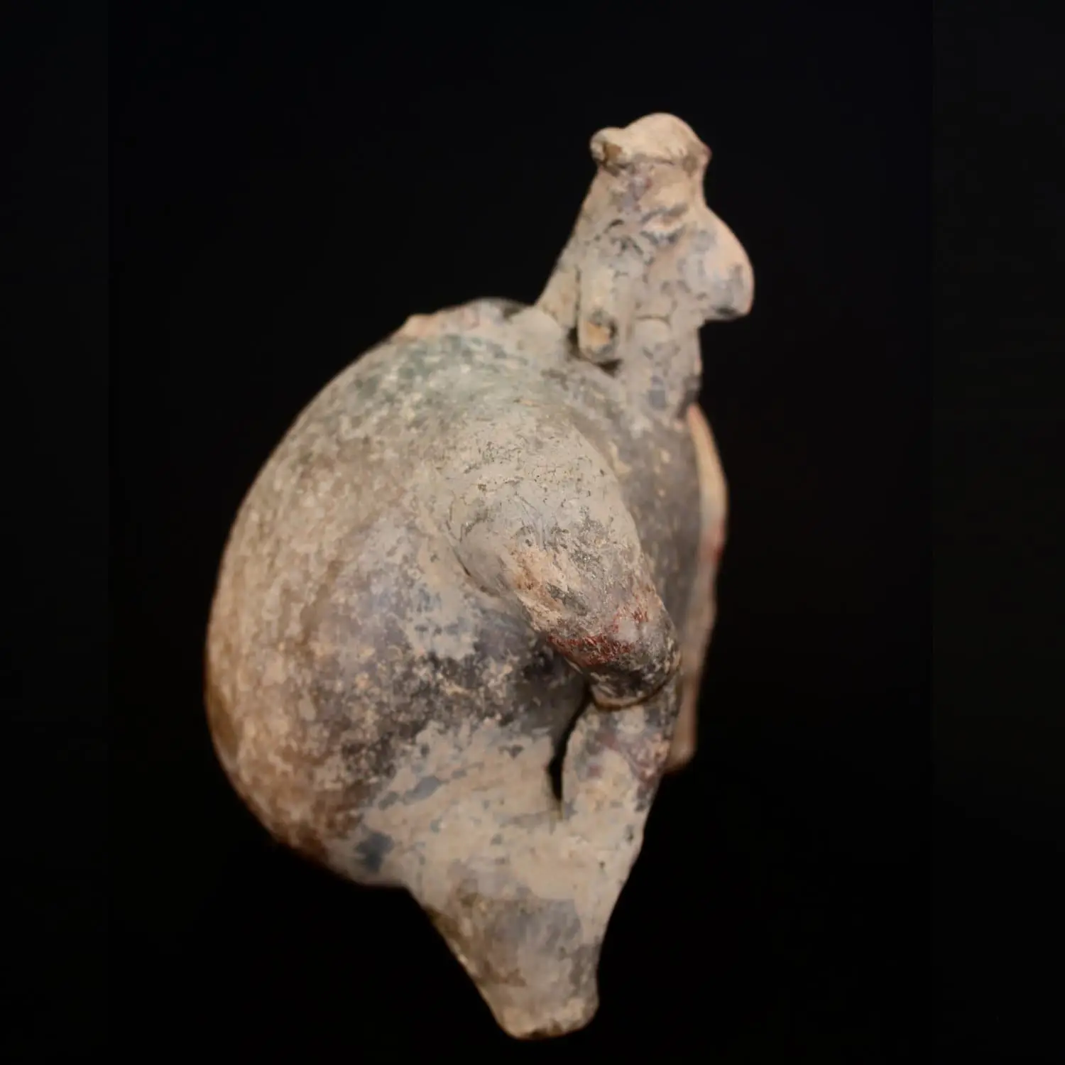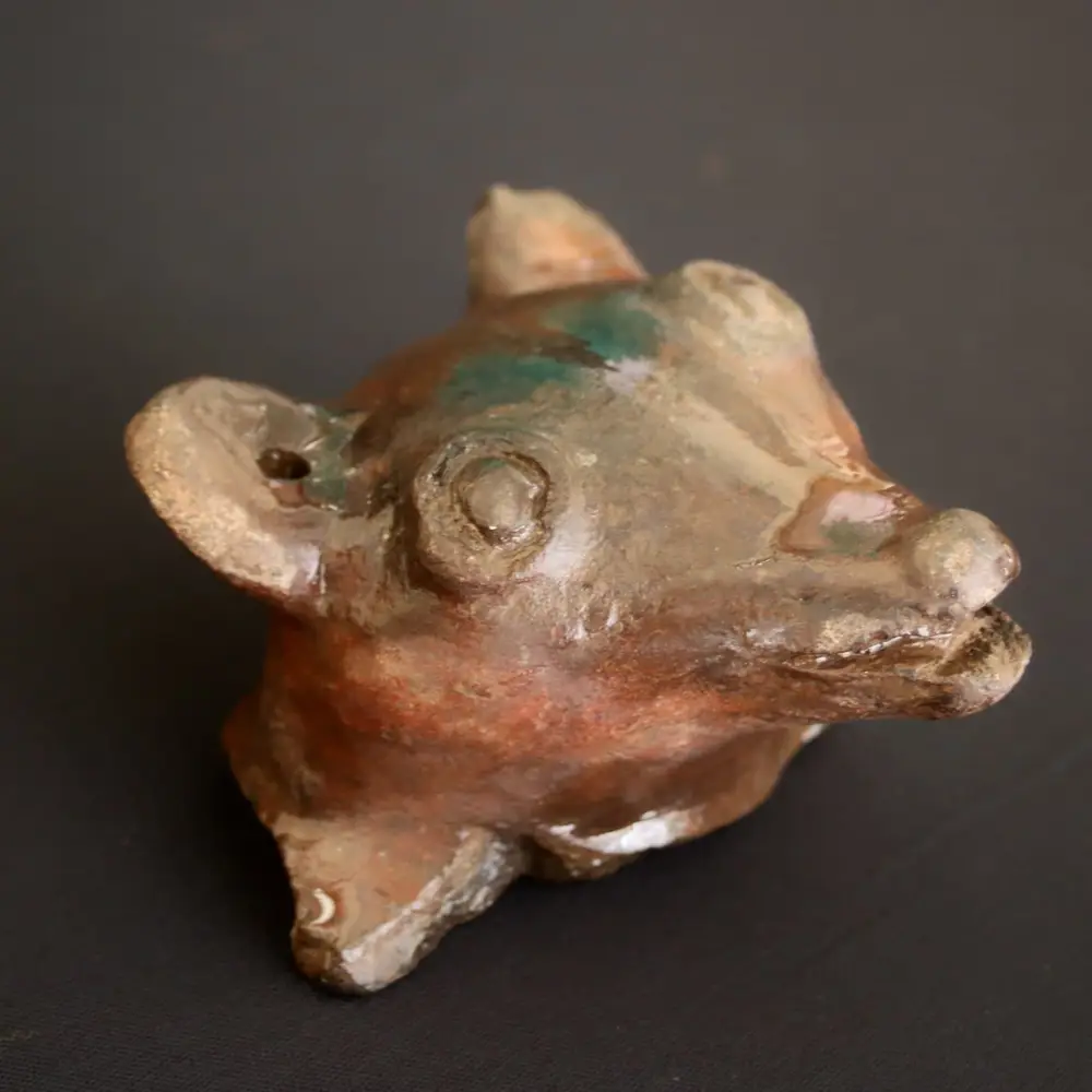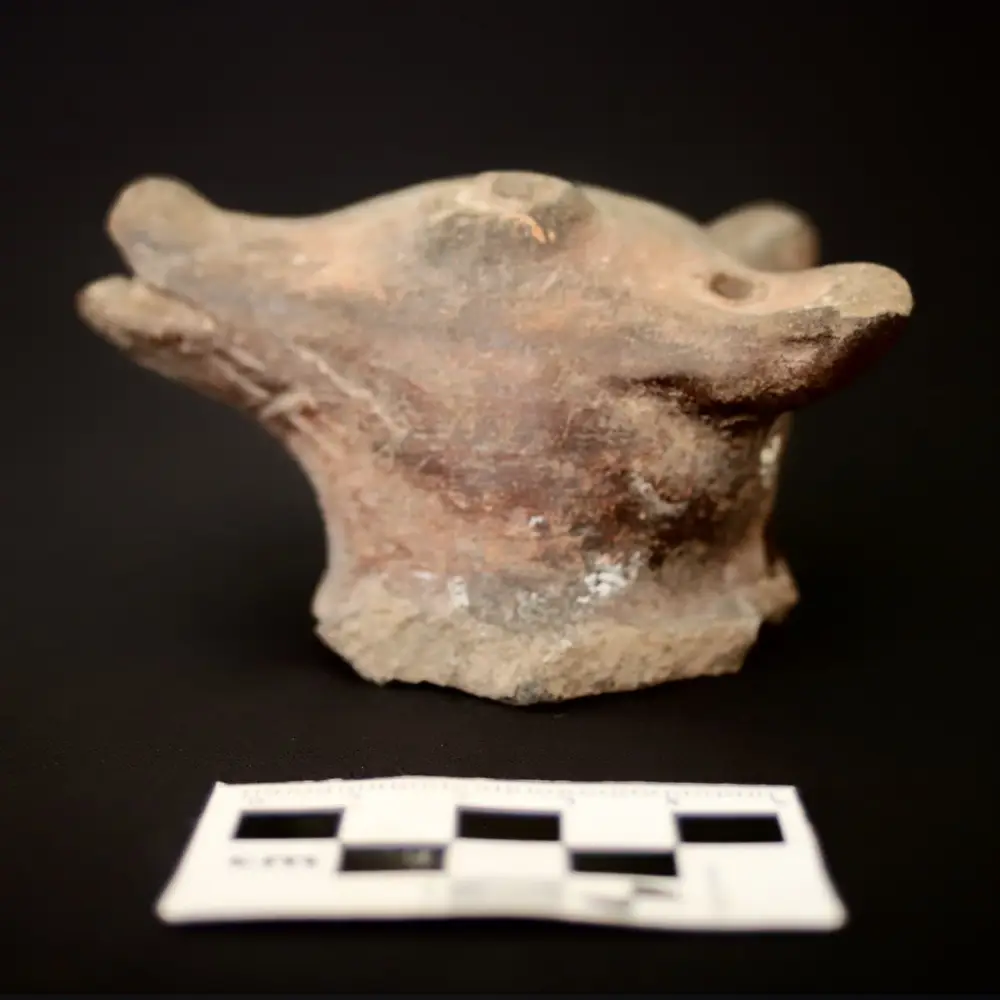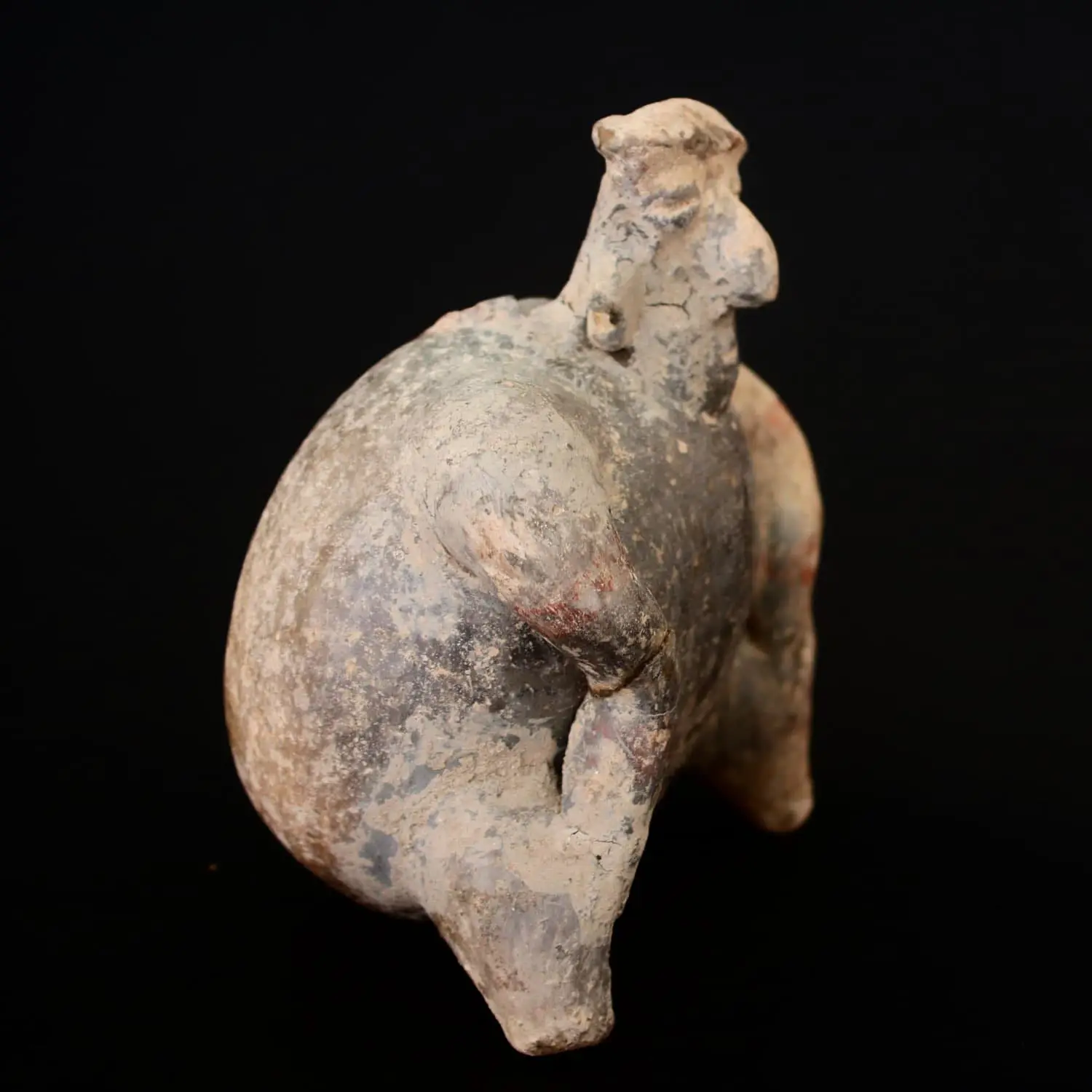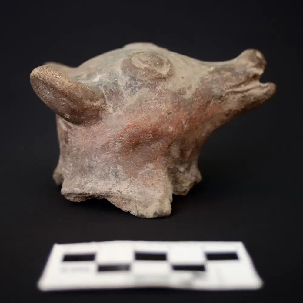 Ocarina de perro. Cerámica hecha con la técnica de barro modelado, punzonado y bicromía. Fue encontrada durante las excavaciones arqueológicas del sitio de La Pedrera, ubicado sobre una loma en la calle de Costa Rica en la colonia Emiliano Zapata (Mountjoy 2003: PV-28). Asociado a la fase Amparo (300a.C. – 300d.C.). La ocarina tiene un orificio para soplar sobre la frente y el orificio de salida sobre la parte posterior del cuello, además presenta dos obturadores (agujeros) en la espalda que generan dos tonos. Presenta restos de pintura blanca y roja sobre el cuerpo y cara.