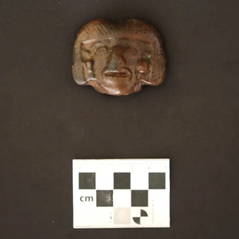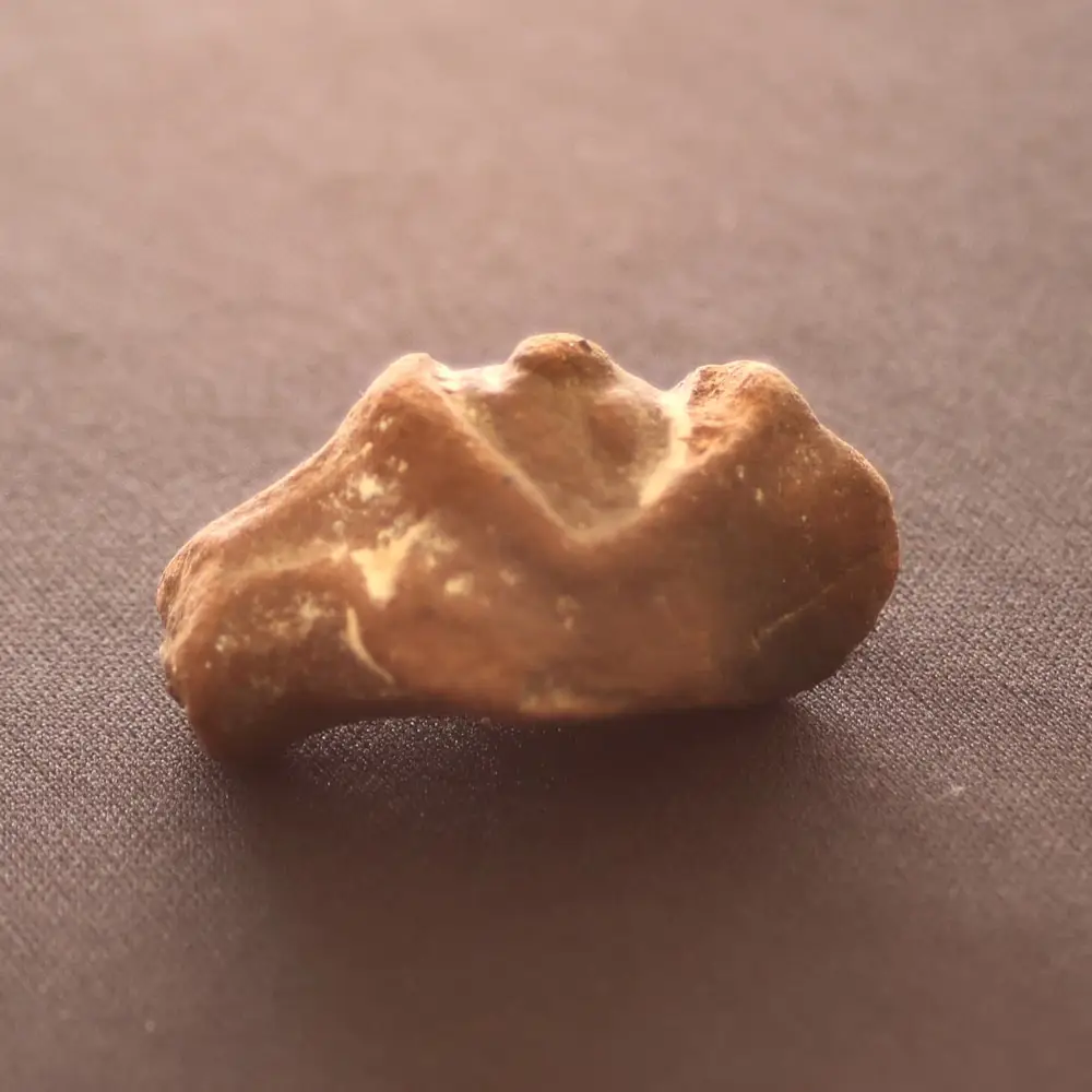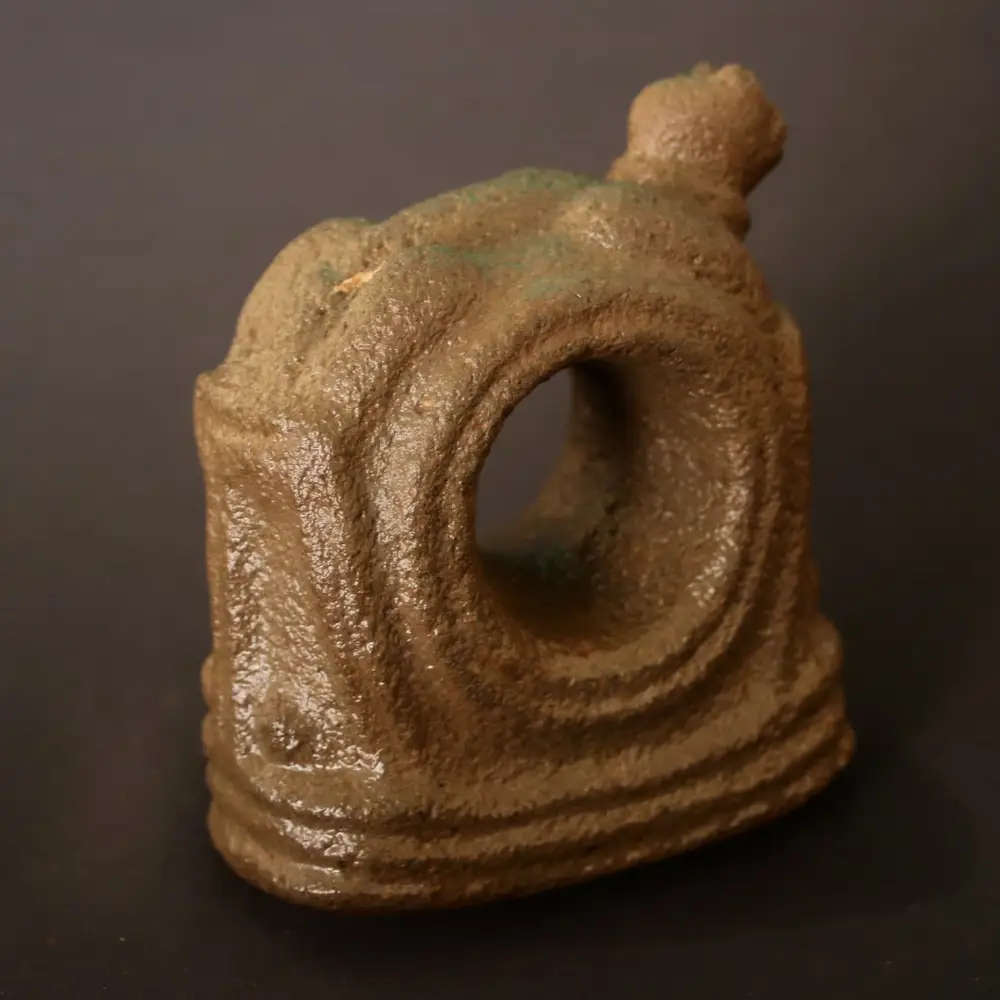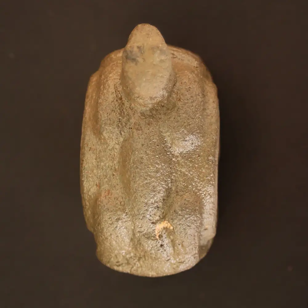 Sello zoomorfo. Cerámica hecha con la técnica de barro modelado, inciso y punzonado. Mide 3.8cm de ancho por 4.2 de altura. Pertenece a la colección Escuela Teresa Barba (REG-1671 PJ 190). Asociado a la fase Aztatlán (900 – 1200d.C.). El diseño del estampado asemeja a un “ave” hecha a base de círculos concéntricos, con una protuberancia que forma la cabeza donde se resalta el ojo y la boca, además de otras tres protuberancias que forman las alas y la cola.