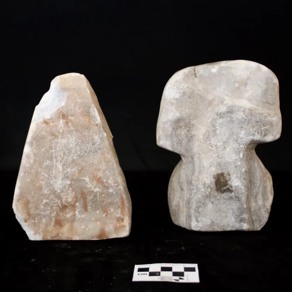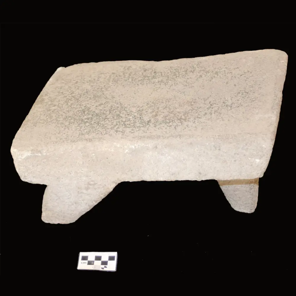 Hacha de garganta. Vistas superior y lateral. Piedra trabajada con la técnica de tallado y pulido. Mide 12cm de largo por 8cm ancho. Proviene de la colección Escuela Teresa Barba. Hacha llamada de “garganta” por la forma corrida de la zona de enmangue, la cual servía para montar el hacha en un mango de madera. El hacha presenta huellas de uso y era una herramienta utilizada principalmente para el trabajo de la madera.