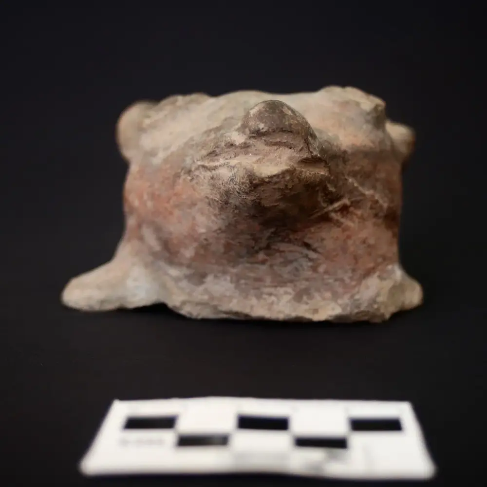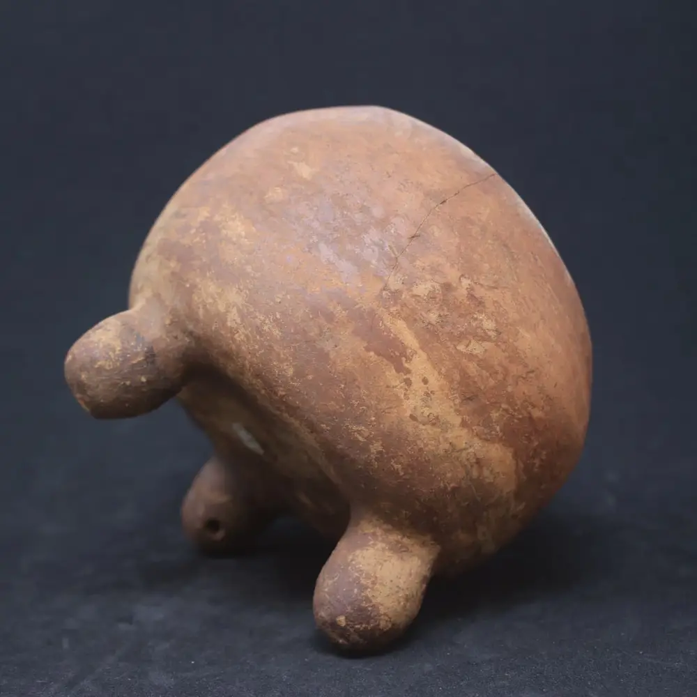 Sonaja zoomorfa. Cerámica hecha con la técnica de barro modelado. Mide 11cm de largo, 7cm de ancho y 5cm de alto. Proviene de la colección Escuela Teresa Barba. Asociado a la fase Aztatlán (900 – 1200d.C.). La pieza representa una tortuga. Tiene una pequeña cabeza con los ojos bien marcados, es hueca y contiene un percutor en su interior que la hace sonar. Tiene las cuatro patas bien definidas.