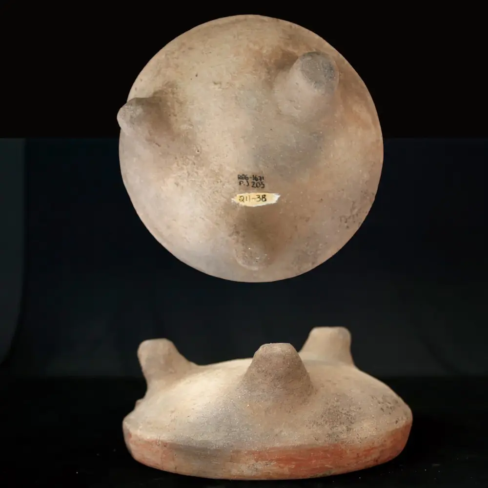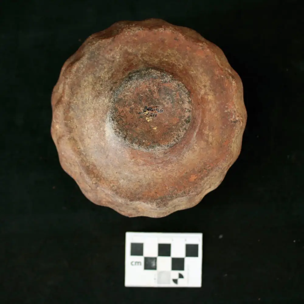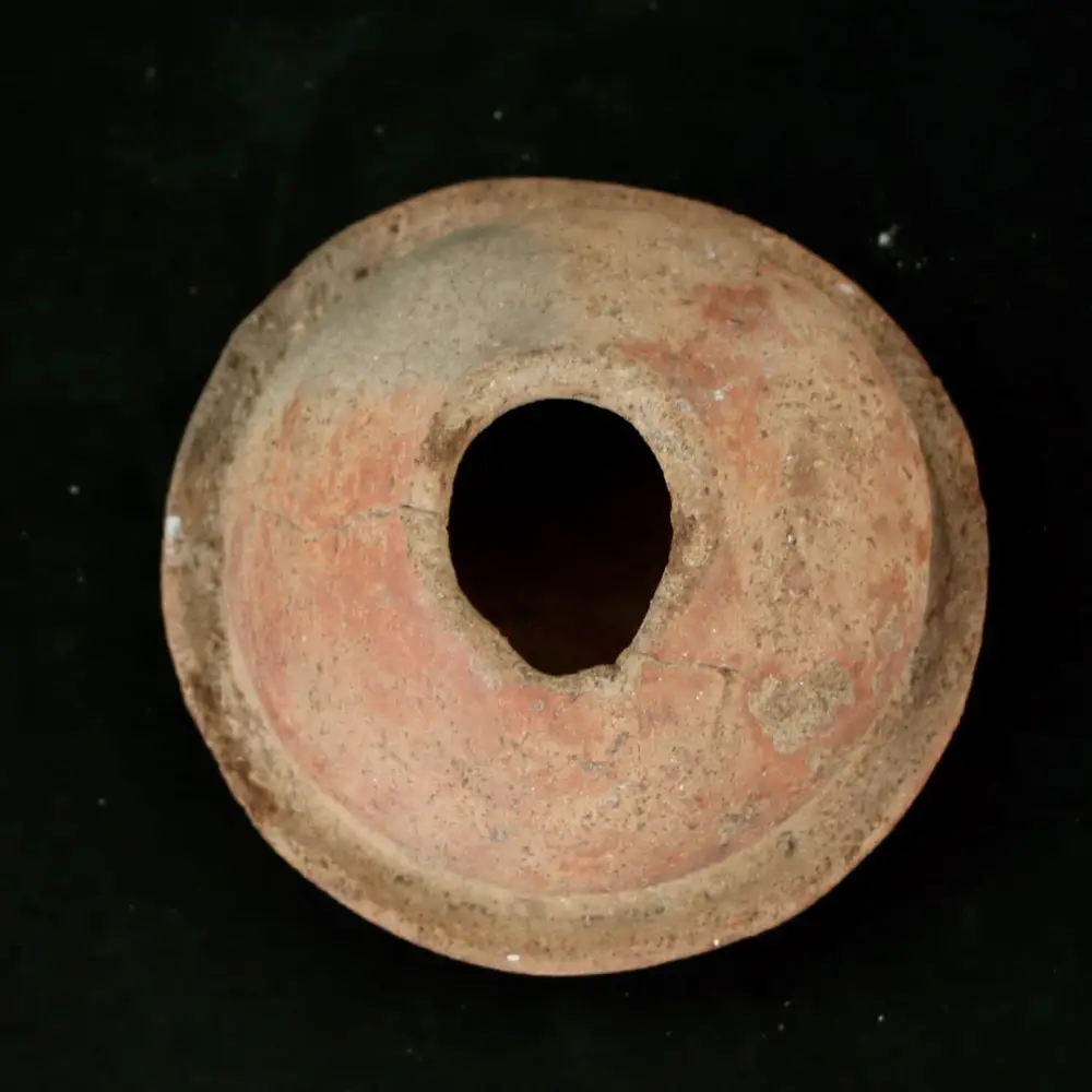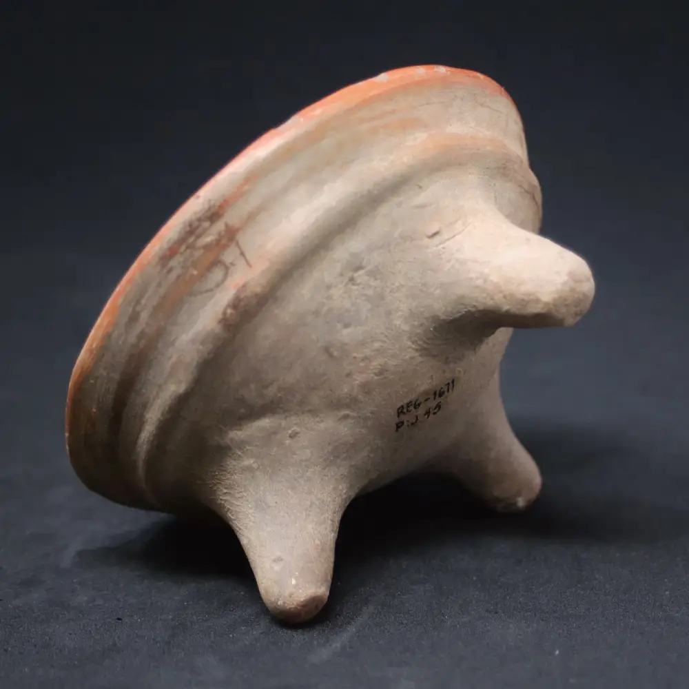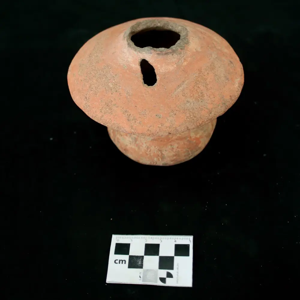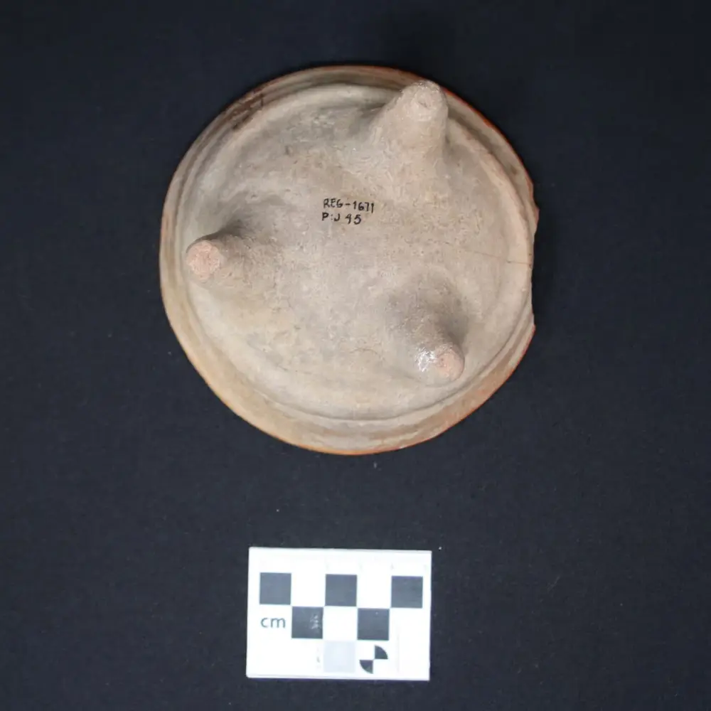 Sahumador sonaja. Vista inferior. El mango del sahumador tiene varias perforaciones pequeñas, está quebrado de su extremo donde se aprecia que es hueco y que contiene varios percutores de cerámica que lo hacen funcionar como sonaja. La parte inferior de la cazoleta presenta una decoración de pintura roja sobre bayo formando una banda con puntos y motivos de “cruces” que ha sido identificado como la Cruz de Quetzacóatl o el Quincunce. La parte inferior de la cazoleta tiene una perforación en forma de cruz par la ventilación.