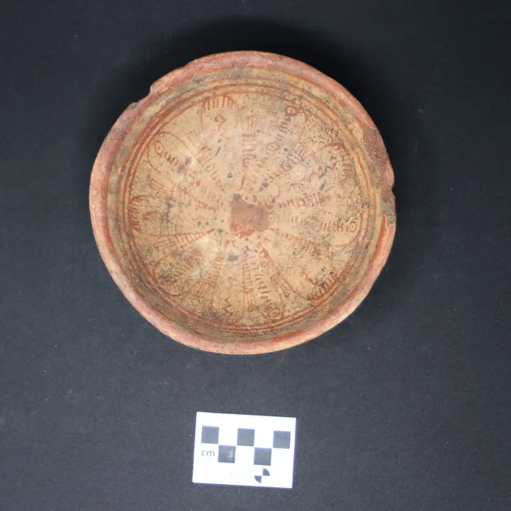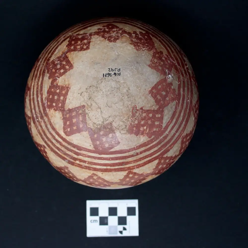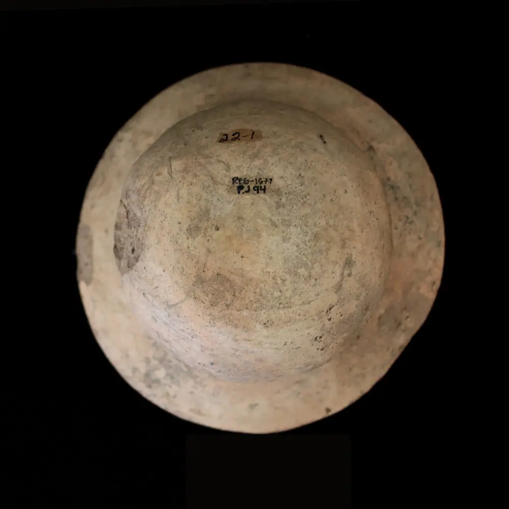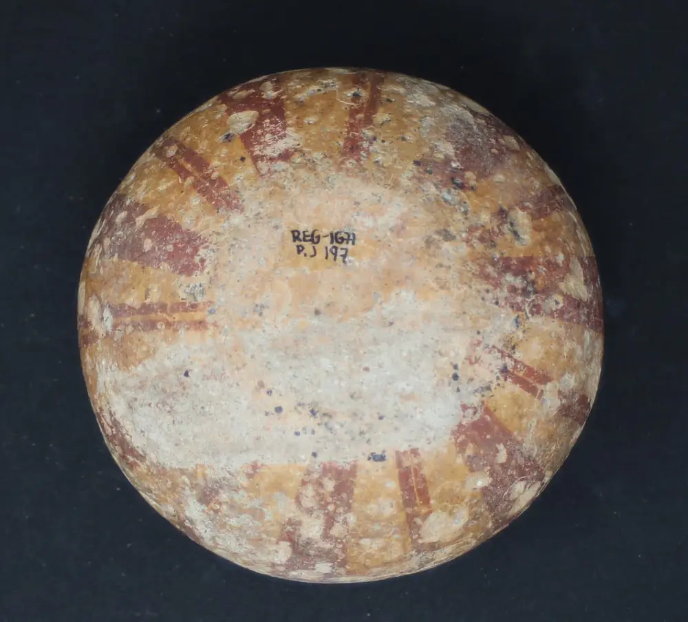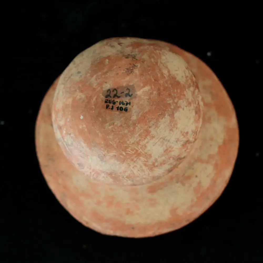 Sahumador sonaja. Vista inferior. El mango del sahumador tiene varias perforaciones pequeñas, está quebrado de su extremo donde se aprecia que es hueco y que contiene varios percutores de cerámica que lo hacen funcionar como sonaja. La parte inferior de la cazoleta presenta una decoración de pintura roja sobre bayo formando una banda con puntos y motivos de “cruces” que ha sido identificado como la Cruz de Quetzacóatl o el Quincunce. La parte inferior de la cazoleta tiene una perforación en forma de cruz par la ventilación.