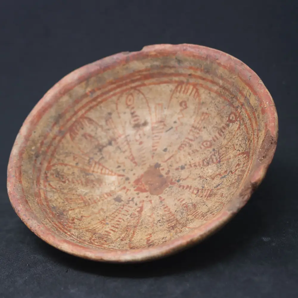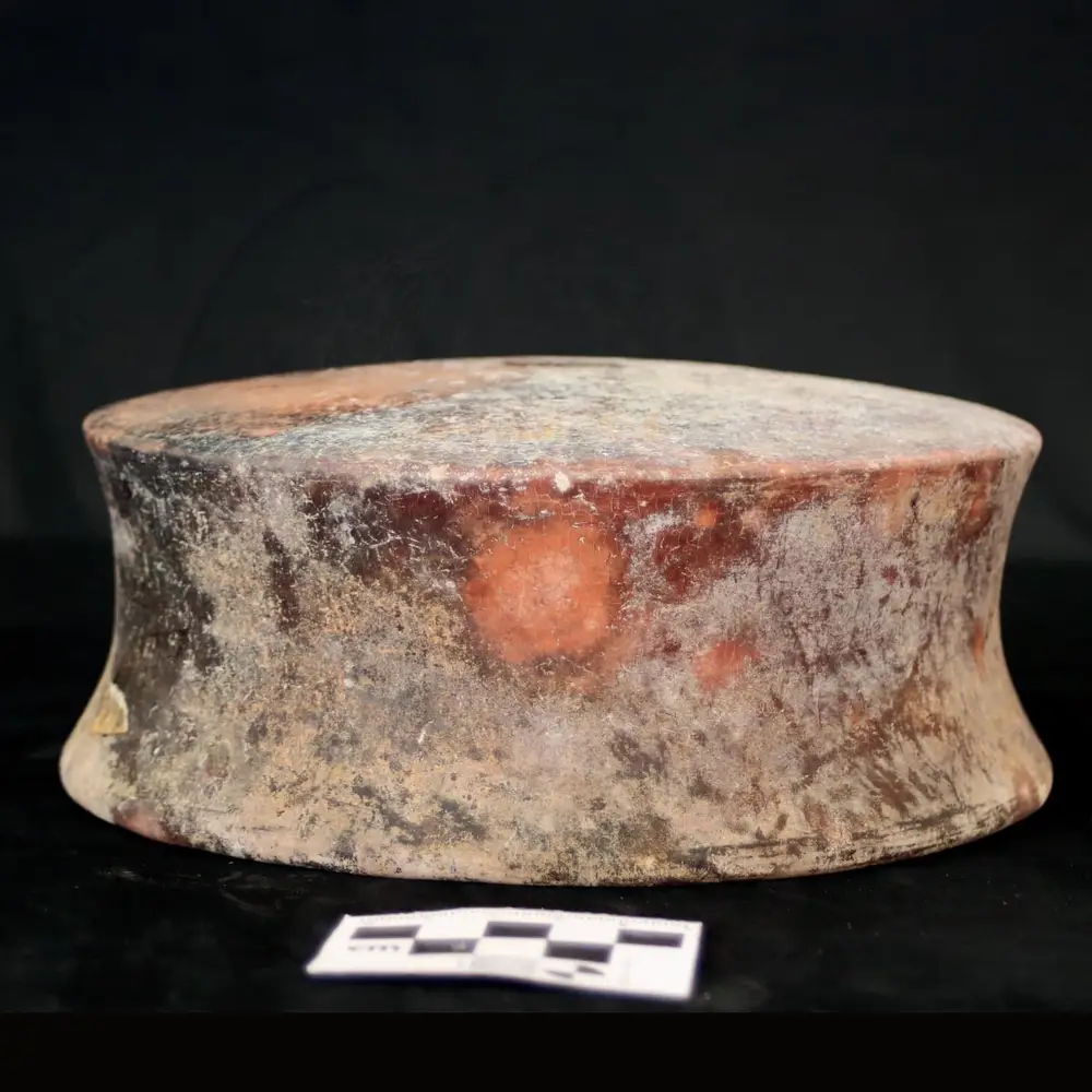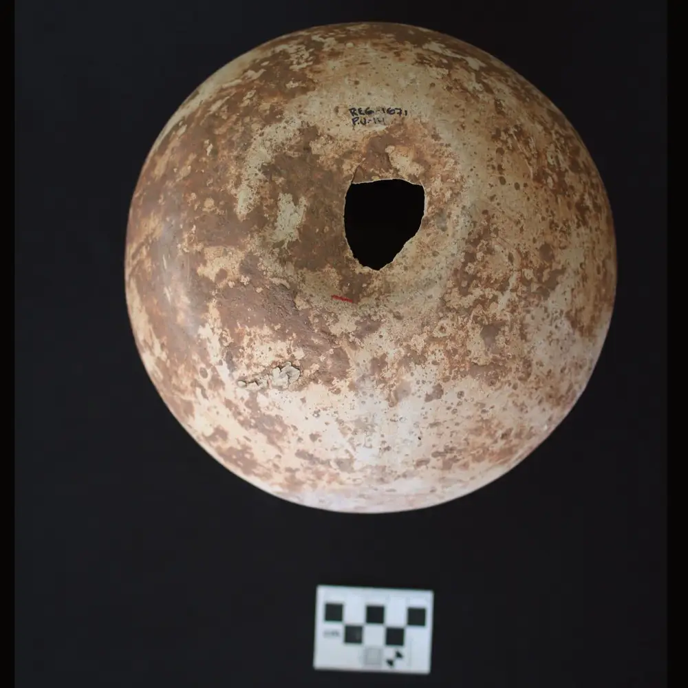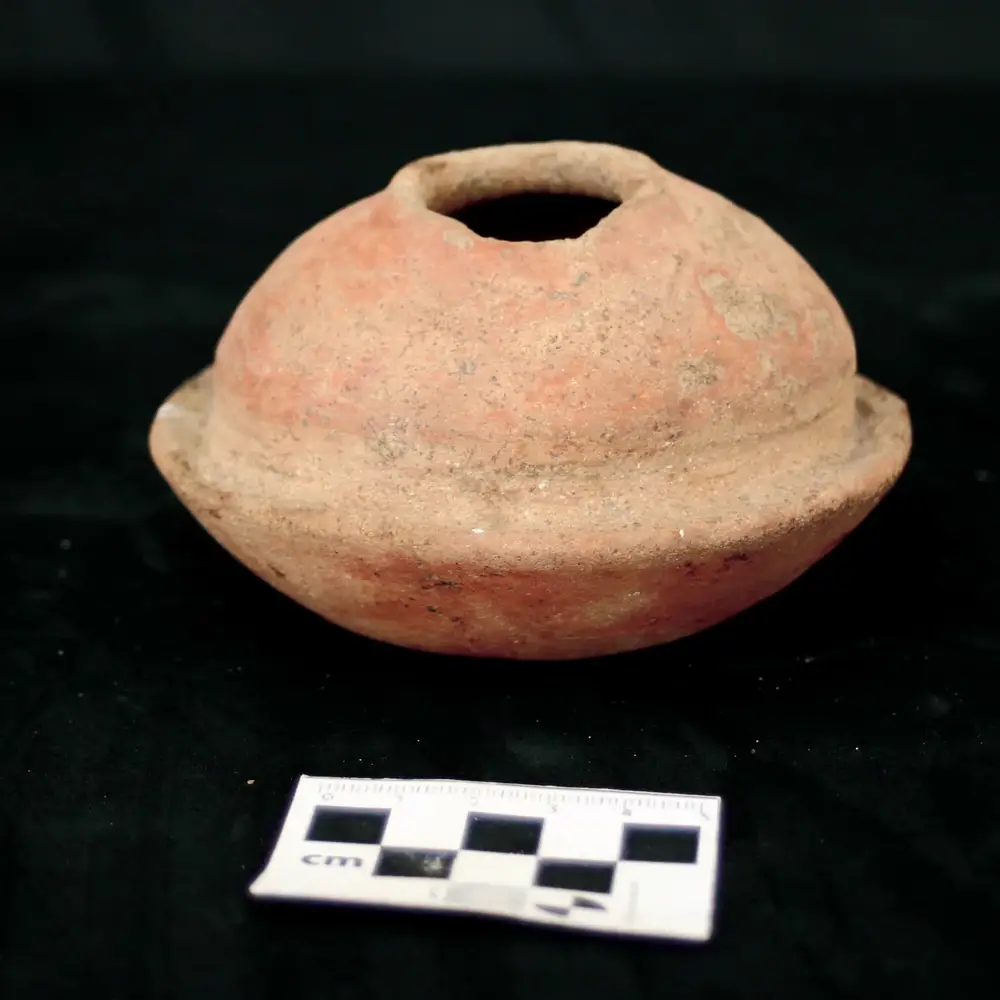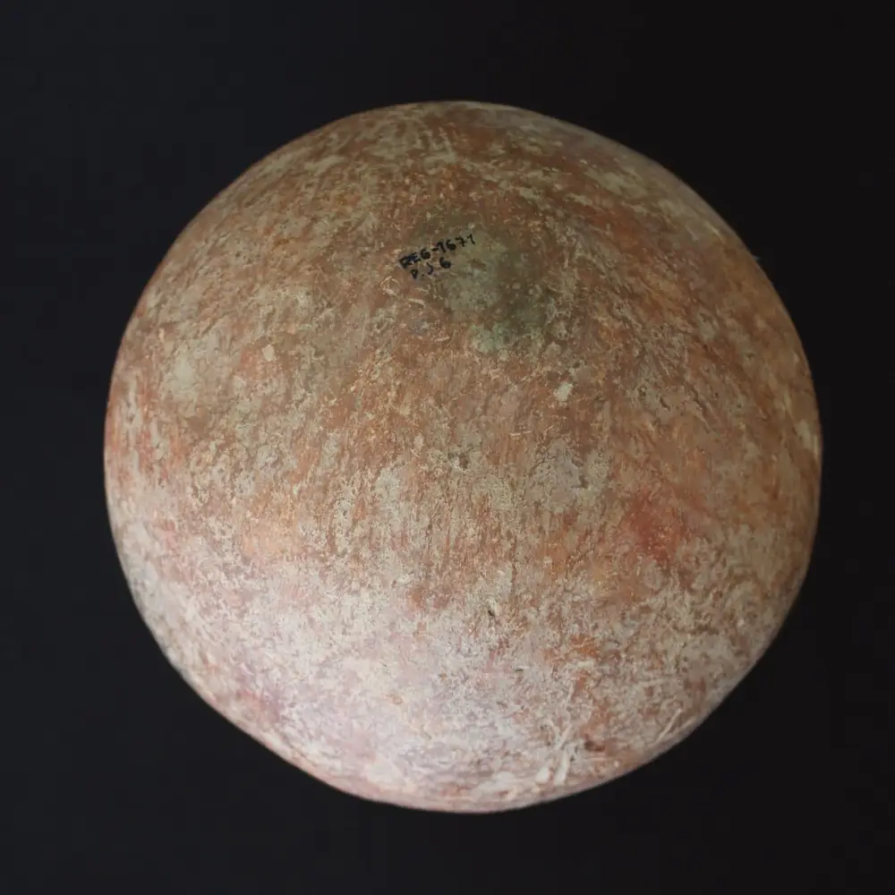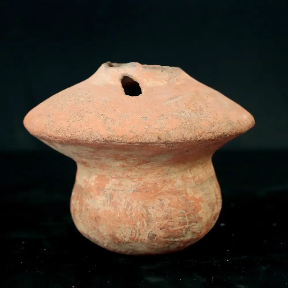 Sahumador sonaja. Vista inferior. El mango del sahumador tiene varias perforaciones pequeñas, está quebrado de su extremo donde se aprecia que es hueco y que contiene varios percutores de cerámica que lo hacen funcionar como sonaja. La parte inferior de la cazoleta presenta una decoración de pintura roja sobre bayo formando una banda con puntos y motivos de “cruces” que ha sido identificado como la Cruz de Quetzacóatl o el Quincunce. La parte inferior de la cazoleta tiene una perforación en forma de cruz par la ventilación.
