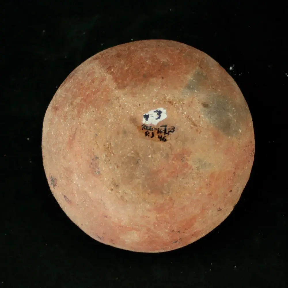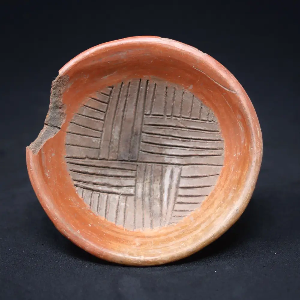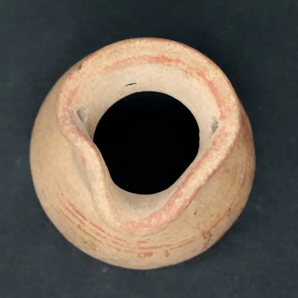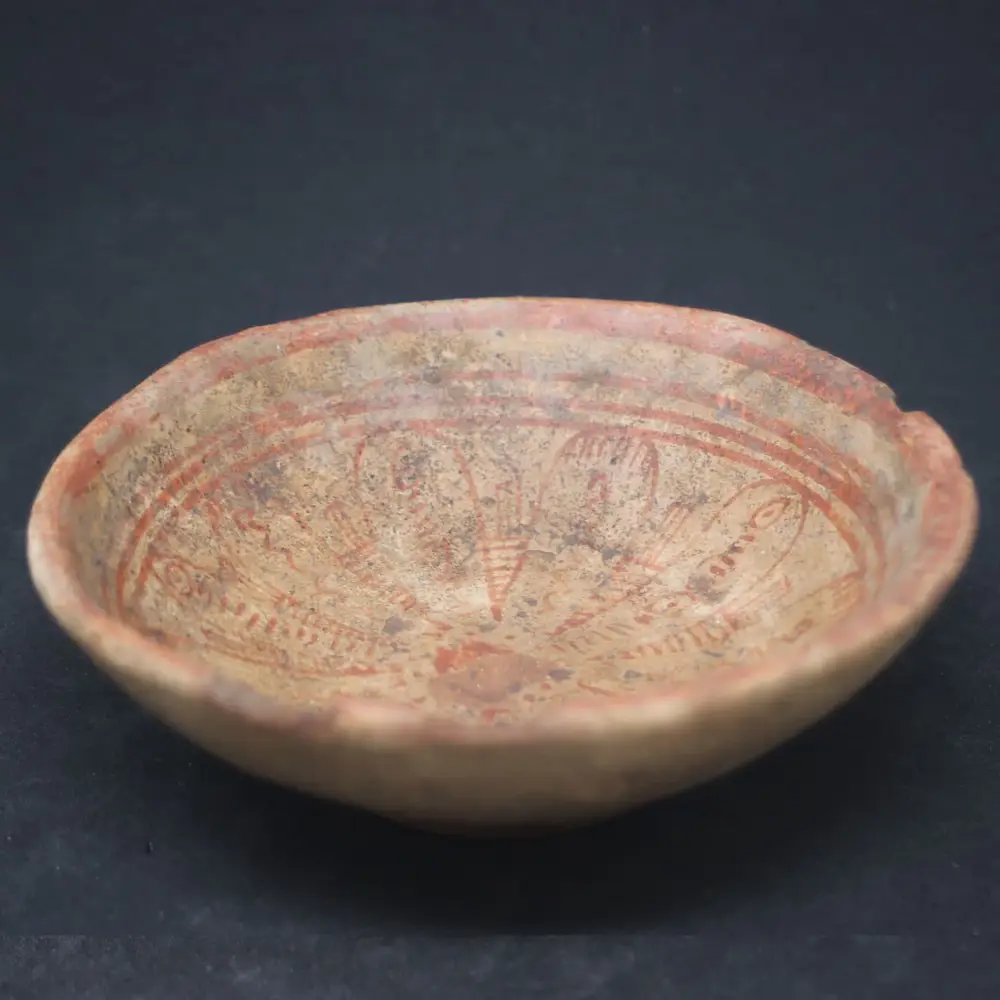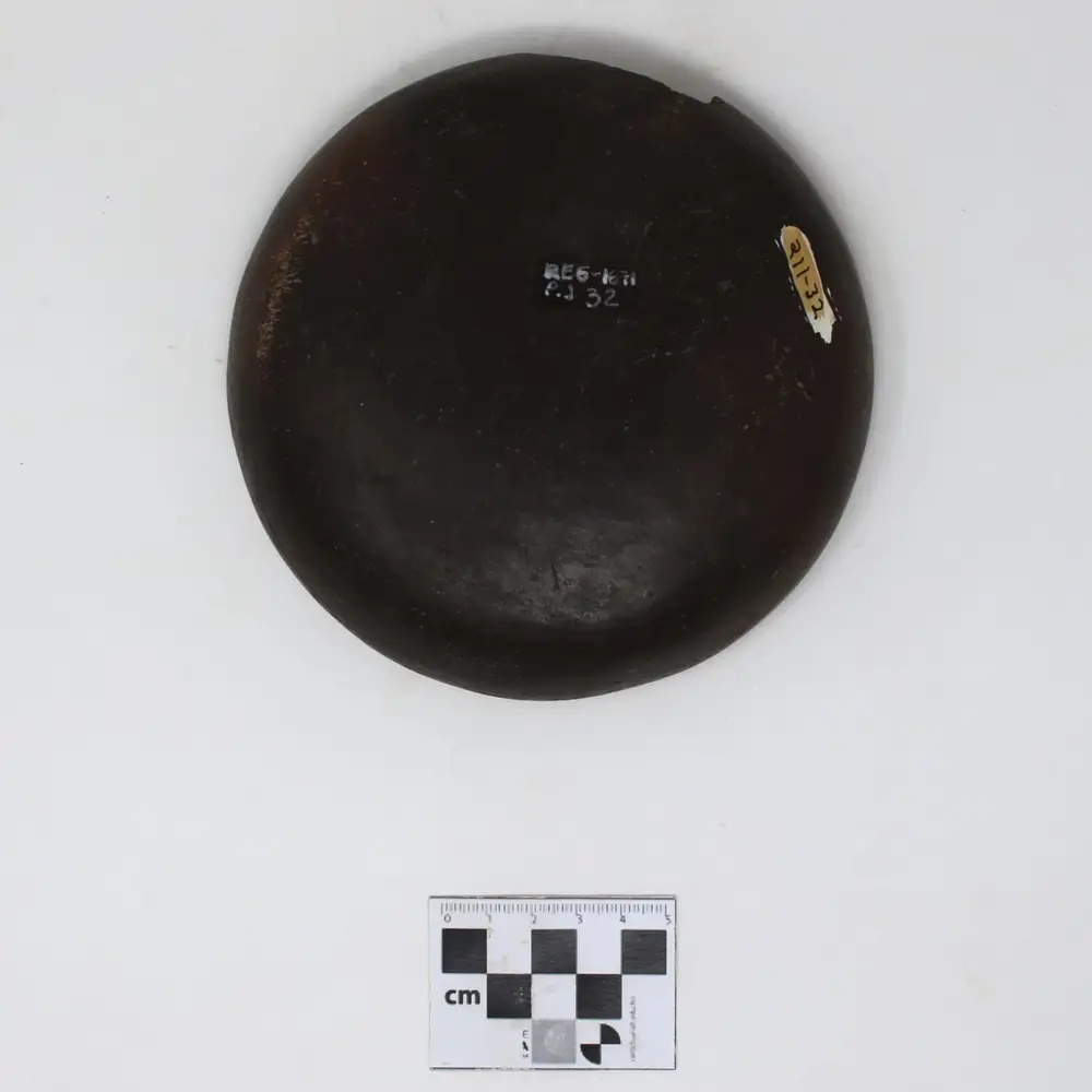 Sahumador sonaja. Vista inferior. El mango del sahumador tiene varias perforaciones pequeñas, está quebrado de su extremo donde se aprecia que es hueco y que contiene varios percutores de cerámica que lo hacen funcionar como sonaja. La parte inferior de la cazoleta presenta una decoración de pintura roja sobre bayo formando una banda con puntos y motivos de “cruces” que ha sido identificado como la Cruz de Quetzacóatl o el Quincunce. La parte inferior de la cazoleta tiene una perforación en forma de cruz par la ventilación.