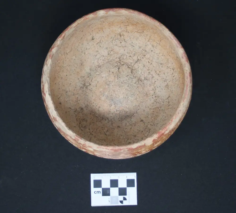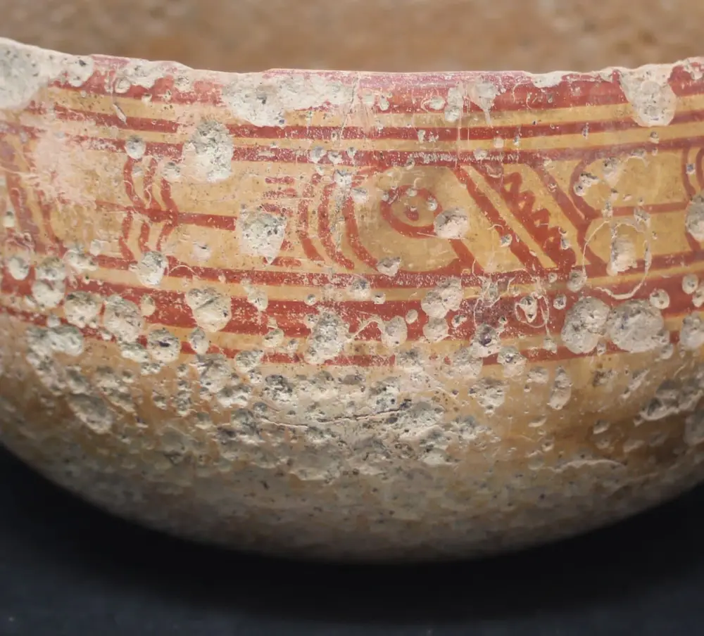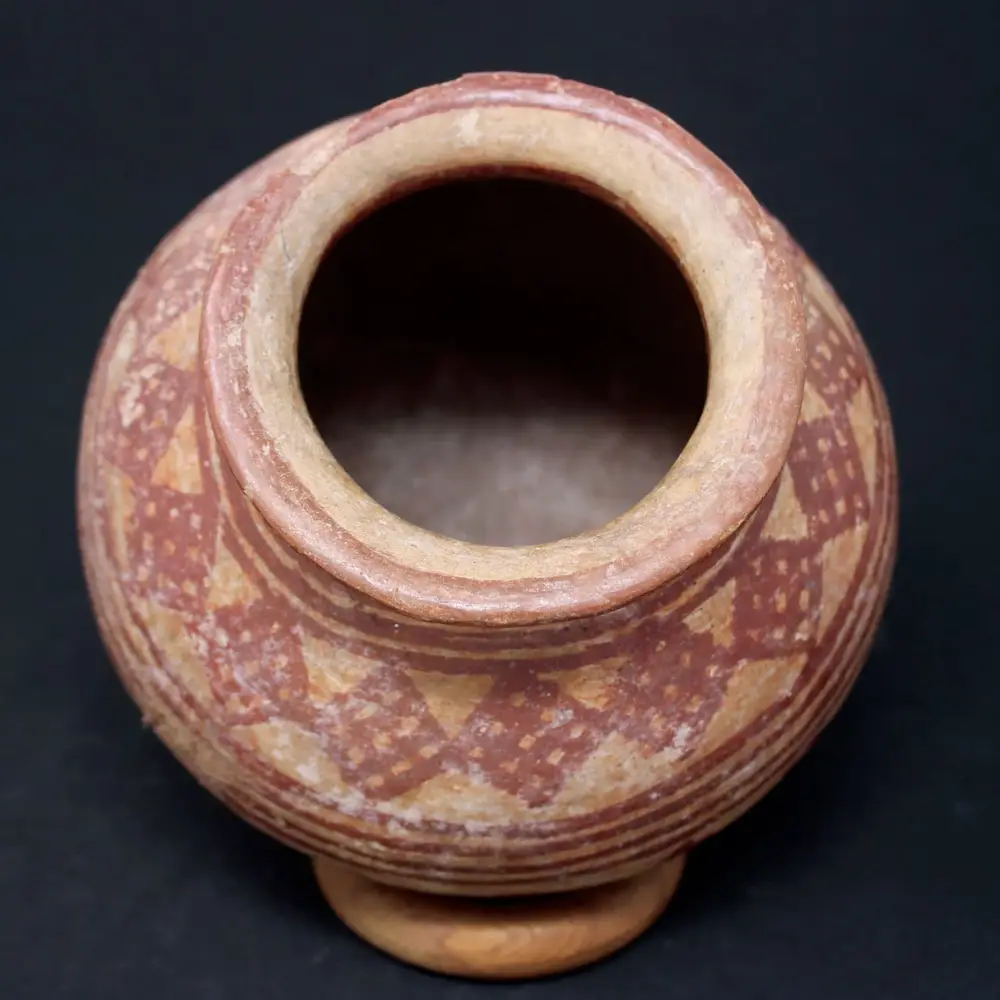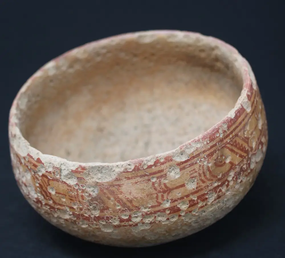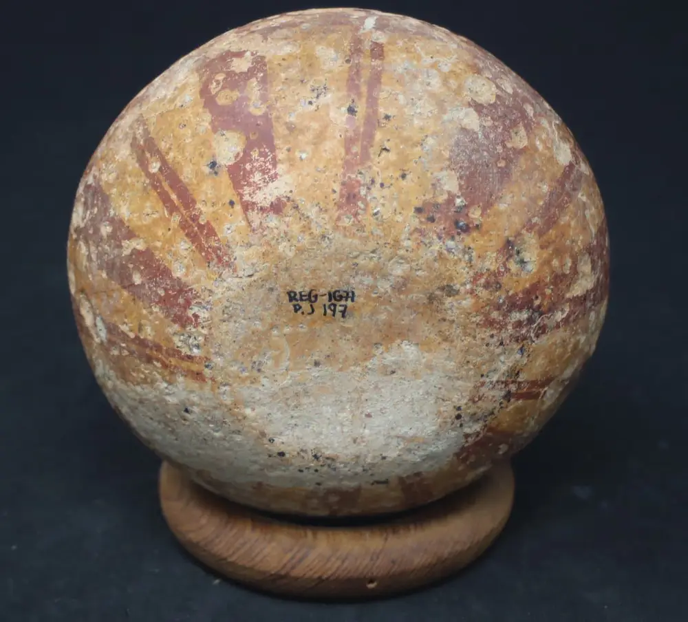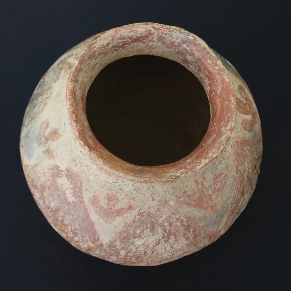 Sahumador sonaja. Vista inferior. El mango del sahumador tiene varias perforaciones pequeñas, está quebrado de su extremo donde se aprecia que es hueco y que contiene varios percutores de cerámica que lo hacen funcionar como sonaja. La parte inferior de la cazoleta presenta una decoración de pintura roja sobre bayo formando una banda con puntos y motivos de “cruces” que ha sido identificado como la Cruz de Quetzacóatl o el Quincunce. La parte inferior de la cazoleta tiene una perforación en forma de cruz par la ventilación.