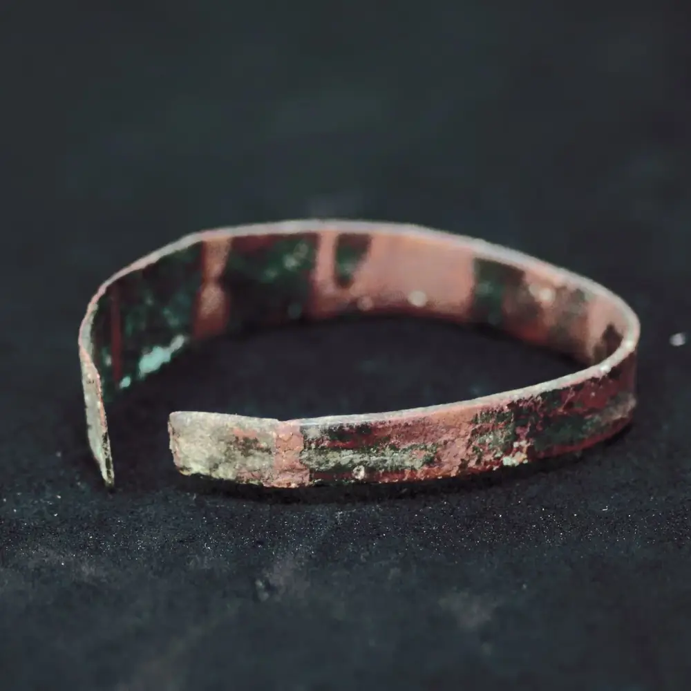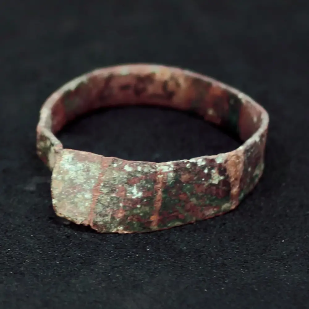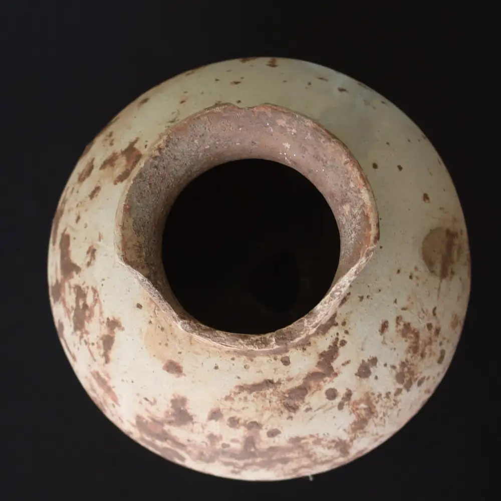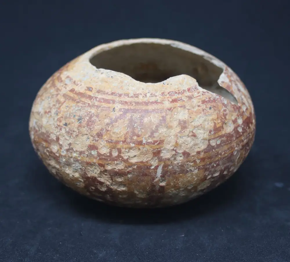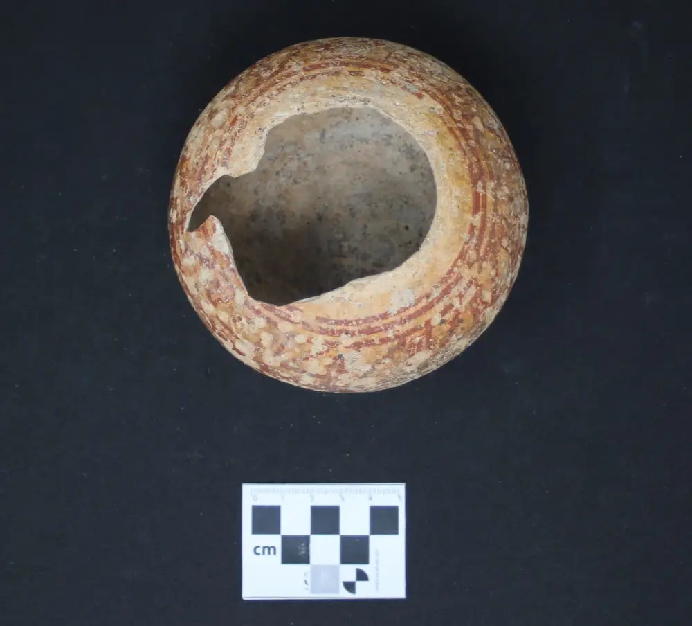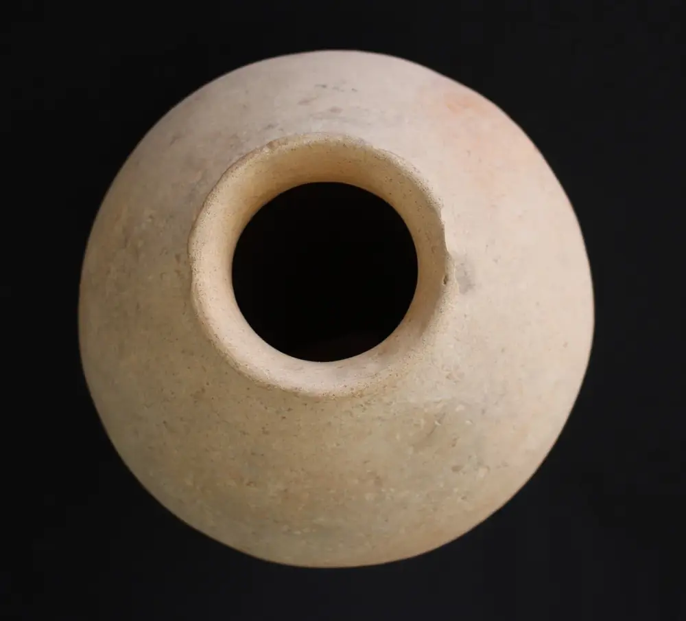 Sahumador sonaja. Vista inferior. El mango del sahumador tiene varias perforaciones pequeñas, está quebrado de su extremo donde se aprecia que es hueco y que contiene varios percutores de cerámica que lo hacen funcionar como sonaja. La parte inferior de la cazoleta presenta una decoración de pintura roja sobre bayo formando una banda con puntos y motivos de “cruces” que ha sido identificado como la Cruz de Quetzacóatl o el Quincunce. La parte inferior de la cazoleta tiene una perforación en forma de cruz par la ventilación.