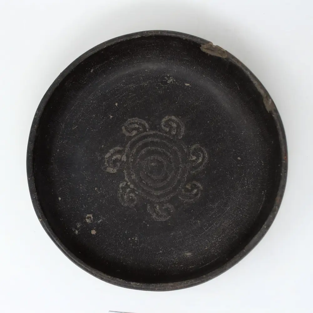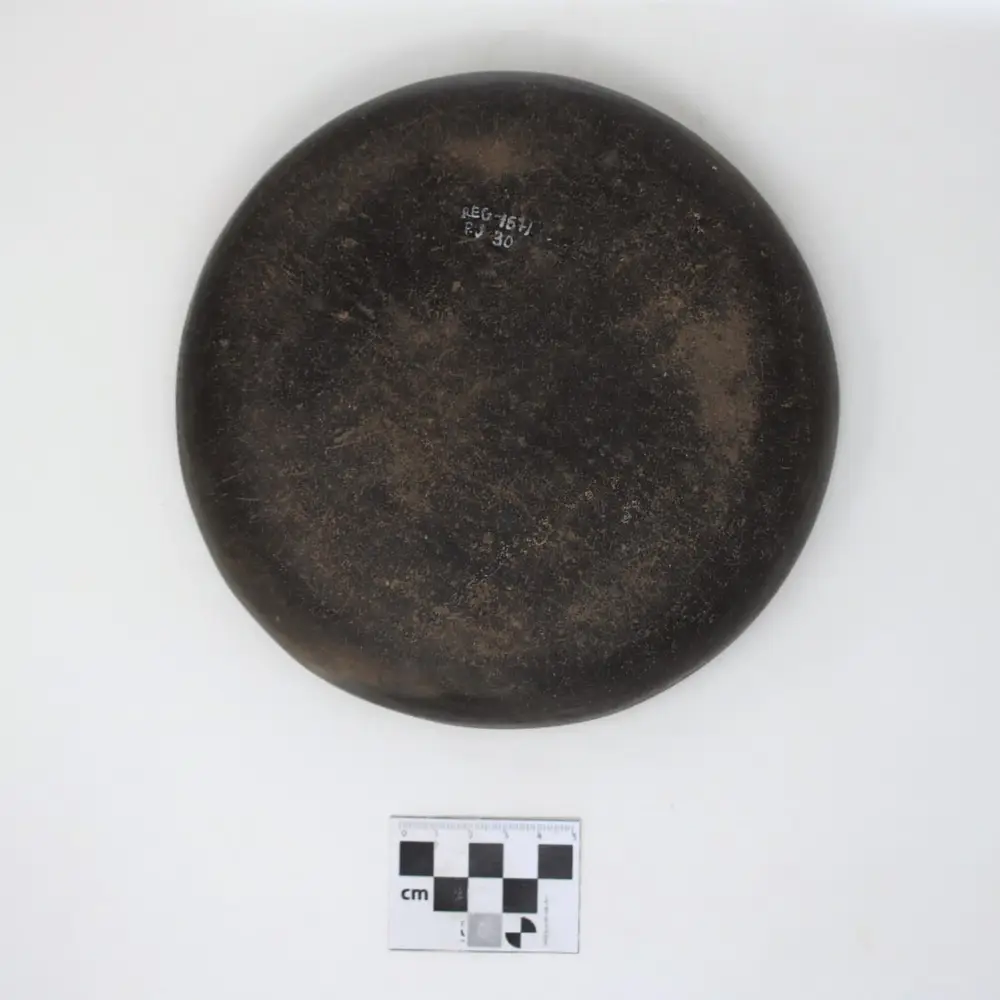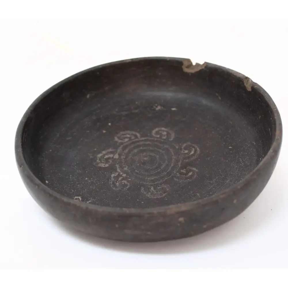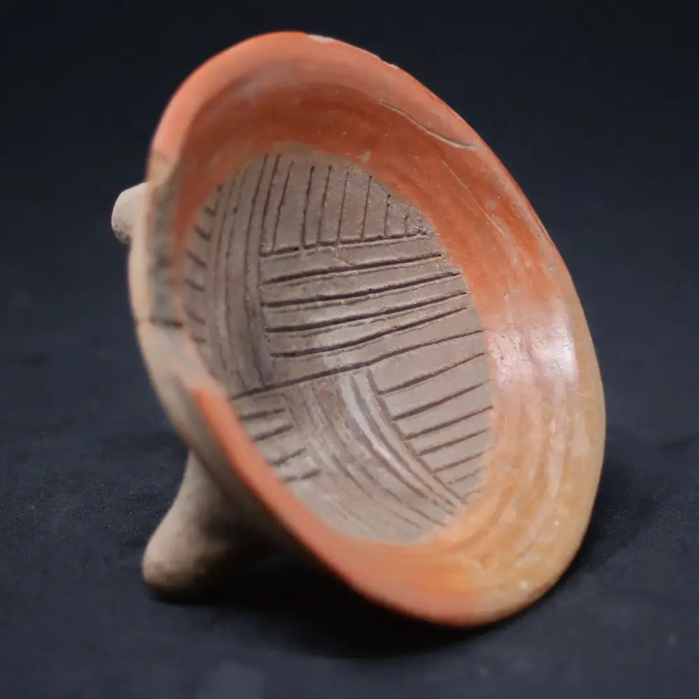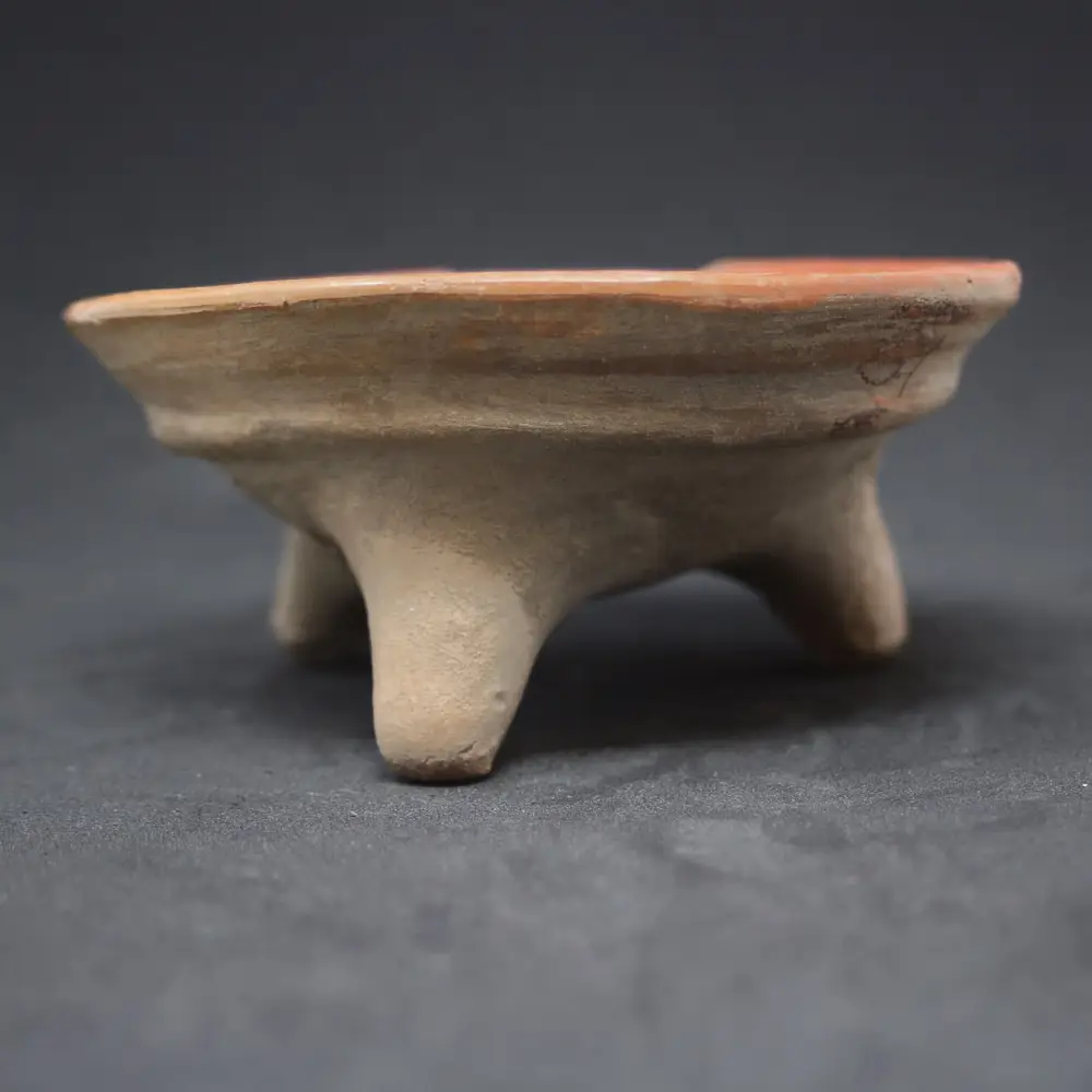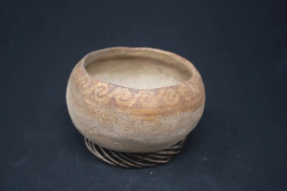 Cuenco base pedestal. Cerámica hecha con la técnica de molde, incisión y pintura. Mide 7 cm de alto y 15 cm de ancho. Proviene de la colección Escuela Teresa Barba (REG – 1671 PJ 36). Asociado a la fase Aztatlán (900 – 1200 d.C.). Cuenco con el fondo inciso (molcajete) de base pedestal el cual presenta una decoración en color negro sobre fondo crema. La pintura consiste en una línea sobre el borde exterior y una banda de líneas paralelas en la parte interna que enmarca un patrón de motivos en “s” acostada.