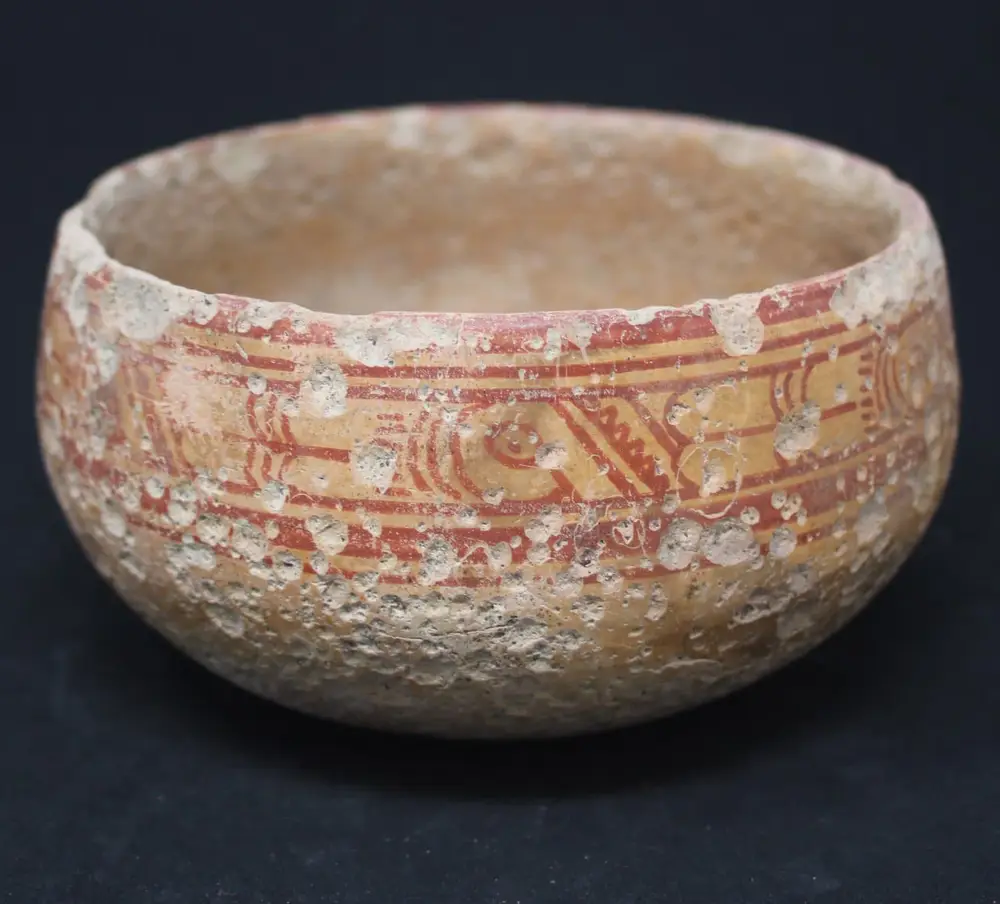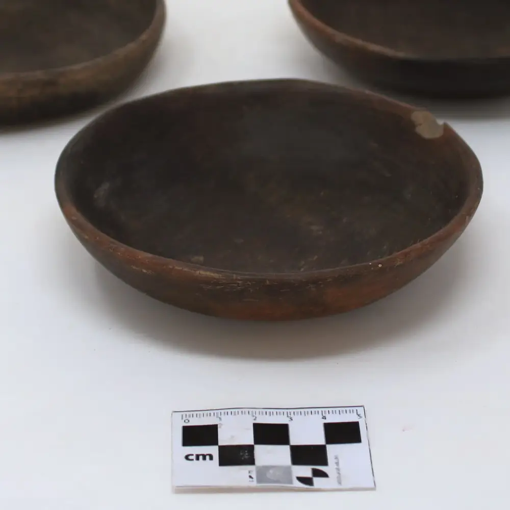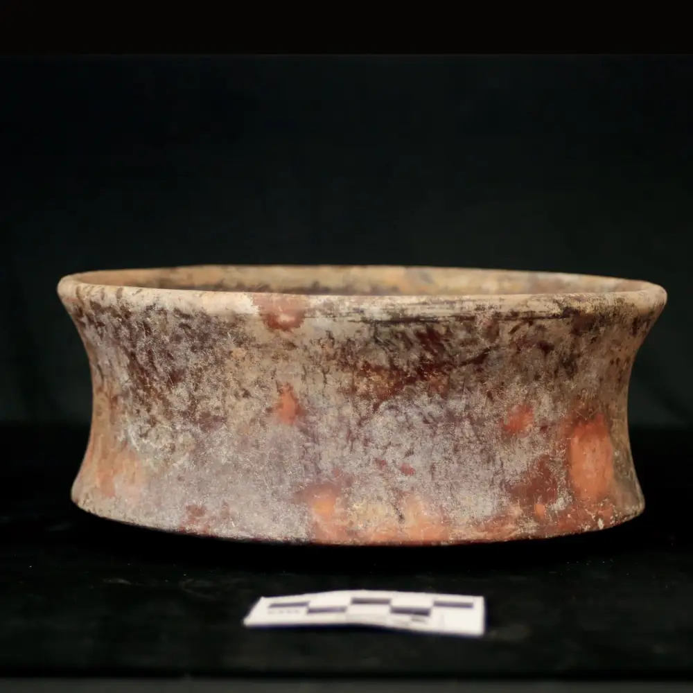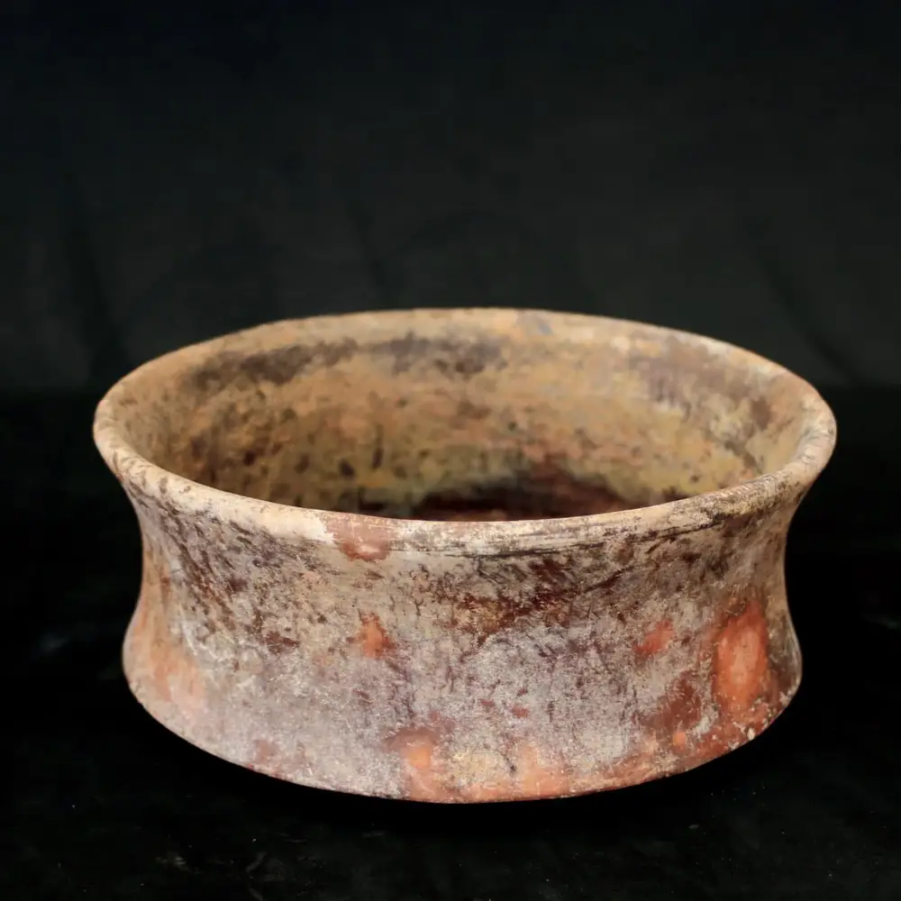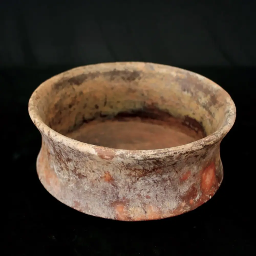 Cuenco base pedestal. Cerámica hecha con la técnica de molde, incisión y pintura. Mide 7 cm de alto y 15 cm de ancho. Proviene de la colección Escuela Teresa Barba (REG – 1671 PJ 36). Asociado a la fase Aztatlán (900 – 1200 d.C.). Cuenco con el fondo inciso (molcajete) de base pedestal el cual presenta una decoración en color negro sobre fondo crema. La pintura consiste en una línea sobre el borde exterior y una banda de líneas paralelas en la parte interna que enmarca un patrón de motivos en “s” acostada.