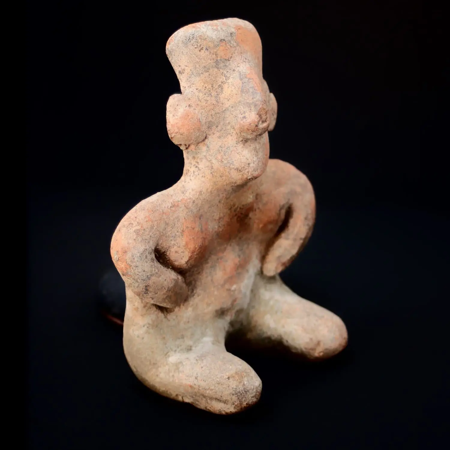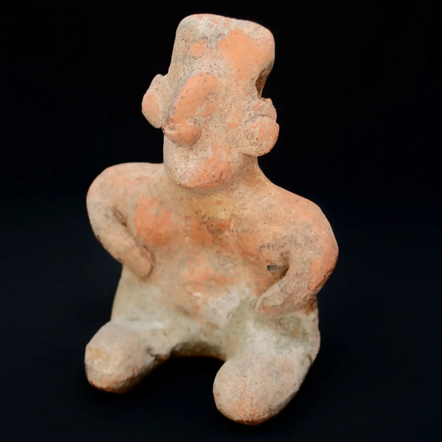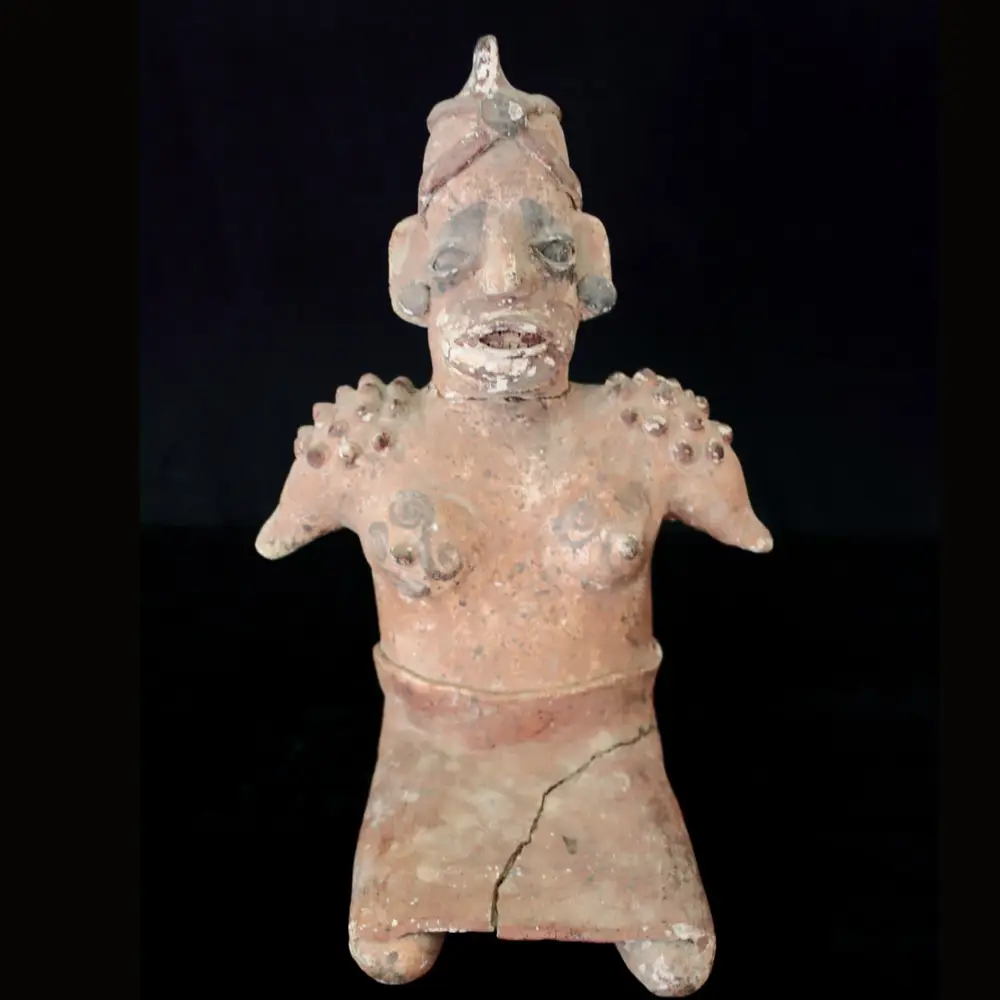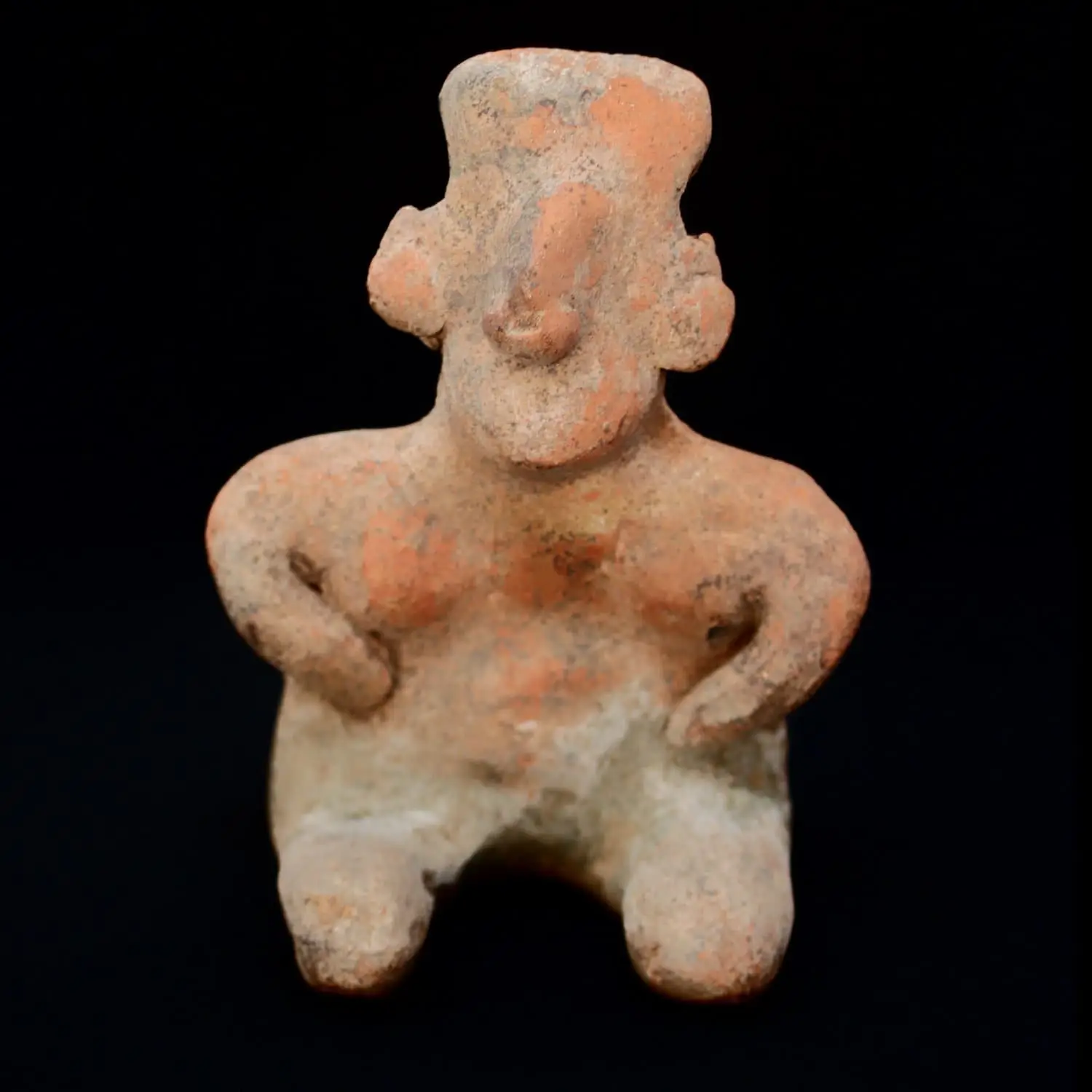 Figurilla hueca. Vista frontal. Cerámica hecha con la técnica de barro modelado, inciso, pastillaje y pintado. Mide aproximadamente 25cm de altura por 13cm de ancho y 19cm de fondo. Proviene del sitio La Pedrera ubicado en una loma de la calle Costa Rica en colonia Emiliano Zapata (Mountjoy 2003: PV-28). Asociado a la fase Amparo (300a.C. – 300d.C.). Figurilla femenina en posición sentada la cual perteneciente a la tradición Tumba de Tiro de estilo llamado “Chinesco” de Nayarit. Presenta deformación craneal, orejeras y nariguera de concha, porta cinturón y lleva pintura facial y corporal.